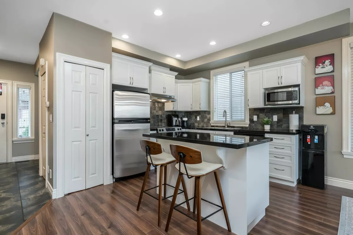 Rarely available reverse floor plan home in the heart of Clayton, built by Italian builder MOSCONE! Features a gourmet kitchen with freshly painted cabinets, granite counters and stainless steel appliances, plus an open-concept main floor with a den. New composite decking backs onto the Katzie Greenway greenbelt. The primary bedroom offers a walk-in closet and a spa-like ensuite with separate tub and shower. New flooring in both upstairs bathrooms. One-bedroom basement suite with separate entry and own laundry. Detached coach home also has private laundry. In Katzie Elementary and Clayton Heights Secondary catchment.