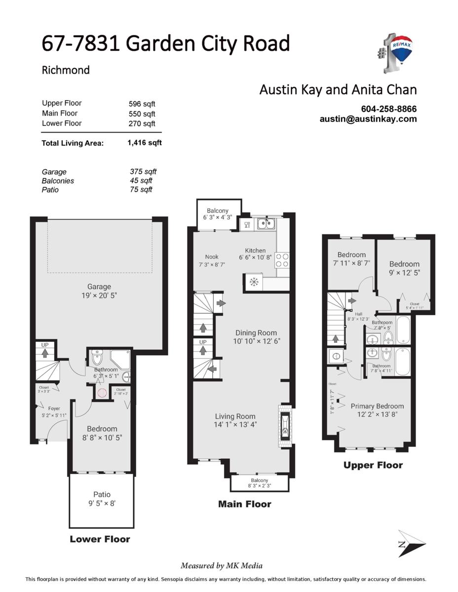 This super bright and clean 4 bedroom townhome offers 3 FULL bathrooms & the coveted side x side double garage. With 1416 SF of spacious living, this great home features brand new laminate floors on all 3 levels, fresh paint, bright kitchen with eating area, cozy gas fireplace, insuite laundry, 2 balconies and patio area. Excellent floor plan that includes 1 bedroom and full bath on the first floor – great for inlaws, teenagers, office or home business! All this in a great complex with low maintenance fees that include city utilities. Located just steps to the Garden City Shopping Mall with Save-On foods, Shoppers Drug Mart, restaurants, CIBC, coffee shops & more. Excellent location close to transit, parks, Palmer Secondary and Bridge Elementary. Pets & Rental Allowed. Ready to move in!