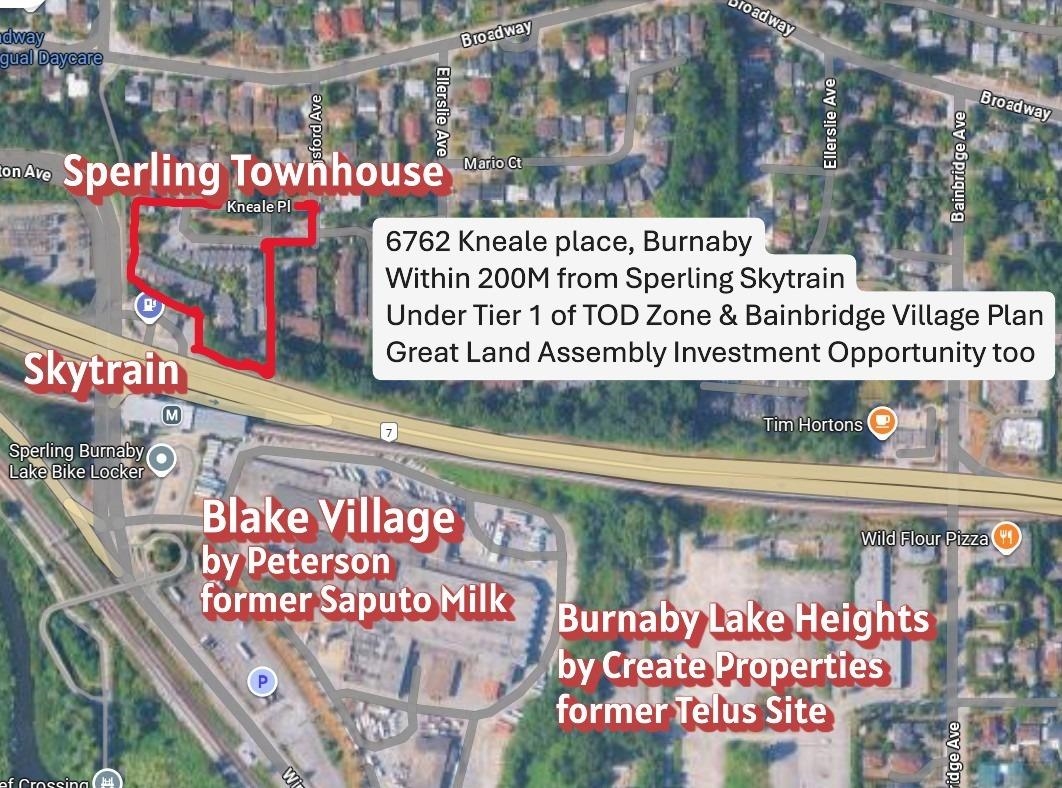 Investors Alert! The Sperling Townhouse where this unit sits is within 100 meters from Sperling Skytrain, under the Bainbridge Urban Village community Plan and BC legislation, Tier 1 of the Transit-Oriented Development (TOD) zone with a FAR of 5.0, allowing for a minimum 20-story building, maybe could be up to 30 story with certain conditions, rare development site. The complex (31 homes) is expected to be sold to a developer via strata wind-up process. This home has 3-levels, over 2000 SF, 4 beds 3 baths, corner unit, low strata fee, walking distance to Sperling Skytrain, Burnaby Lake, Bill Copeland Sports Center, top school Sperling elementary and Bus 110,134 & 144 (SFU/Metrotown), close to SFU, Brentwood, Lougheed & Metrotown Malls. Rare opportunity to make it yours.