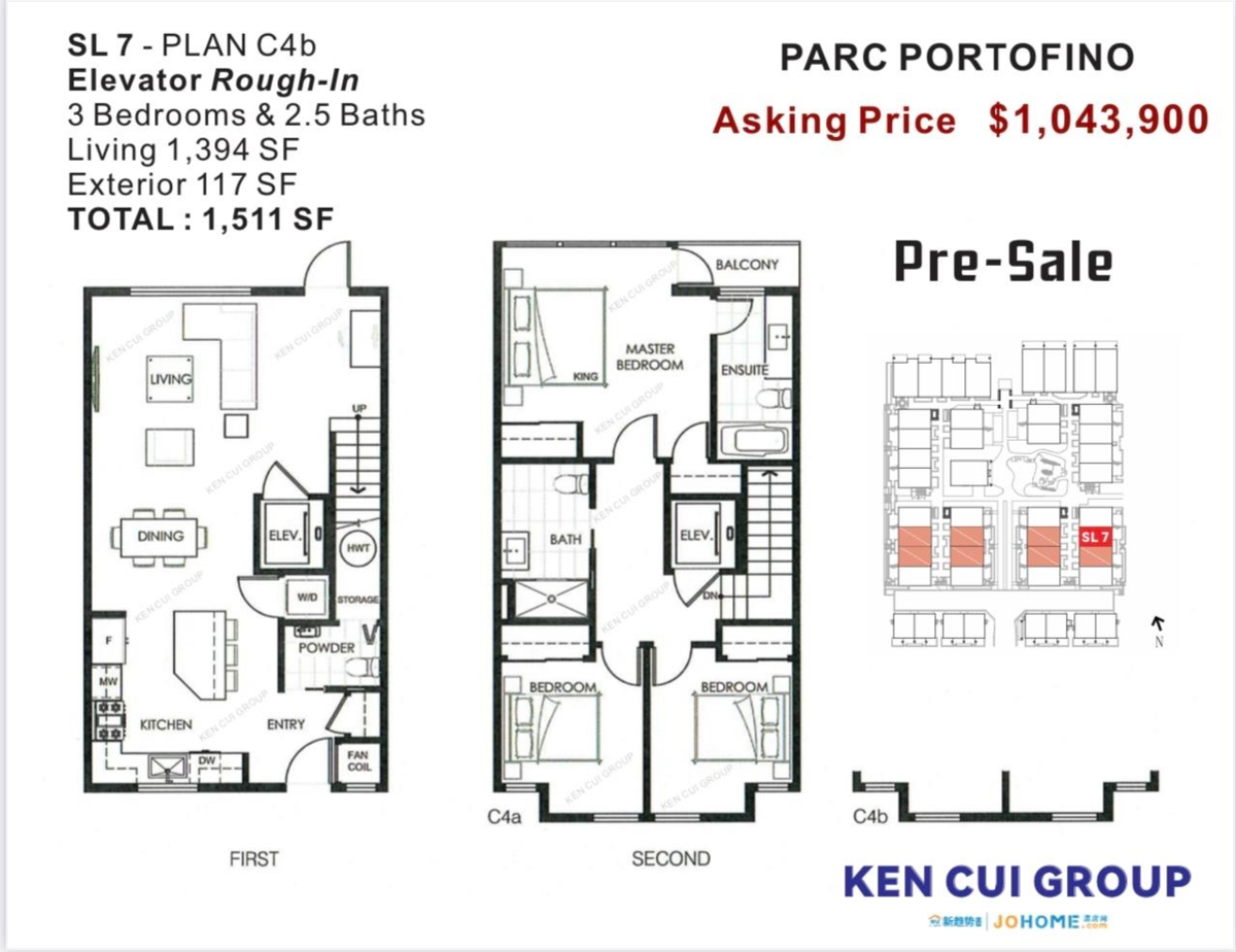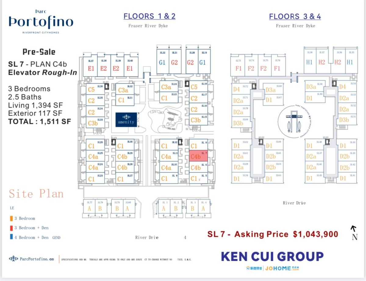 Parc Portofino PRESALE Riverfront Townhome built by DAVA Developments - Completion in Late 2024. This ground level home is 1 of the only 2 C4b plans units in this development with Rough-in Elevator facilities design. INNOVATIVE Design, open functional floorplan with air-conditioning, 9'ceilings in Living Room. 3 Bdrms & 2.5 Bathrms. Laminate flooring, high-gloss kitchen cabinetry with modern design & Quartz countertop. Main floor laundry/storage room. Secured 2 parking spots and outdoor patios. There is direct access to 4000 SF of Dyke trails walking/biking. Close to the Bridgeport station for easy access to the Canada Line. "Variety of different floorplan available, spacious 3 to 4 Bdrms units" Call today for more information.
