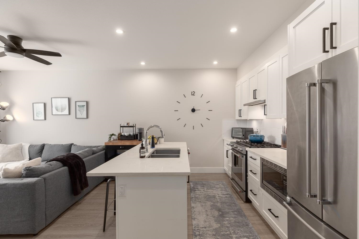Welcome to Berkeley Village, nestled in one of the best locations in South Surrey! This bright & stylish 2 bed + Den, 2.5 bath home offers an open-concept main floor w/ 9’ ceilings, oversized windows, & a sleek kitchen feat. S/S appliances, gas range, & a large island. Upstairs are 2 spacious bdrms, incl. a primary suite w/ walk-in closet & spa-inspired ensuite. Private 500 sq. ft. rooftop deck oasis w/ unobstructed S & W views- perfect for relaxing year-round. Also feat. side-by-side double garage, powder room & versatile Den on the main. The community boasts over 6,000 sq. ft. of amenities- gym, guest suite, lounge, & playground. Conveniently located steps from new elementary school Ta'talu, Grandview shops, Aquatic Centre, White Rock Beach and Hwy 99. OPEN HOUSE SUNDAY, FEB. 1, 2-4.
