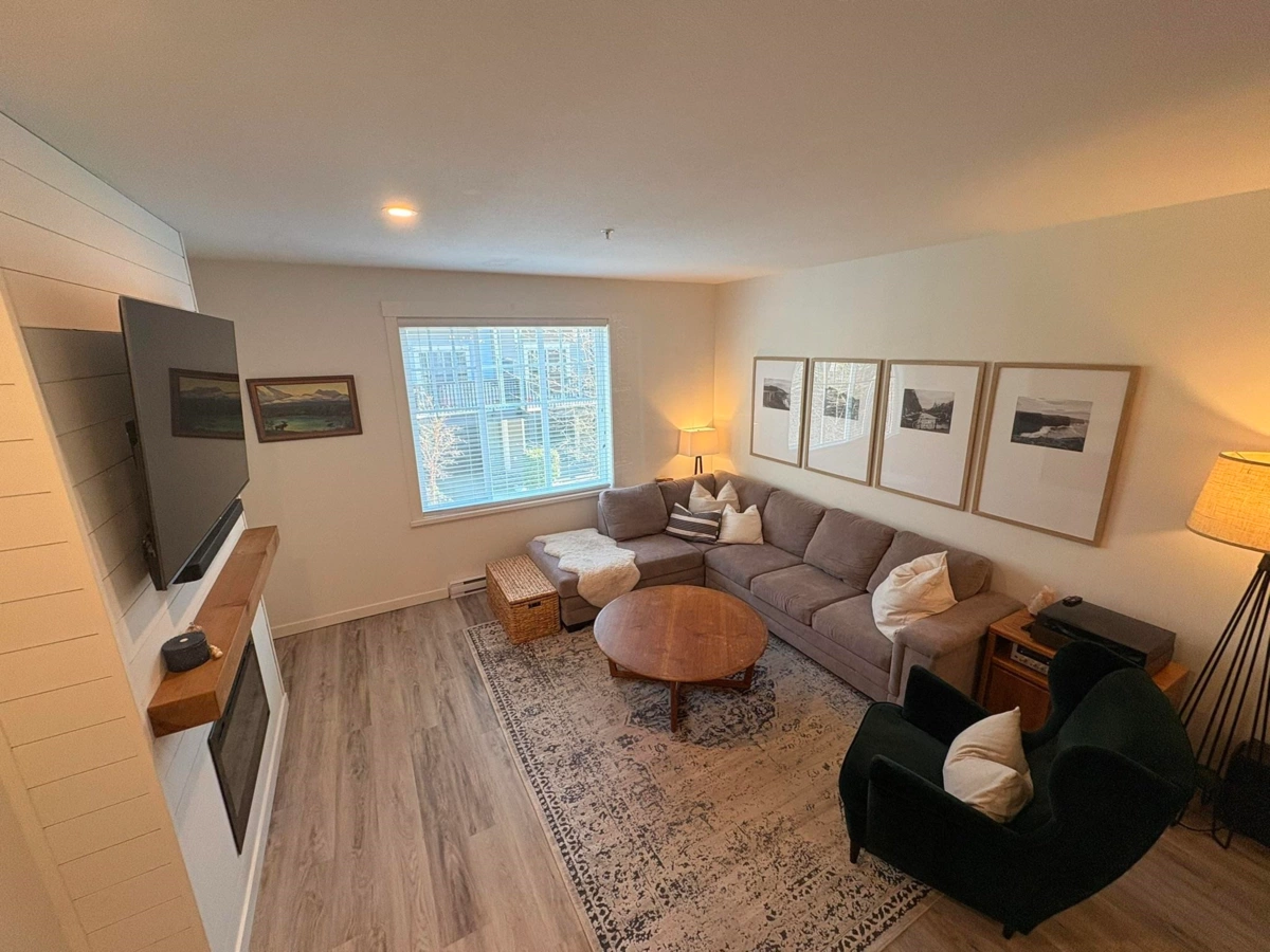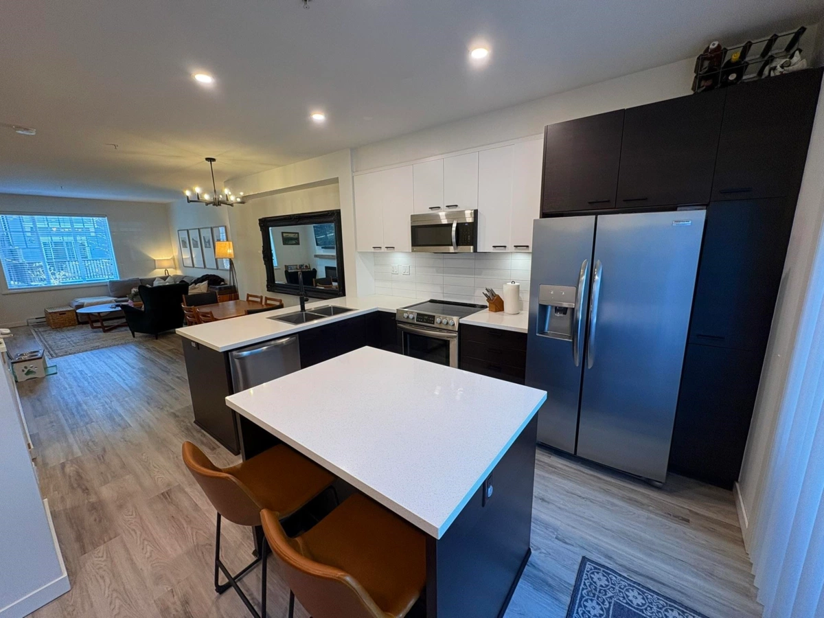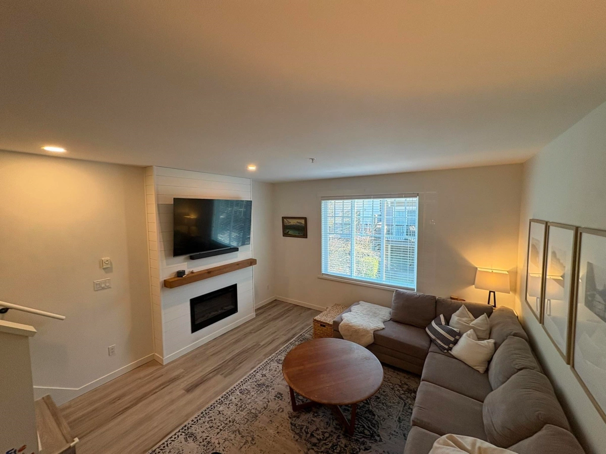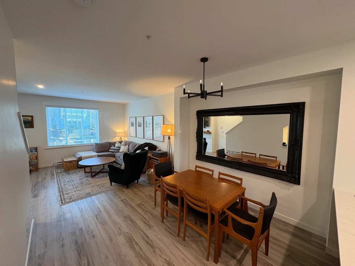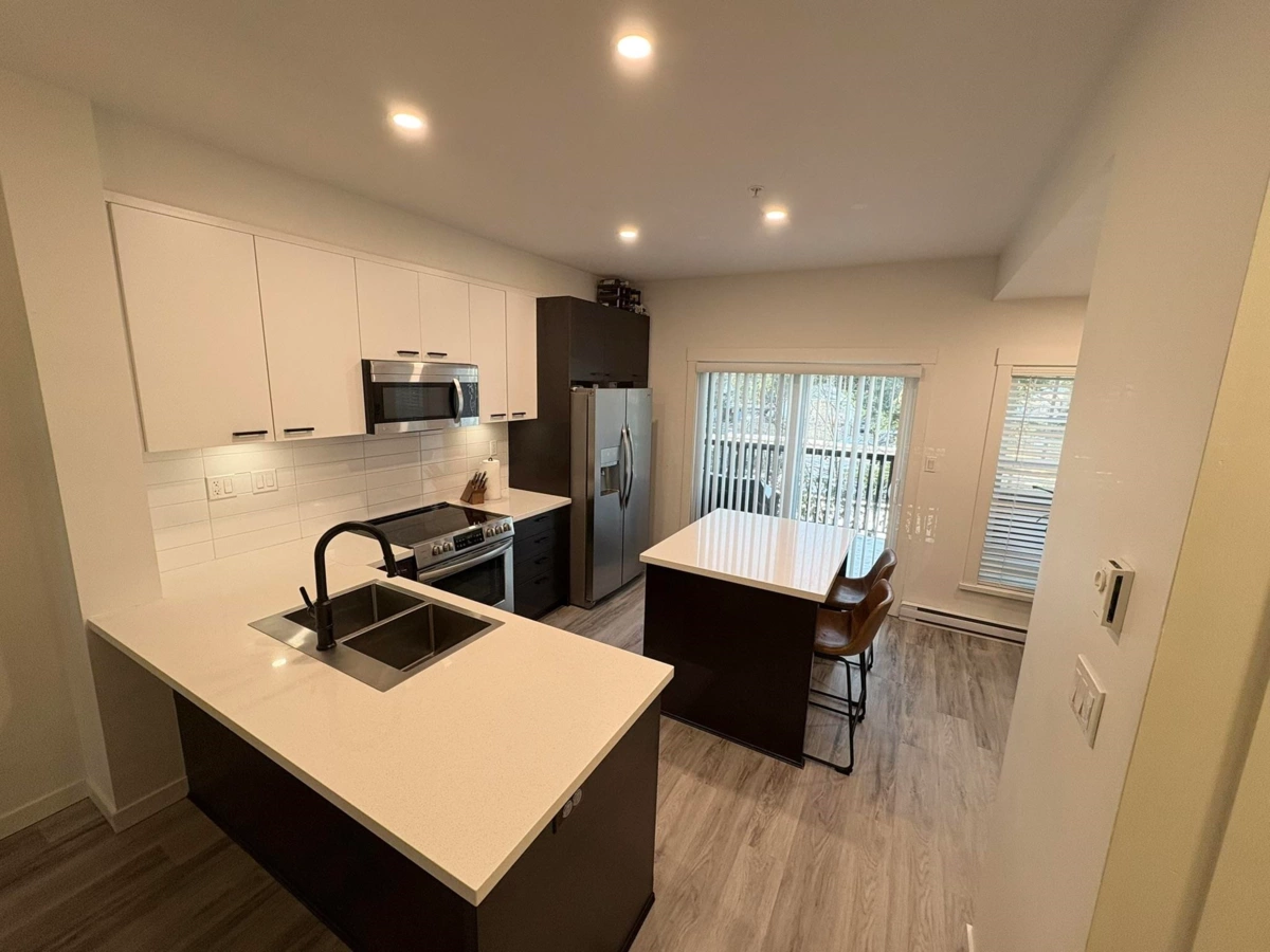 Quality townhouse built in 2011 by MOSAIC Homes. Family friendly complex & excellent location just steps away to the Coquitlam River & amazing trails. Close to shopping, restaurants & transit (walking distance to the West Coast Express & Evergreen Line). Newly replaced luxury grade vinyl plank flooring, updated lighting throughout, freshly painted, open concept gourmet kitchen with quartz counter tops and new stainless steel appliances, new backsplash, built in fireplace recently replaced & large sundeck. Brand new washer dryer combo. Updated shower. Two large bedrooms and 2 full bathrooms upstairs. Downstairs has a tandem garage large and den space with access to the fenced back yard (new turf). Pet friendly complex. Measurements are approximate.