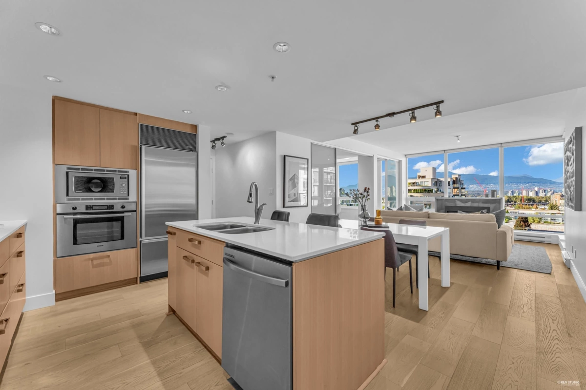 Welcome to Camera by Intracorp! Enjoy PANORAMIC VIEWS of the North Shore mountains and city & ocean views in this absolutely gorgeous 2 bed, 2 bath, plus flex/office unit. This spacious, bright suite features brand-new engineered hardwood floors, new paint throughout, full-size washer/dryer, high-end SS appliances, luxurious gas f/p, and a large master with spa-like ensuite with heated floors. Expand your living to the ideal office or outside to the large covered balcony. Other amenities include 2 underground parking spots, storage, bike room, social room with pool table and wet bar, exercise studio and a children's playground. Camera is a low-density building with only 77 homes and is conveniently just steps from beautiful Kitsilano and Granville Street. Welcome home!