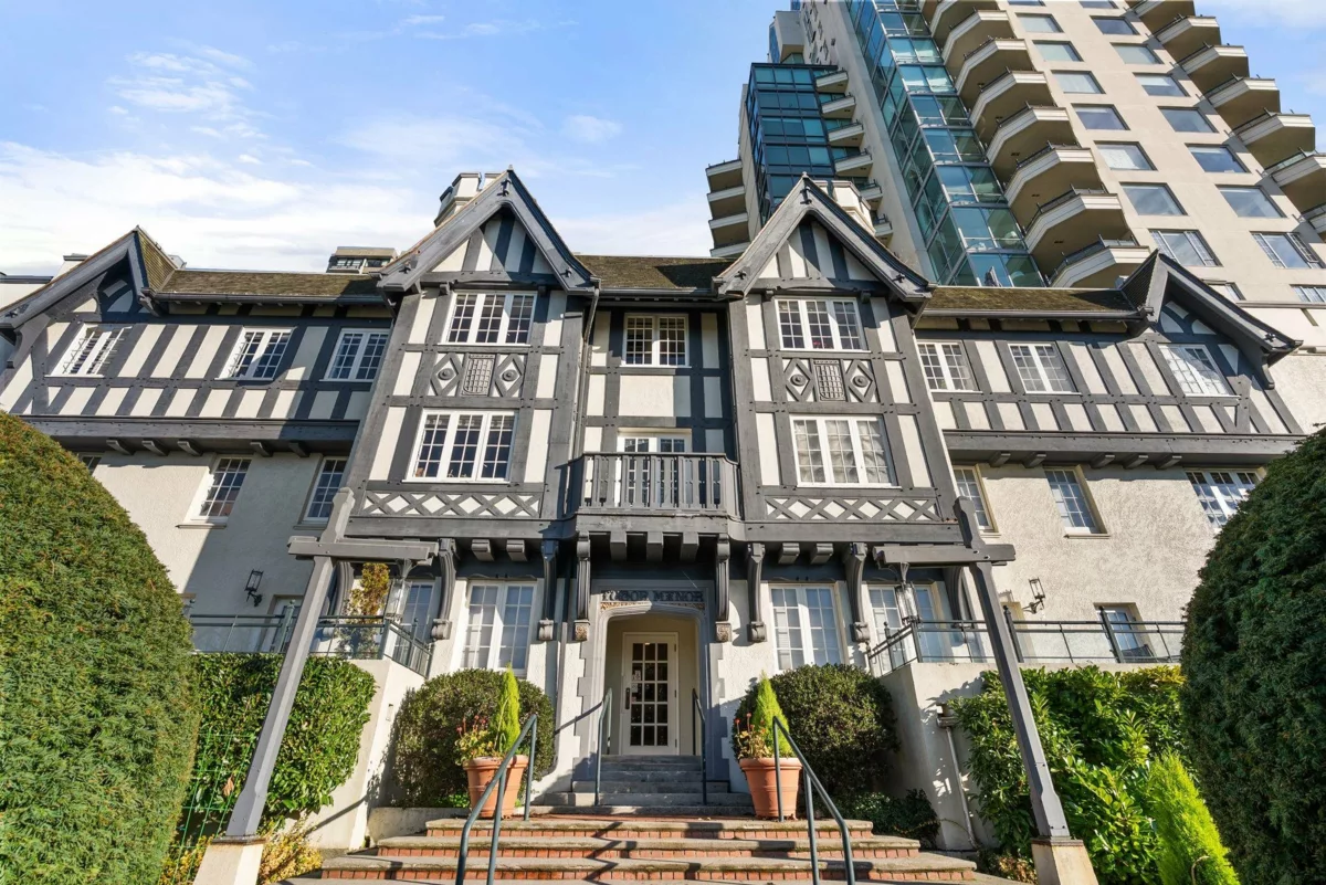 The iconic Tudor Manor on Beach Ave - a Vancouver landmark with its striking heritage facade & fabulous manicured gardens. This waterfront location at Sunset Beach offers forever ocean views. Enjoy breathtaking sunsets from the large balcony & every room of this suite. Offering 1-bedroom + spacious den (that easily functions as a 2nd bedroom), 1.5 bathrooms & quality updates throughout. Hardwood floors, thoughtfully renovated open plan kitchen & spa-inspired ensuite bath w/ separate tub & shower. These '02 suites are private, spacious, bright & have wonderful flow. Tudor Manor has 24-hour concierge for added convenience & security, fitness centre, an impressive lobby & a guest suite for your visitors to stay. Includes storage & 2 parking. Pets ok! EASY TO SHOW ANYTIME, BY APPOINTMENT.