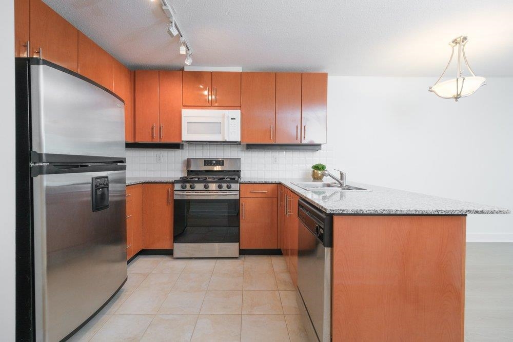 Newly renovated 1-bedroom + den urban haven located in the heart of Lower Lonsdale. With brand-new flooring, updated baseboards, and freshly painted, this unit is in move-in condition. It features an open-plan living area, an east-facing balcony with water views of the Port of Vancouver, a spacious bedroom, and a den that's perfect for a home office. Just steps from the Brewery District, the Shipyards, The Quay, and the area's fabulous restaurants and coffee shops. Experience a true urban lifestyle while being just 20 minutes from the outdoor amenities of the North Shore and a quick 15-minute Seabus commute to Downtown. Quick possession is available! One dog or cat allowed in building.