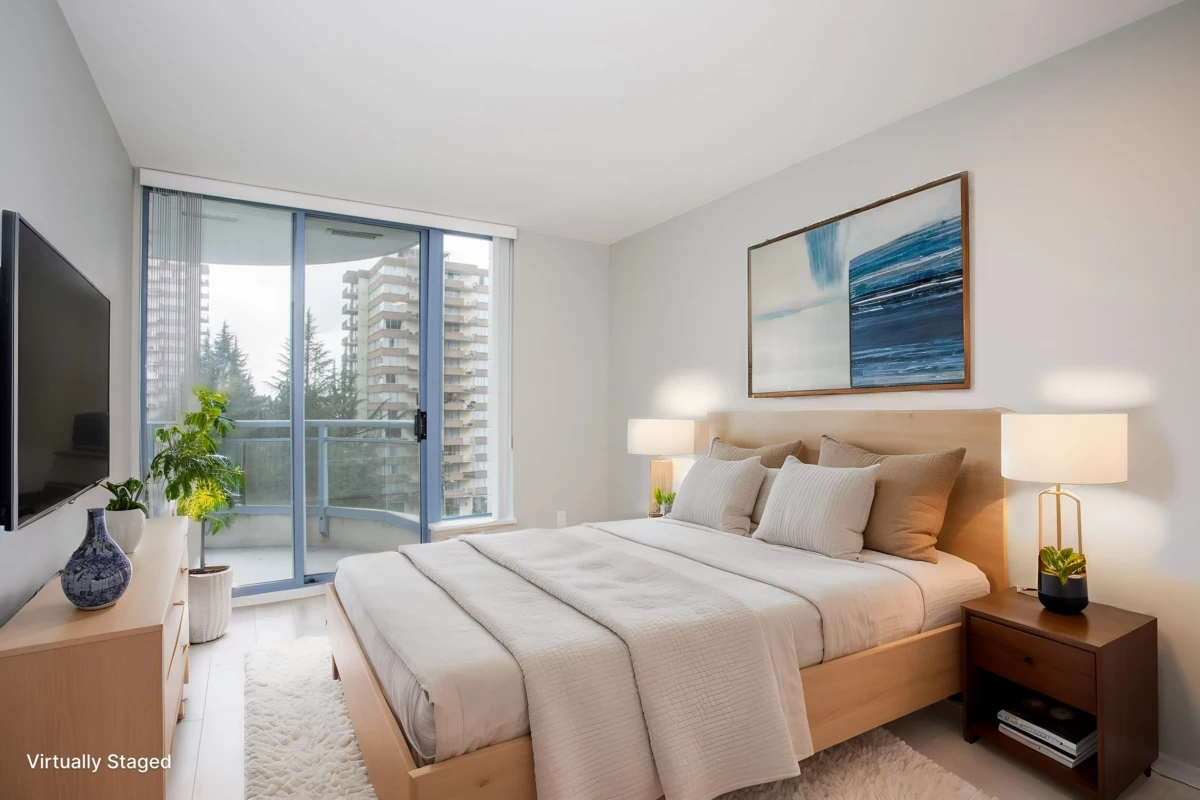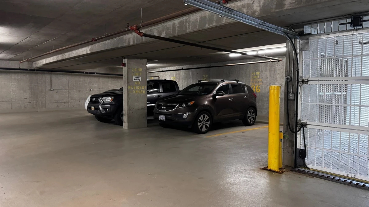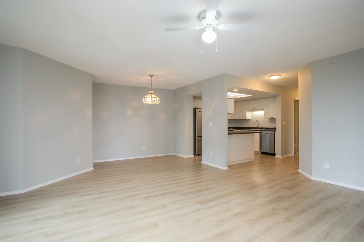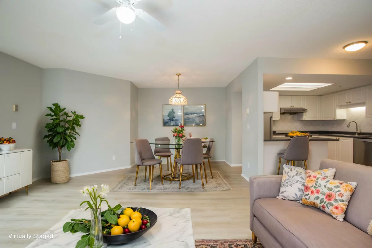 Stirling Place by Bosa! This bright 2 bed, 2 full bath, 2 balcony home has an updated kitchen with newer stainless steel appliances and newer laminate flooring. Large Primary has ensuite, and both bedrooms have sliding glass doors out a balcony. Spacious living room has a cozy gas fireplace (incl in maint fee!) and double sliding doors opening to another balcony. Dining room is open to the kitchen for easy entertaining. 1 large EV ready parking and full size secure locker. Exercise room and club room in lobby, bike room and workshop in garage. Piping and elevators updated. Solid concrete highrise in the heart of Uptown – across from Royal Centre Mall & Save On Foods, with all the shops and eats along Sixth St. Moody Park, Century House, schools and library close by.