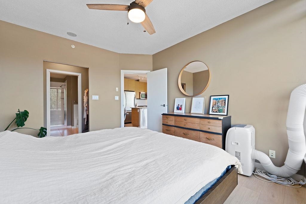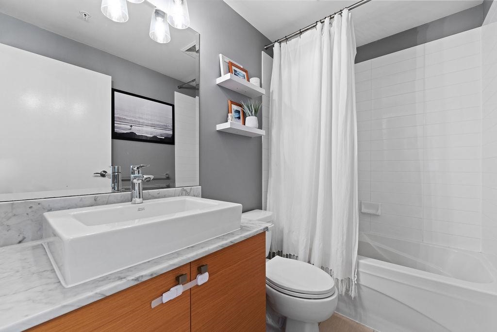 Location! This Immaculate, well loved 2 Bed, 2 Bath Corner Unit home provides incredible natural light and features 9ft ceilings, open-concept layout, separated bedrooms, & large windows which offer stunning sunset views. Enjoy a modern kitchen with stainless steel appliances, stone counters, gas cooktop, & spacious balcony. Primary bedroom includes 4-piece ensuite with separate soaker tub and walk through closet. Custom blackout blinds have been installed as well as new flooring throughout. 1 parking & 1 storage locker included. Resort-style amenities: indoor pool, hot tub, gym & more. Steps to SkyTrain, shops, Rocky Point, oceanfront trails & rec centre. Over $1050/sqft, this unit blends comfort, location & lifestyle. Walk Score is perfect. This is convenience at your door step. Book now