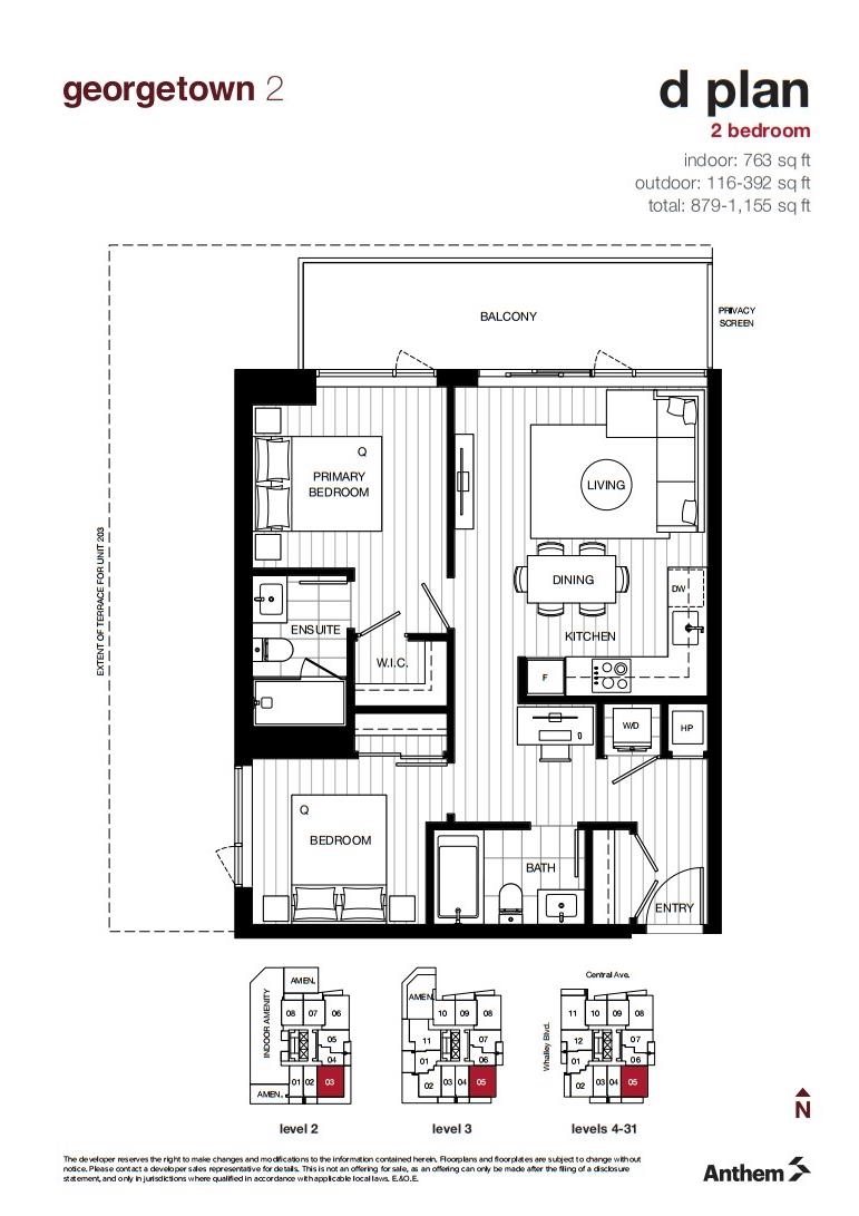 Georgetown 2 by Anthem - The 2nd phase in Surrey City Centre's largest Master Planned community. Located steps from Surrey Central Skytrain station, SFU, KPU, the future UBC Campus, countless shops, restaurants & services. Georgetown is in the centre of it all. At completion, Georgetown 2 will feature nearly 18,000 SQFT of indoor & outdoor amenity space including a gym, social lounge, games room, community garden, & outdoor lounge and BBQ area. This 2 bed, 2 bath D plan features premium 24" integrated appliances, durable quartz countertops & ample storage to keep life organized. An energy efficient heat pump offers heating and cooling for year-round comfort.