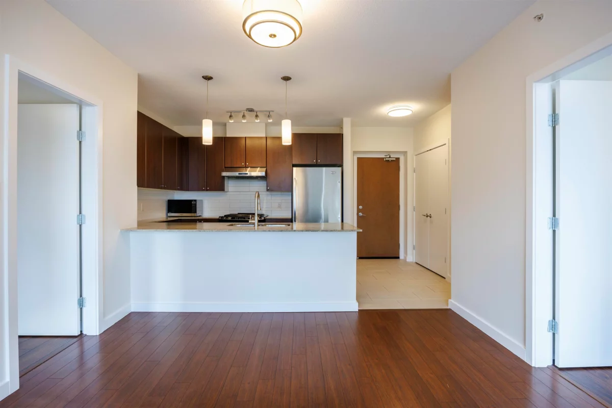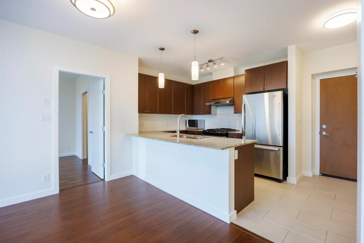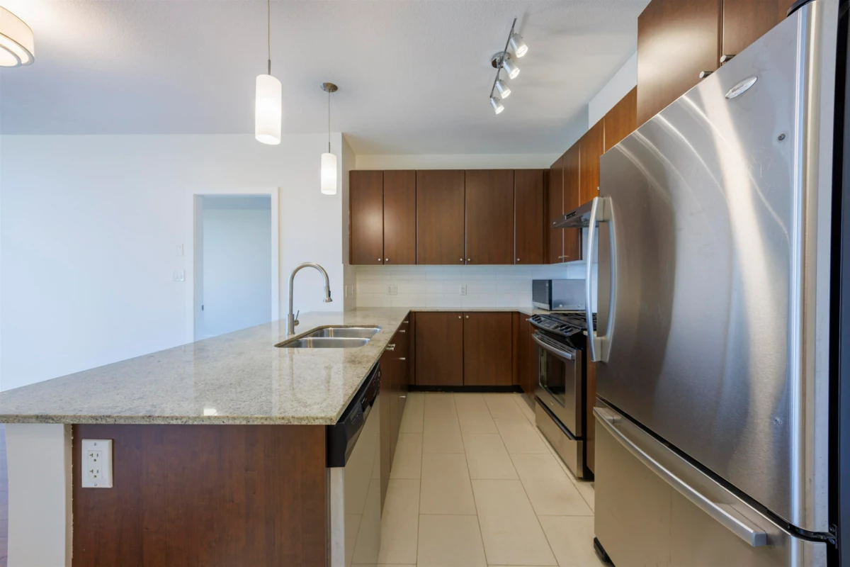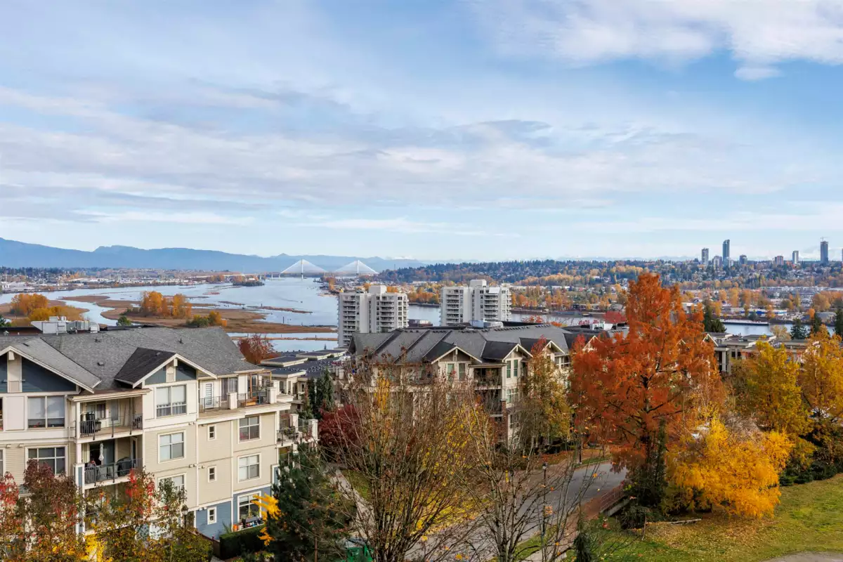 Stunning river views in Victoria Hill! This bright south-facing 2 bed, 2 bath home at The Carlyle offers 912 sq ft of well-kept living space with bedrooms on opposite sides, two balconies, and nearly 9-foot ceilings creating an open, airy feel. Features laminate flooring, fresh paint, new lighting, and a modern kitchen with granite counters and stainless appliances. Floor-to-ceiling windows fill the home with light and showcase sweeping Fraser River and mountain views. The main balcony extends from the living area, while the primary bedroom enjoys a private balcony. The Carlyle is a quality concrete tower by Onni with great amenities—gym, lounge, and guest suite, steps to parks, trails, BusStop, schools, and the new aquatic & community centre nearby. Move-in ready and a must-see!