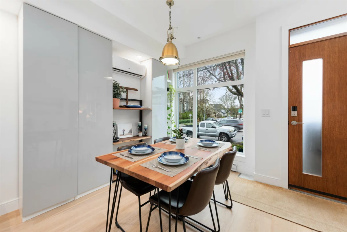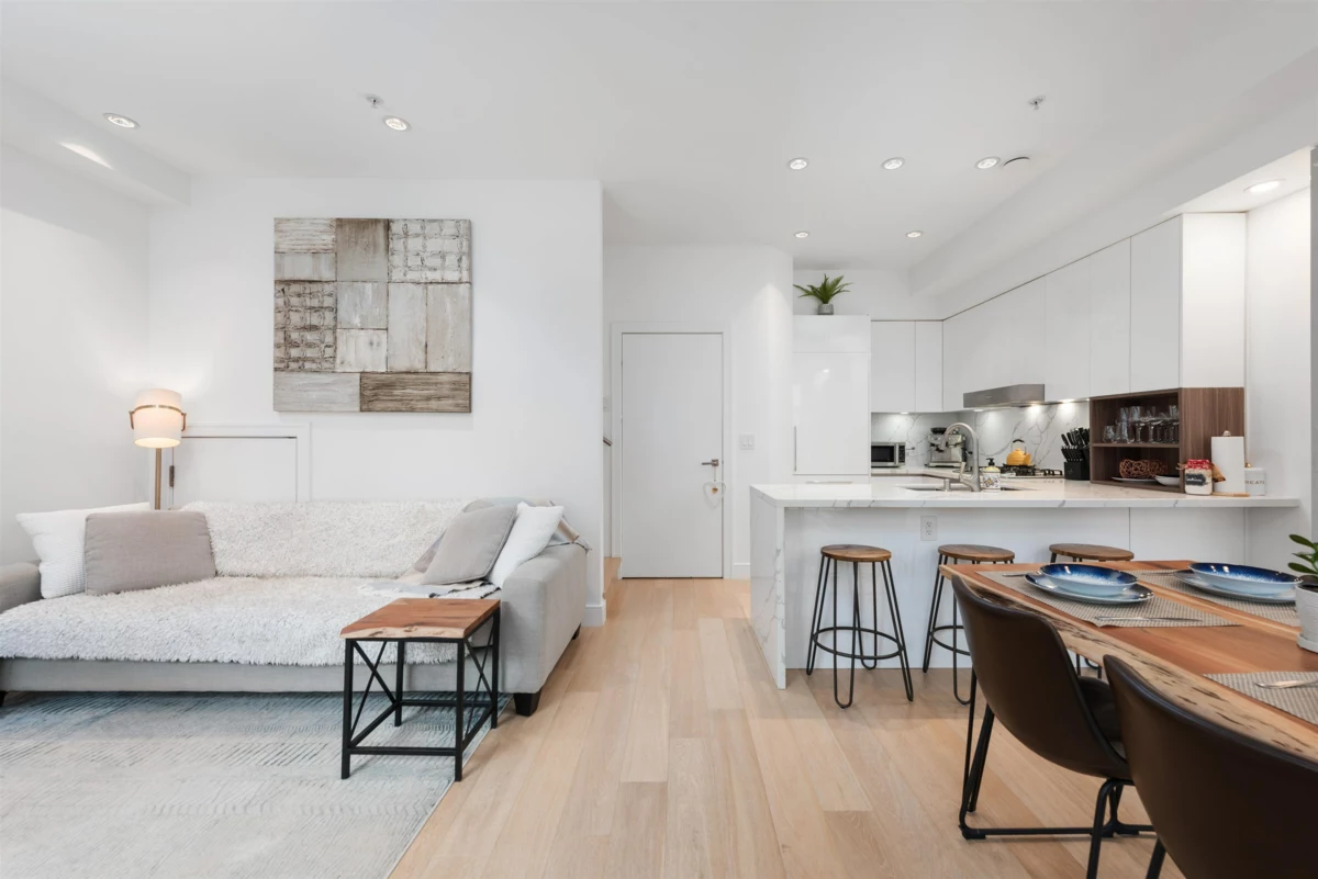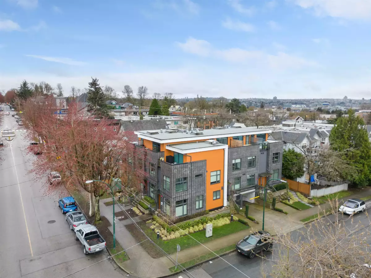 Step into a world of elegance with this 3 BR, 3 Bath townhome, mere steps from the heart of Commercial Drive. Tucked on a peaceful section of Victoria Dr, this residence shines with impressive finishes: oak plank flooring, quartz counters, integrated Miele appliances, A/C, and spa-like baths. The main level provides an open concept with over-height ceilings & ample natural light. The 2nd level houses two bedrooms & laundry, while the 3rd has a spacious primary suite, huge walk-in closet, marble walk-in shower with rain head, & private retreat deck with lovely mountain views. Built in 2019, this well-run complex includes parking & storage. Incredible location - walk to everything! Parks, cafes, shops and transit. Sneak Peek Thurs 5:30-6:30. Open Houses Sat/Sun Jan 31st & Feb 1st 2-4pm.