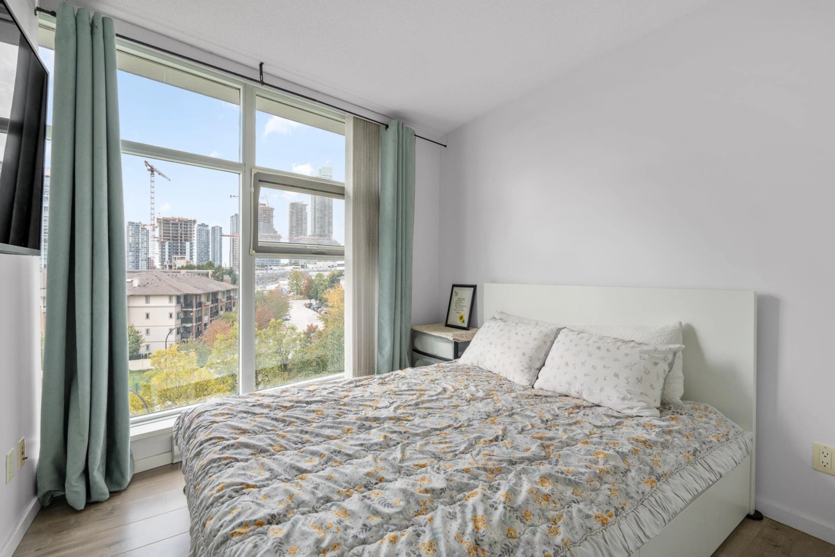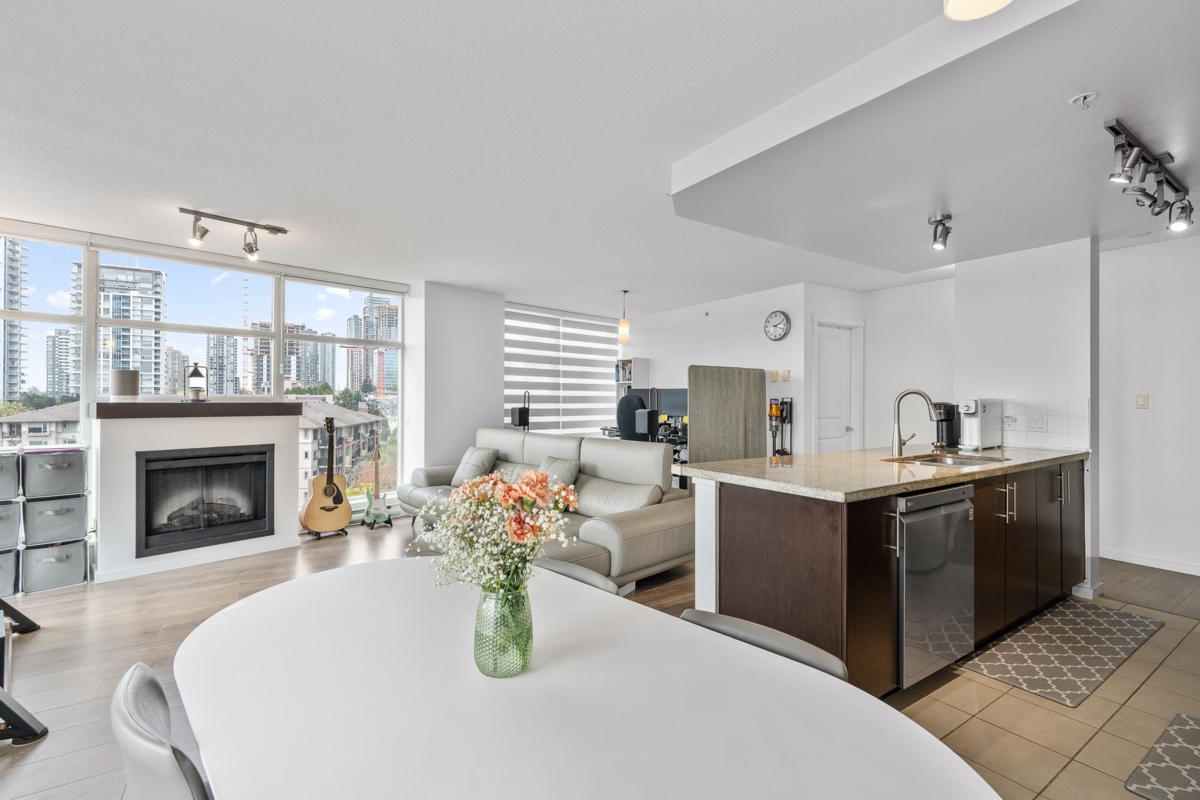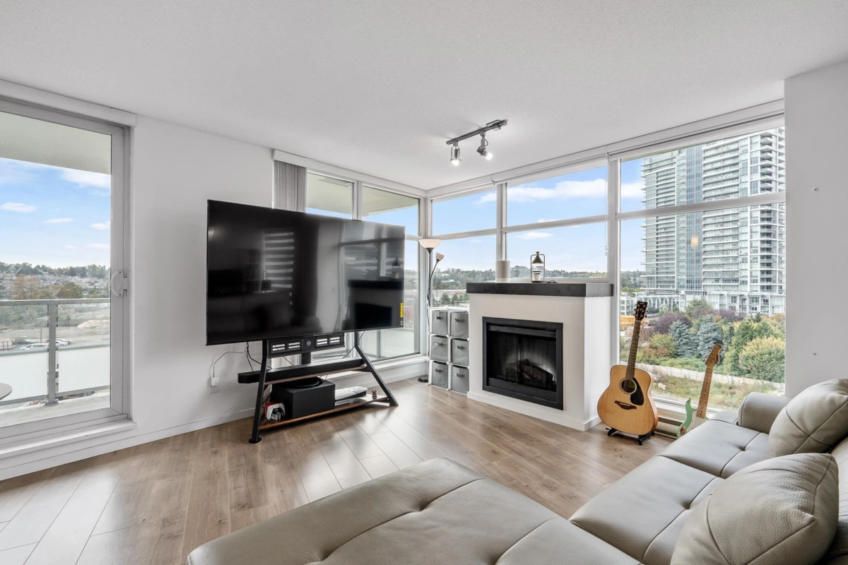 Built in 2008 by renowned Polygon, Watercolours is a sturdy concrete tower on a peaceful, private street, offering stunning, unobstructed city and mountain views. This bright 2-bed, 2-bath corner unit features an open layout with floor-to-ceiling windows, flooding the space with light. Recent upgrades include new flooring, fresh paint, a modern fridge, and a sleek cooking range. The stylish kitchen boasts granite countertops and chic cabinetry, paired with an electric fireplace and a spacious balcony ideal for relaxing or entertaining. Amenities include a top-notch gym, bike storage, lounge, indoor hot tub, steam room, and sauna. Perfectly located, it's a short walk to Brentwood Town Centre, Skytrain, BCIT, and a vibrant mix of restaurants and shops, blending urban convenience with serene.