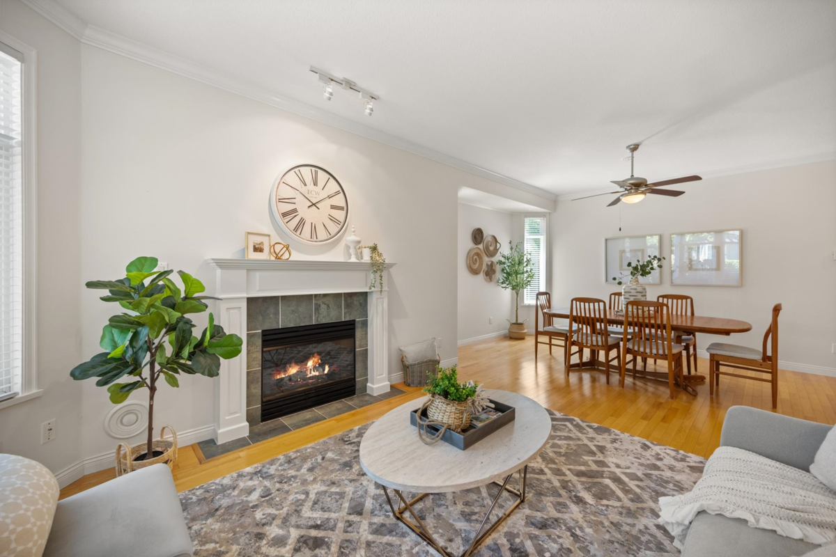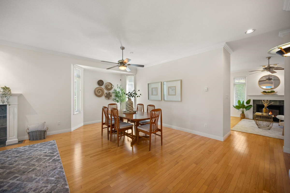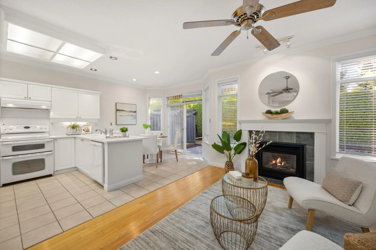 Ponderosa Station! Beautiful 2-bed 2-bath townhome located in a quiet area of this gated community. Well cared for, this open one-level home is ready to welcome you. Large open spaces with hardwood & tile flooring throughout. Spacious living room with gas fireplace & dining room easily accommodates full-sized furniture for entertaining. Large private backyard has an oversized patio with retractable awning & is conveniently accessed from the kitchen/eating area. A family room with another gas fireplace is a cozy space for relaxation & conversation. The generous primary bedroom has a walk-through closet with mirrored doors leading to a 5-piece ensuite. A second spacious bedroom & powder room with shower are located apart from the primary. Close to shopping, recreation, and Crescent Beach.