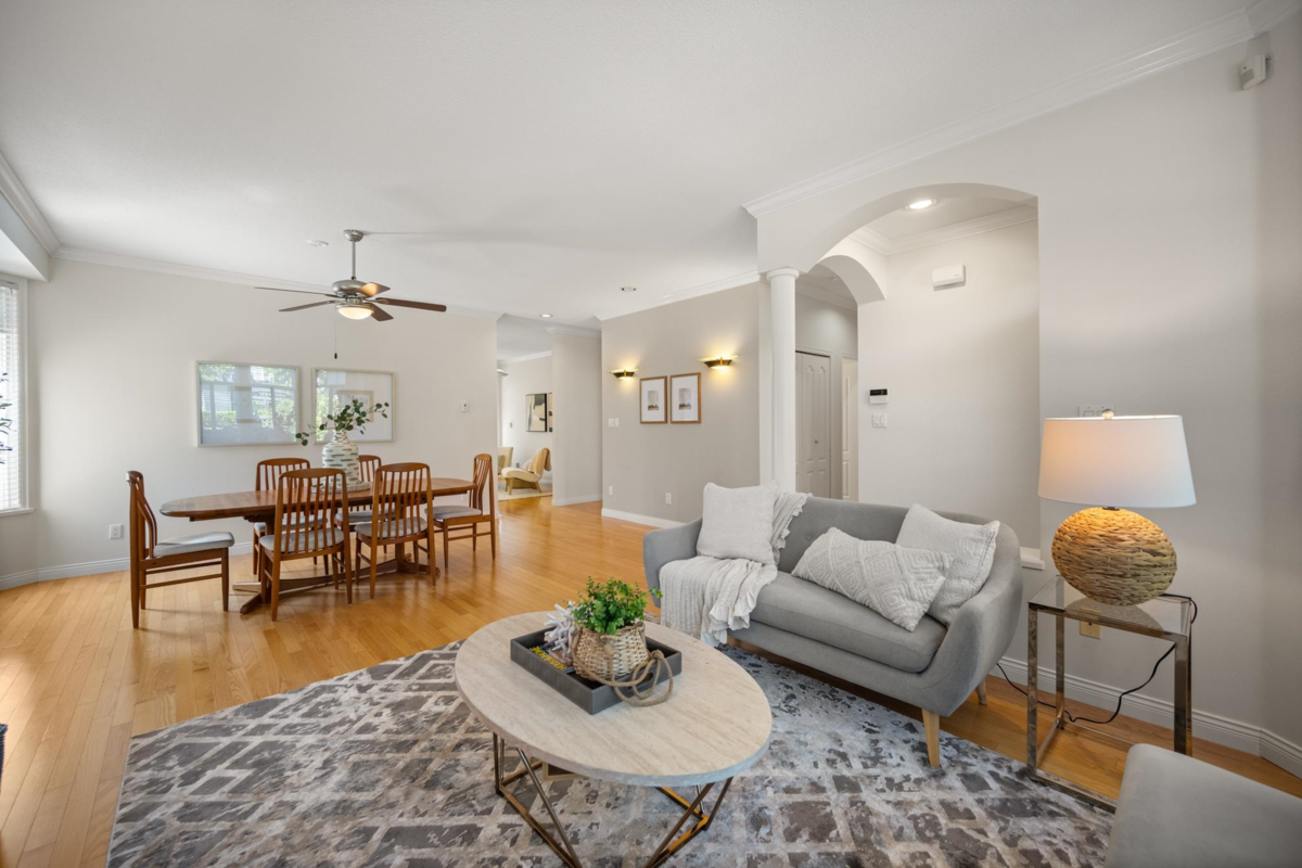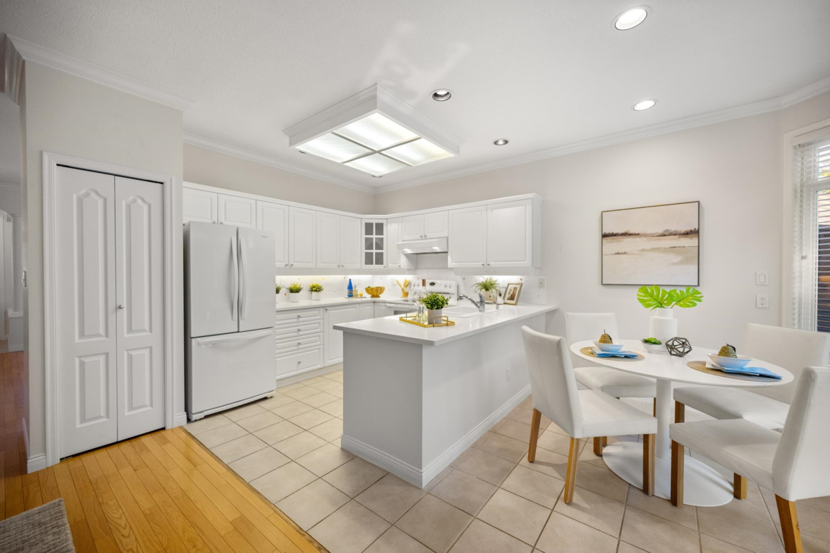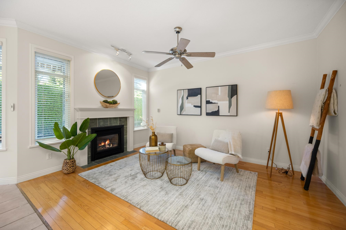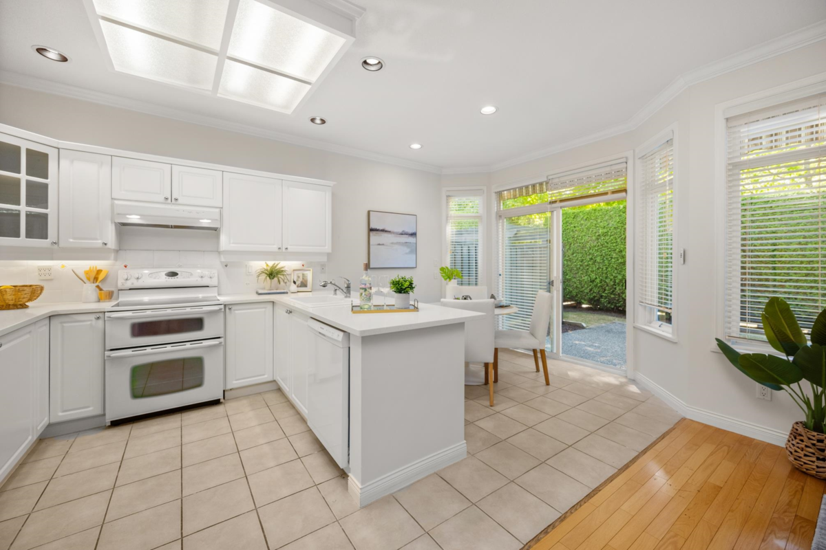 Ponderosa Station! Beautiful 2-bed 2-bath townhome located in a quiet area of this gated community. Well cared for, this open one-level home is ready to welcome you. Large open spaces with hardwood & tile flooring throughout. Spacious living room with gas fireplace & dining room easily accommodates full-sized furniture for entertaining. Large private backyard has an oversized patio with retractable awning & is conveniently accessed from the kitchen/eating area. A family room with another gas fireplace is a cozy space for relaxation & conversation. The generous primary bedroom has a walk-through closet with mirrored doors leading to a 5-piece ensuite. A second spacious bedroom & powder room with shower are located apart from the primary. Close to shopping, recreation, and Crescent Beach.