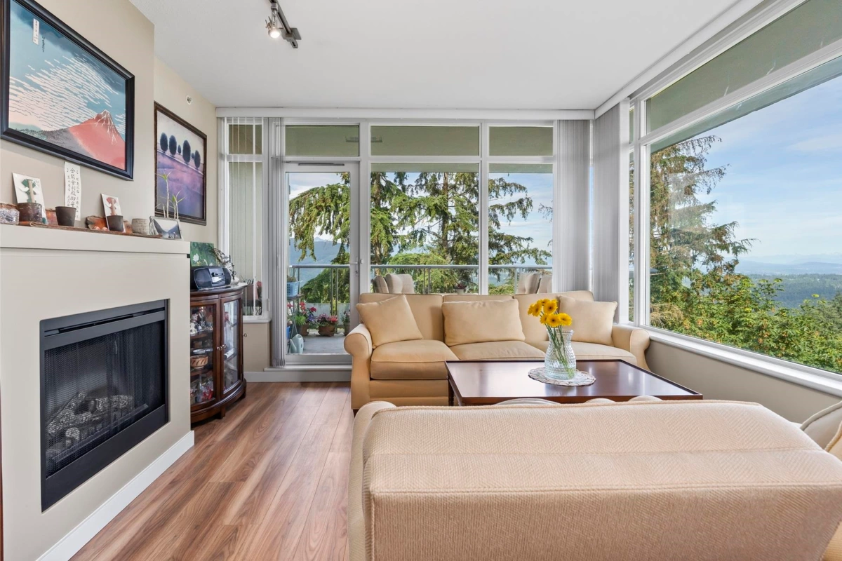 Panoramic view of Mountain, Forest & Inlet Water ! ! from prestigious "AURORA", desirable concrete high-rise development by well-known Polygon. Clean and Bright, Sun-drenched favorable SE corner unit features over 920 sq ft 2 BR, 2 full bath with open concept Living, Dining$ Kitchen. High floor to ceiling window take abundant natural light into Living and Bedrooms. Enjoy the beautiful natural surroundings and spectacular view from Living and oversized balcony.