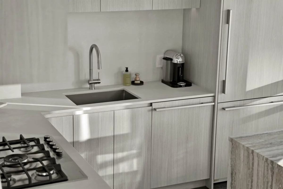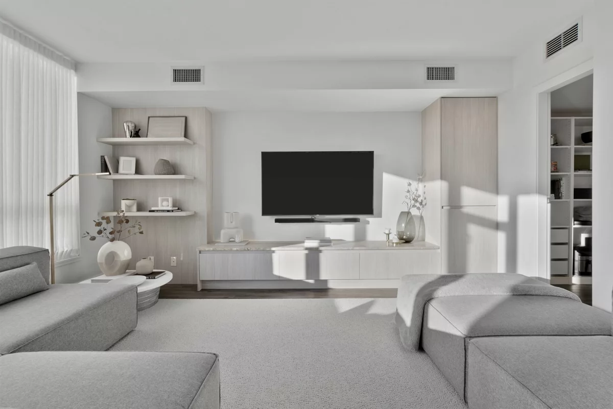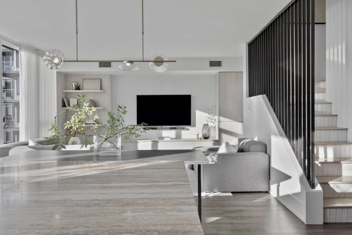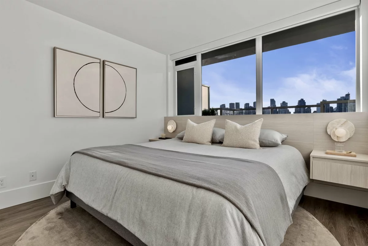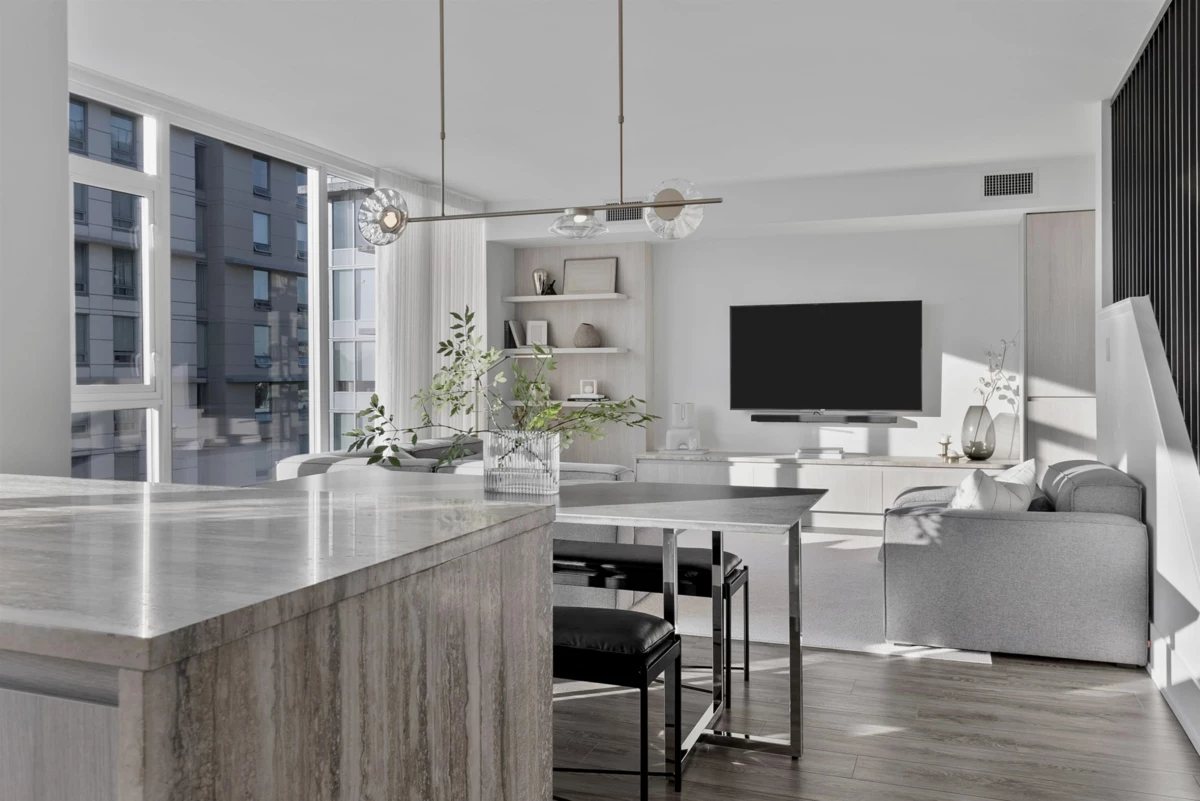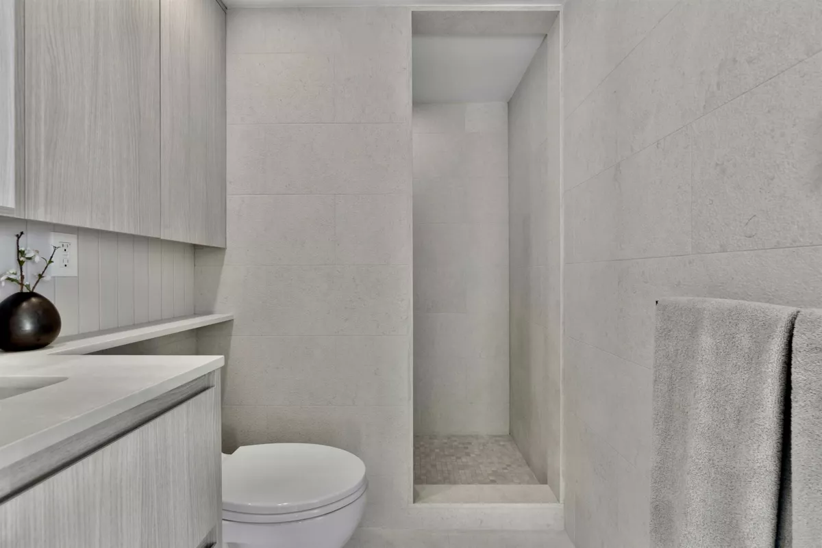 Completely redesigned, this Penthouse 2-level home features central AC & heating, full northwest window exposure w/ city views, extensive millwork and stone throughout, as well as custom draperies & auto blinds. The kitchen as integrated fridge & dishwasher, Fisher&Paykel gas cooktop & convection oven, honed quartz countertops with backsplash, and a showpiece travertine stone island. The living room includes a built-in media unit with storage, open display shelving & concealed bar. The den add more additional storage or a home office set up, while there is a huge bonus storage area under the stairs. Upstairs are 2 bedrooms, the primary with custom king bed and walk-in closet, stacked laundry, a built-in work area, and a sprawling terrace with afternoon/evening sun. 1 Parking & 1 Big locker