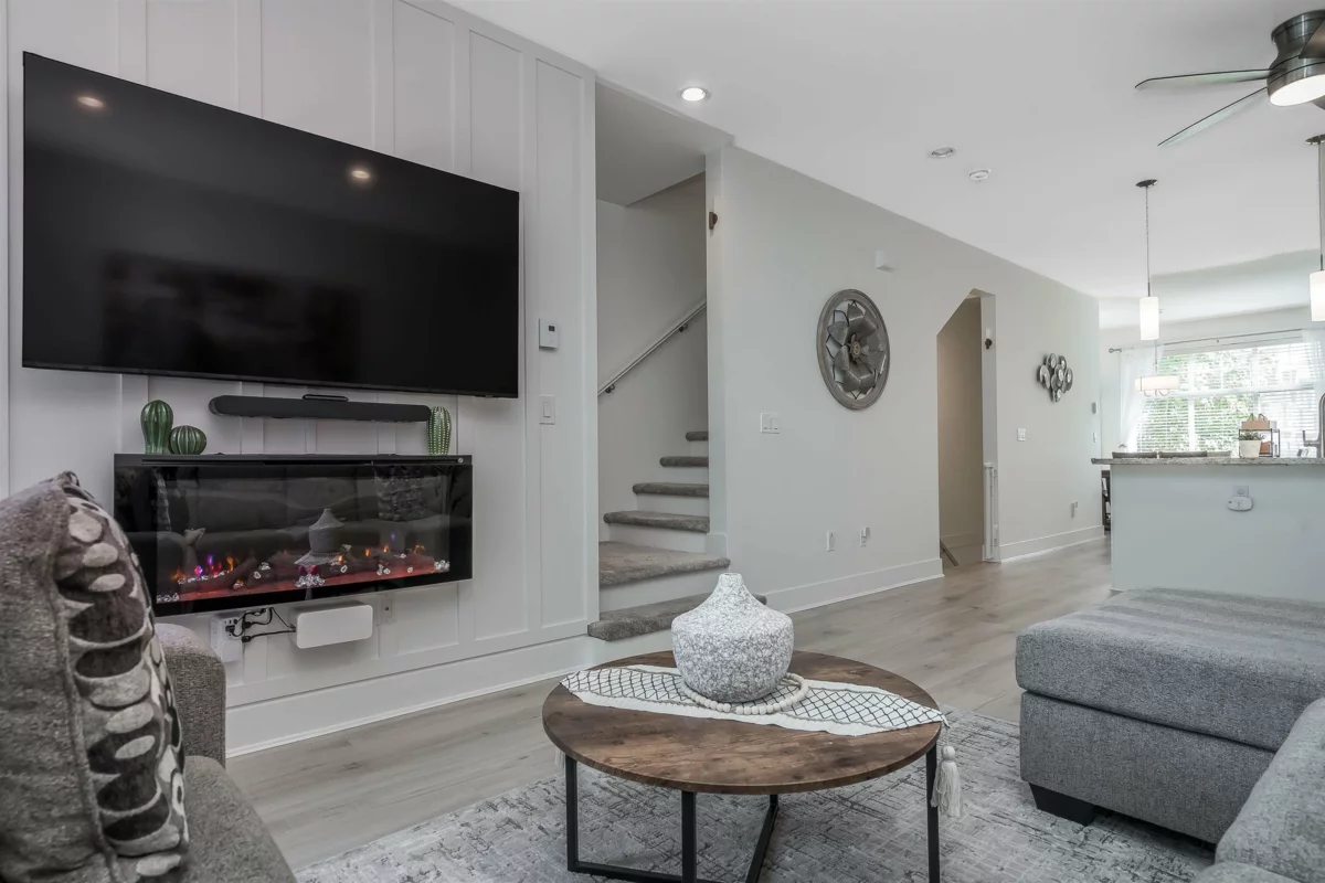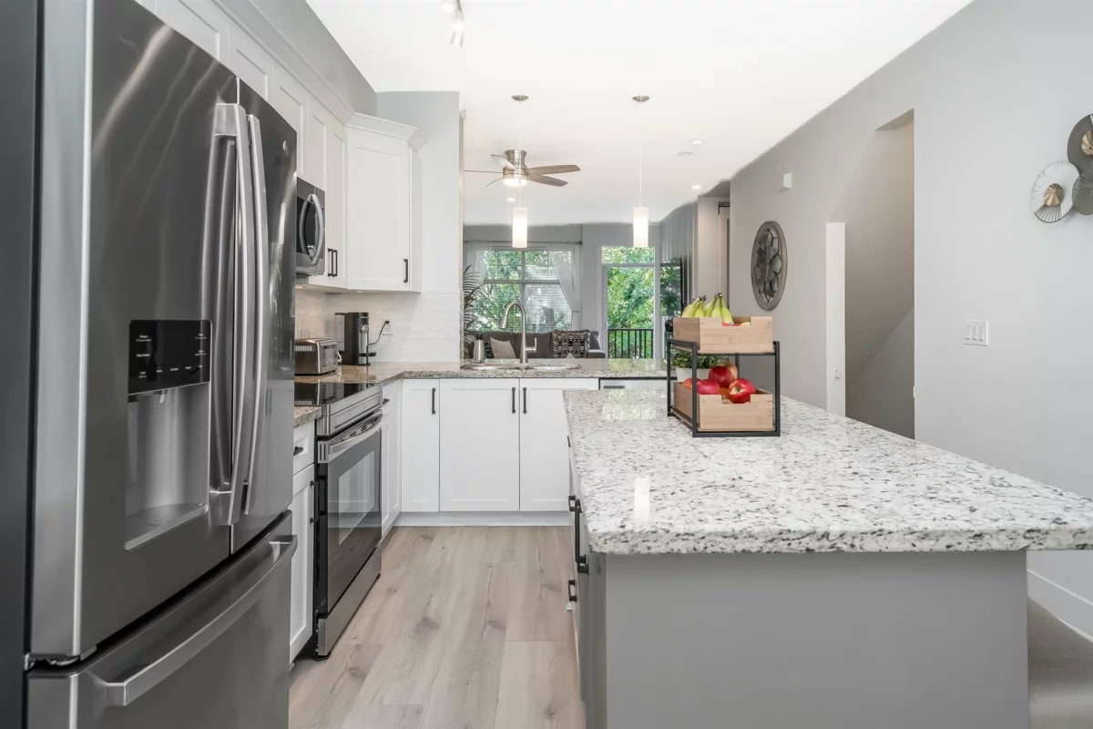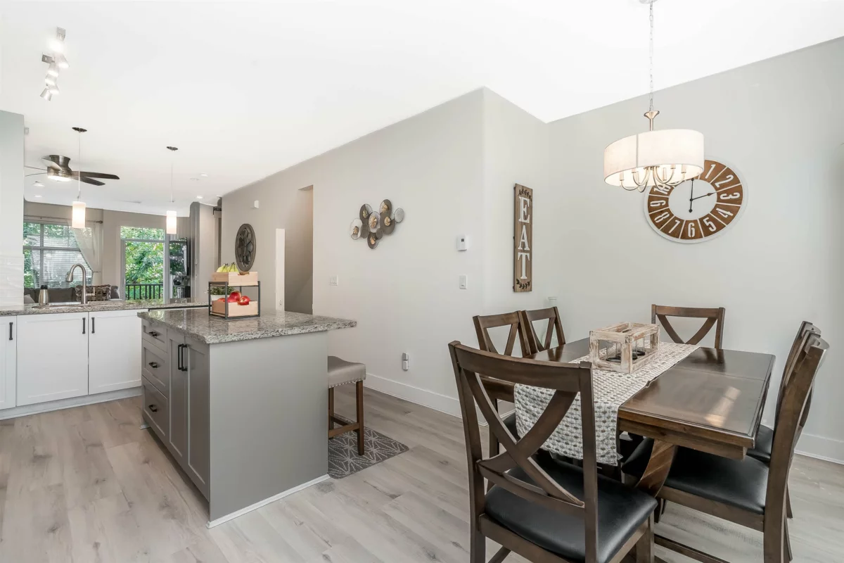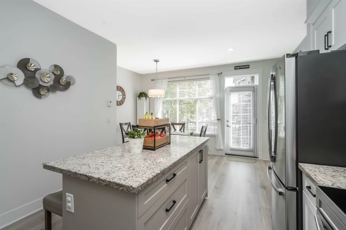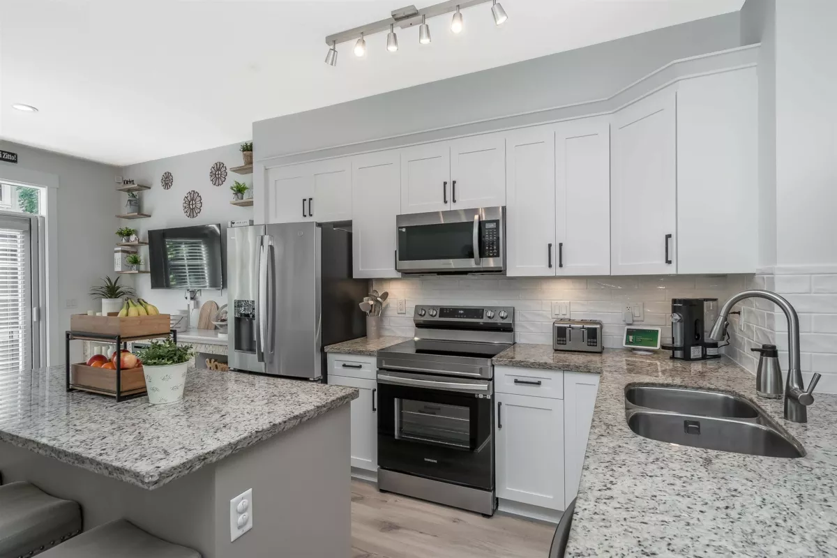 Welcome to UPTOWN, where style meets comfort in this BEAUTIFULLY UPDATED 4-bedroom, 3-bathroom townhome spanning nearly 1700sqft. Designed to impress, it feels like a SHOWHOME. Thoughtful upgrades include fresh paint, elegant light fixtures, granite counters, tile backsplash, wide plank vinyl flooring, new carpets, ALL-NEW SS appliances, refinished cabinets with modern hardware, custom millwork, new blinds, screens throughout, and concrete pavers in the private, fully fenced yard backing onto PERMANENT GREEN SPACE. Enjoy amenities including a clubhouse, gym, guest suite, and playground. Ideally located near parks, schools, shopping, transit, and commuting routes, with low strata fees.