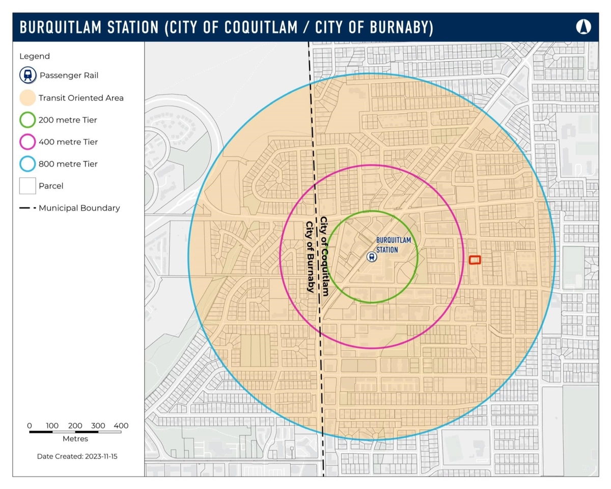 Municipal Neighbourhood Community Plan supports medium density apartment residential development. Provincial Designated Tier 3 provincial Transit Oriented Development area, allowing up to 3.0 FAR/FSR and minimum 8 stories height. Neighbouring property available for land assembly. House is still livable and partially tenanted.