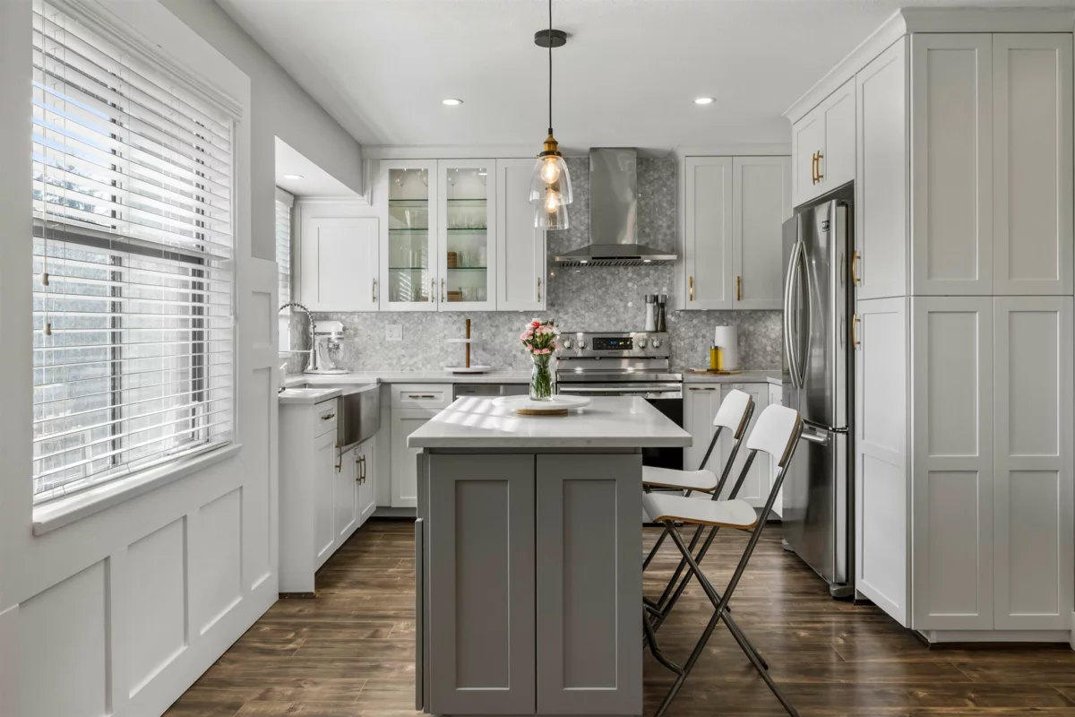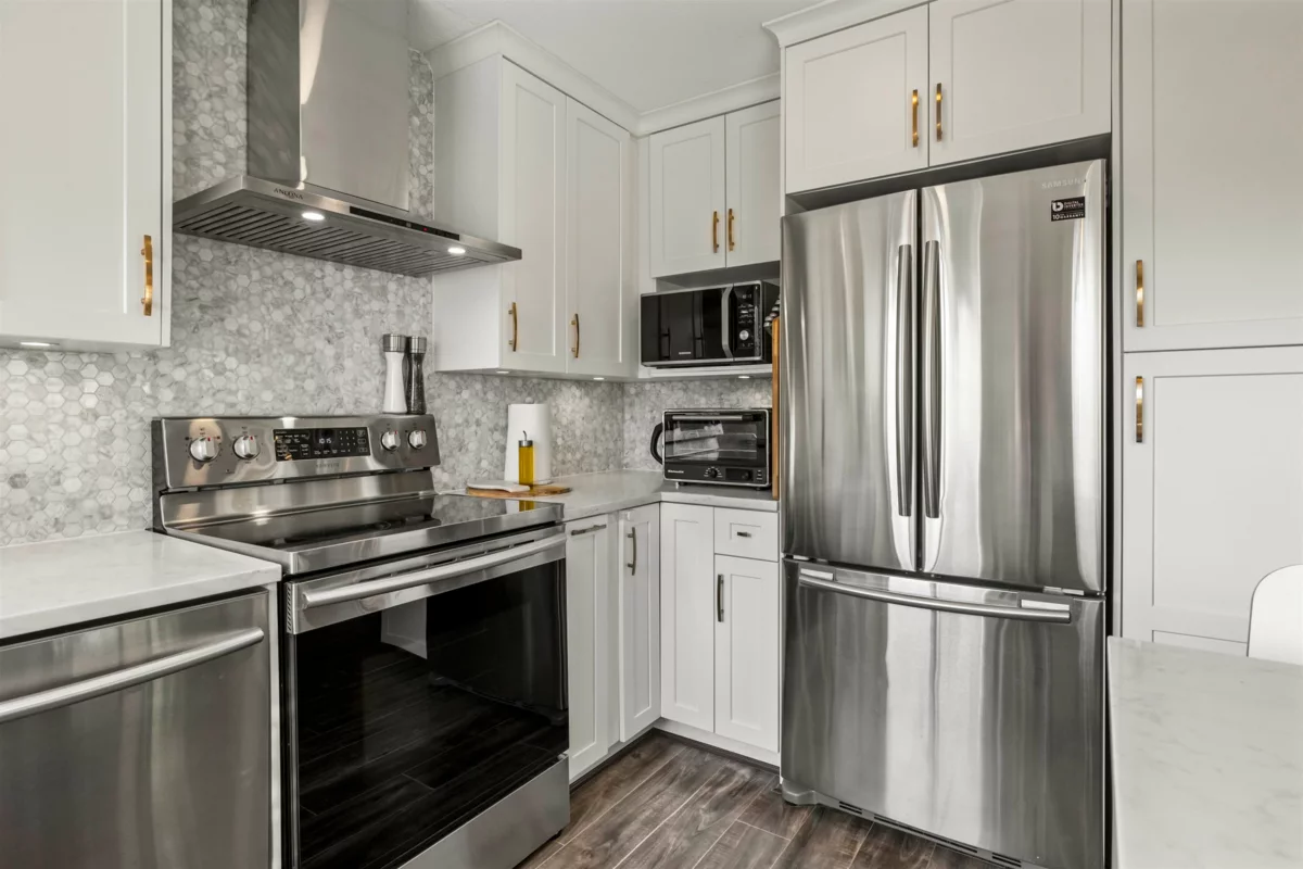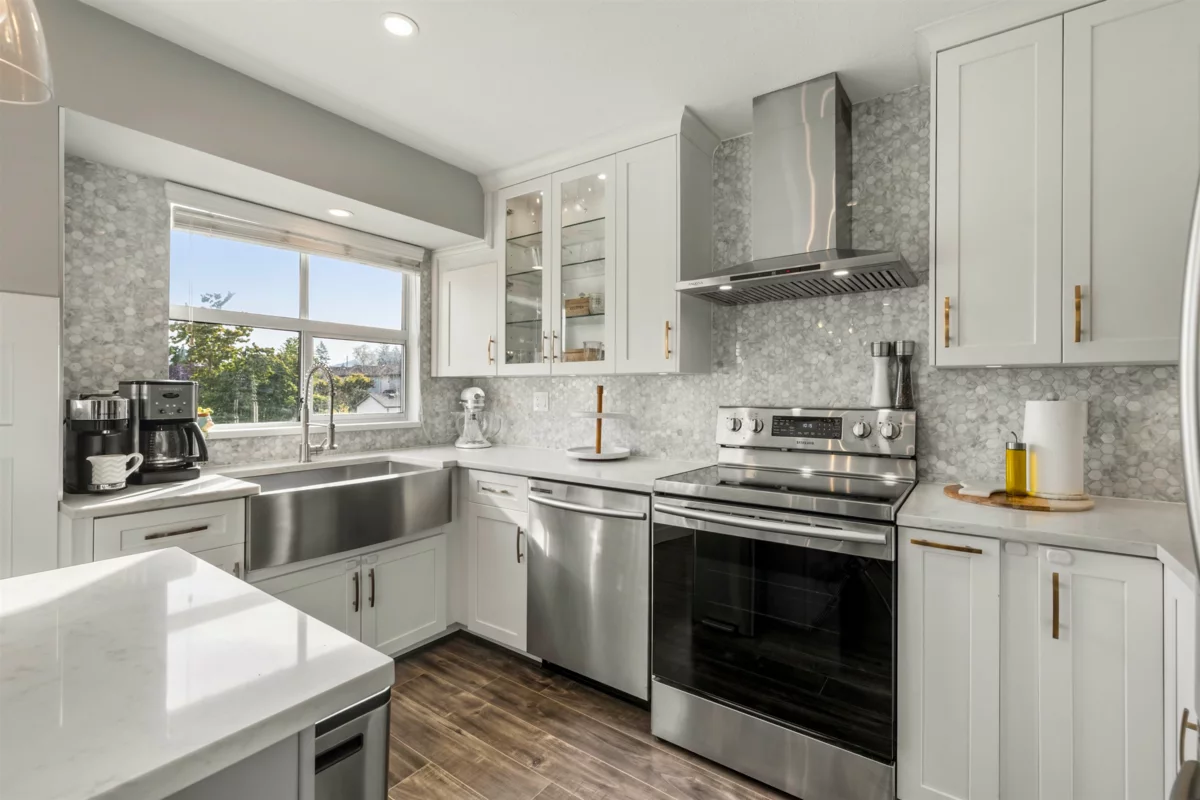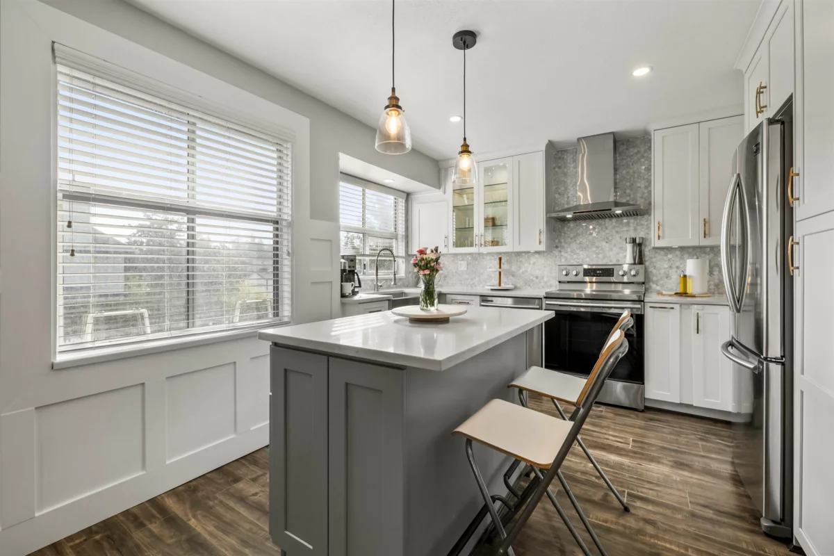 Discover this stunning corner upper unit in the desirable Gabriola Complex! Spacious, updated, & filled with natural light from every angle. The great room features vaulted ceilings, a cozy gas fireplace, and opens up beautifully to a newly renovated dream kitchen complete with shaker cabinets, quartz countertops, tile backsplash, large open sink, island, & stainless steel appliances. You’ll love the thoughtful updates throughout, including a fully renovated bathroom, wide plank laminate floors, wainscoting, & modern recessed lighting. Two parking stalls included! All in an unbeatable location, just a short walk to schools (including Meadowridge Private School), shopping, parks, transit, & recreation. Don’t wait on this one, it’s the perfect place to call home.