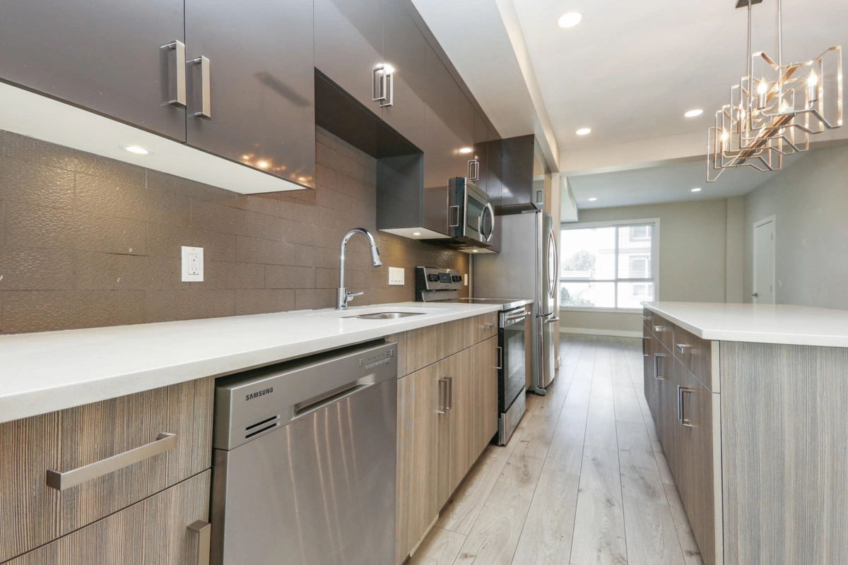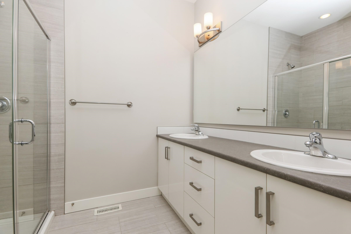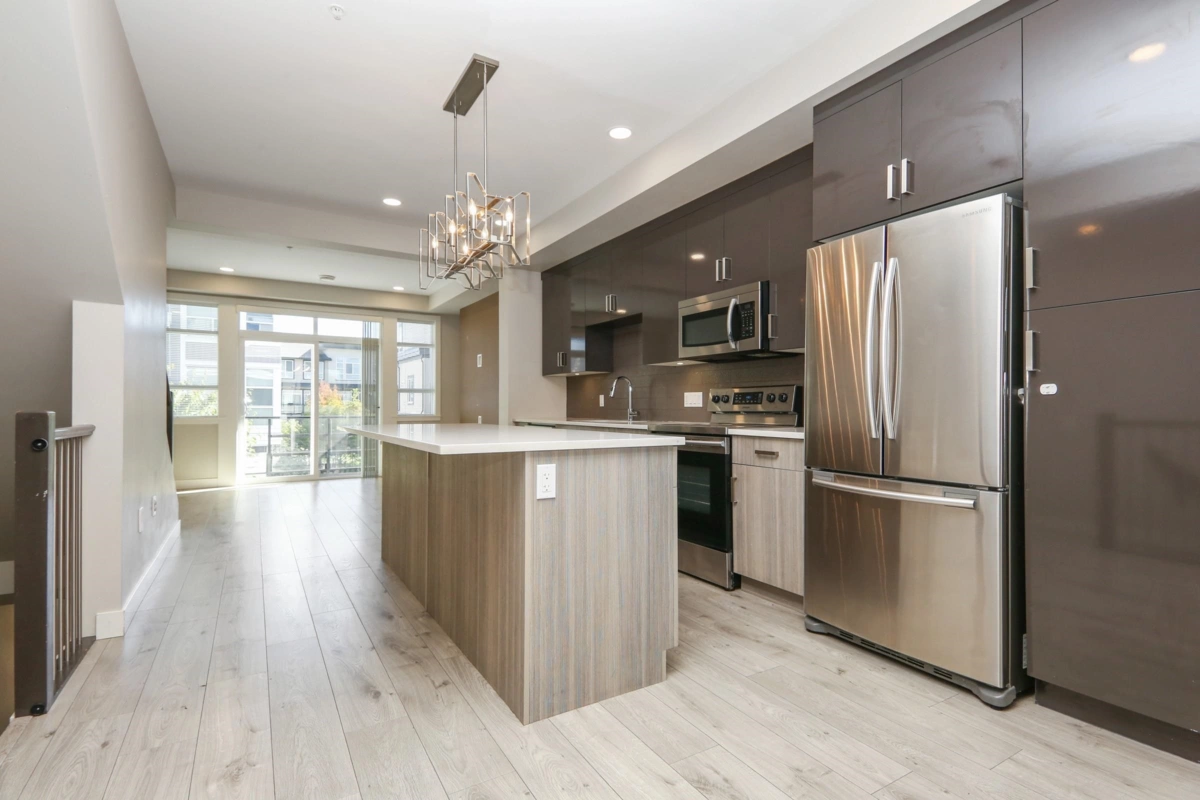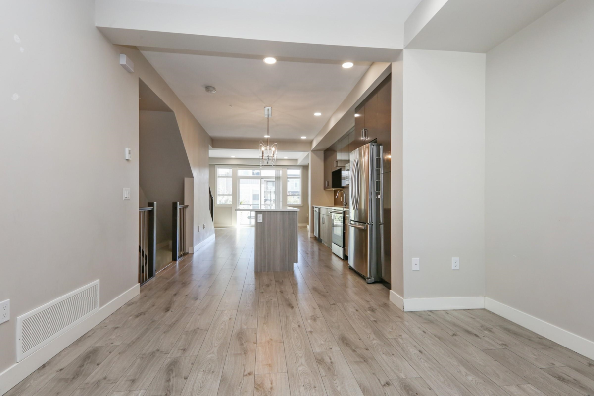 Near new family sized townhome. 3 (could be 4) bedrooms and 4 bathrooms. Modern open concept, 11' ceilings. Gourmet kitchen with island, quartz countertops, stainless steel appliances. Natural gas forced air heating and tankless on demand hot water. Primary bedroom with full ensuite bath. Versatile separate-entrance rec room downstairs that could be 4th bedroom with 2 piece bath, home office, or media room. Spacious balcony and private fenced yard. Secure enclosed garage and outside parking pad large enough for full sized truck. Convenient location – walk to schools, parks, shopping, recreation, and updated YMCA. Easy access to Freeway. Clean move in condition and ready for immediate occupancy. Pet friendly complex - 2 pets allowed, no size limit.
