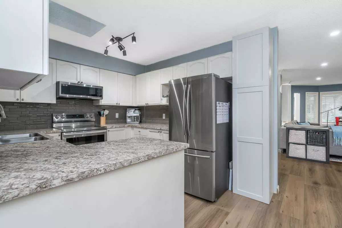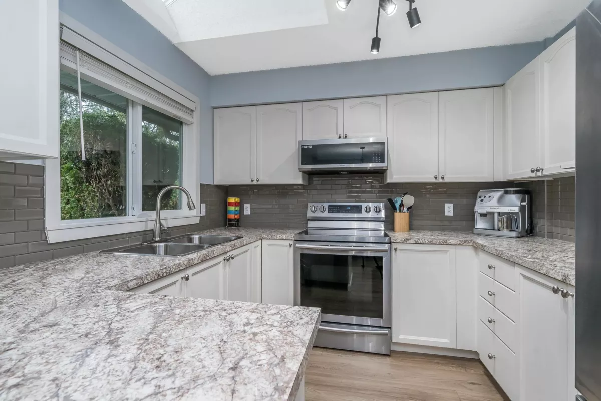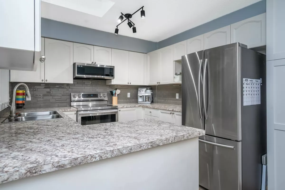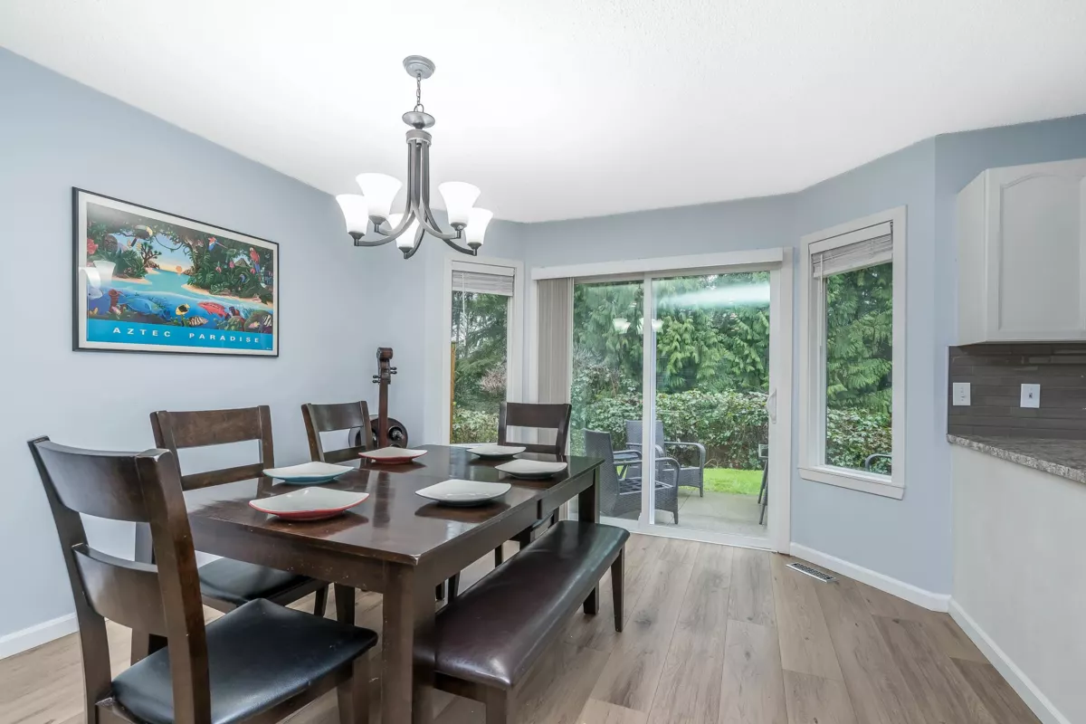 BRIDLEWOODS – in the heart of Walnut Grove. This 1,567 sq. ft. two-storey townhome offers an ideal layout and a preferred end-unit location backing onto a private greenbelt. The main floor features a spacious living and dining area with a cozy gas fireplace, updated laminate flooring, a 2-piece bathroom, and convenient in-suite laundry. The bright kitchen and eating nook open directly to the rear patio and yard—perfect for summer BBQs and entertaining. Upstairs you’ll find 3 bedrooms, including a large primary suite, plus 2 full bathrooms. Parking includes a single garage and an additional spot right out front. Family and pet-friendly complex in a prime location close to schools, shopping, restaurants, and parks.