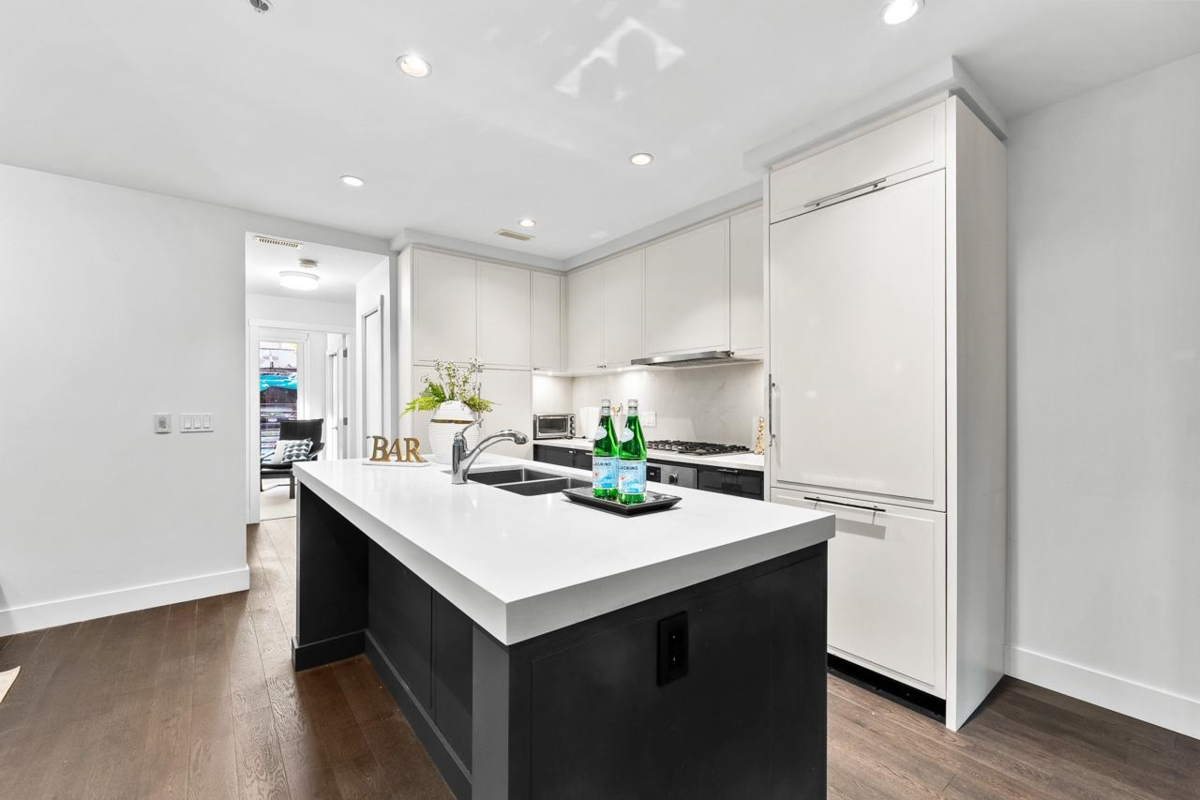 Welcome to Perron, a boutique collection of modern homes on Yukon Street and West 59th Avenue. This bright 1-bedroom corner suite offers an exceptional open layout with full-size Bosch appliances, elegant finishes, and a private landscaped patio with its own entry. Enjoy the perfect balance of nature and city living-steps from Winona Park, close to top Westside schools, SkyTrain, shopping, dining, and recreation. A rare opportunity to own a spacious, well-designed home in one of Vancouver's most desirable neighbourhoods. Please come for your private viewing.