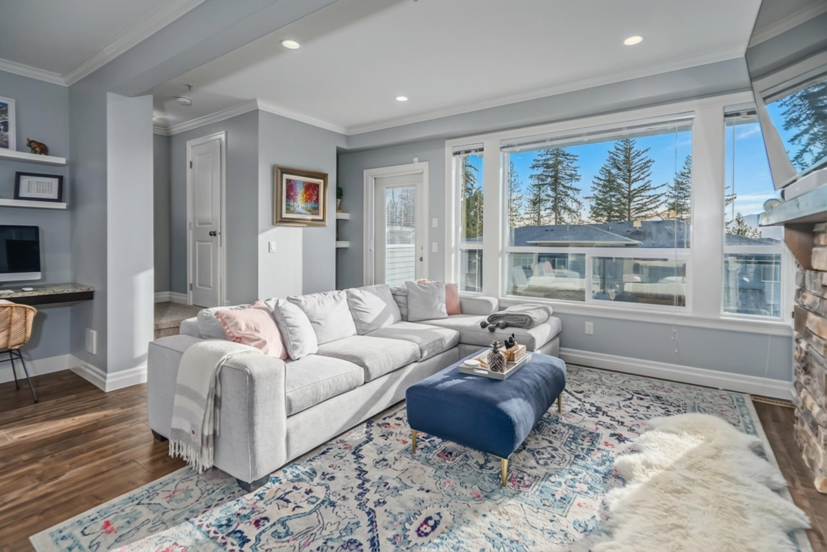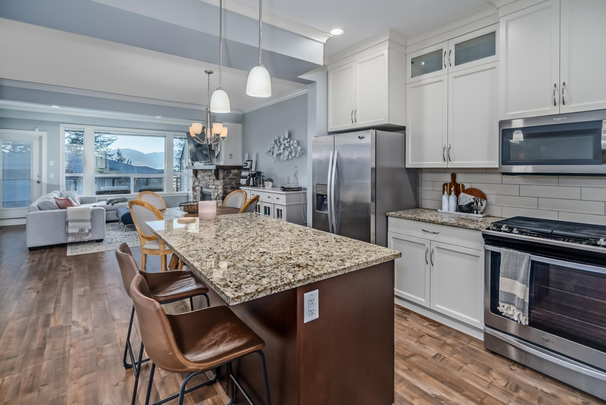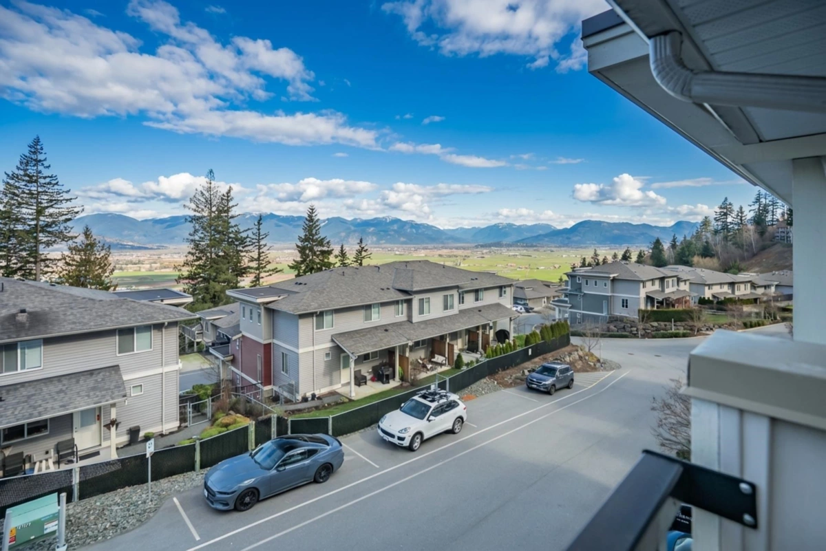 Discover this immaculately maintained 3 bed, 3 bath end-unit townhouse in sought-after Hillcrest Lane, perfectly positioned in the top corner of the complex backing onto a greenbelt with breathtaking mountain and valley views. This 3-level home offers a comfortable layout with an open-concept main floor featuring a bright kitchen with stainless steel appliances, granite counters, walk-in pantry, oversized island, & a cozy gas fireplace. Step out to a large balcony for incredible sunsets or enjoy the low-maintenance yard with gas BBQ hookup. Upstairs features three generous bedrooms, including a primary with walk-in closet, full ensuite, & private balcony. Downstairs offers a versatile flex space plus a massive heated & insulated garage with room for vehicles, storage, or home gym.