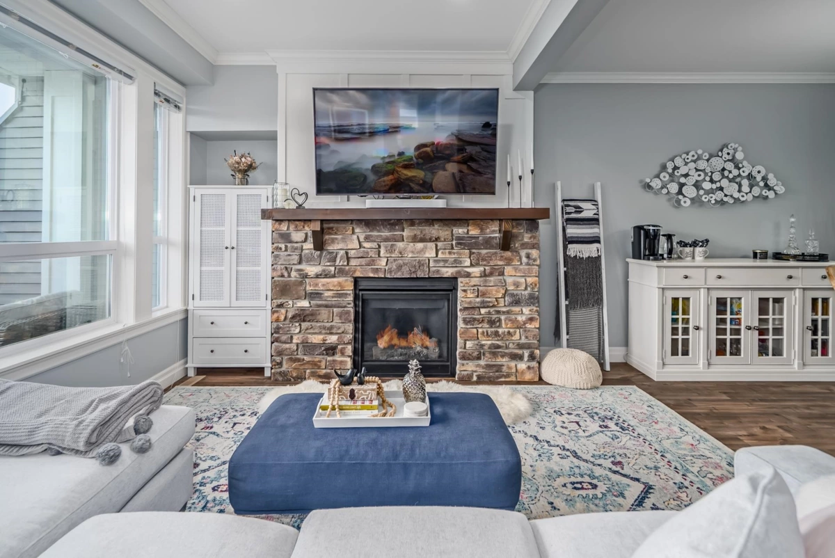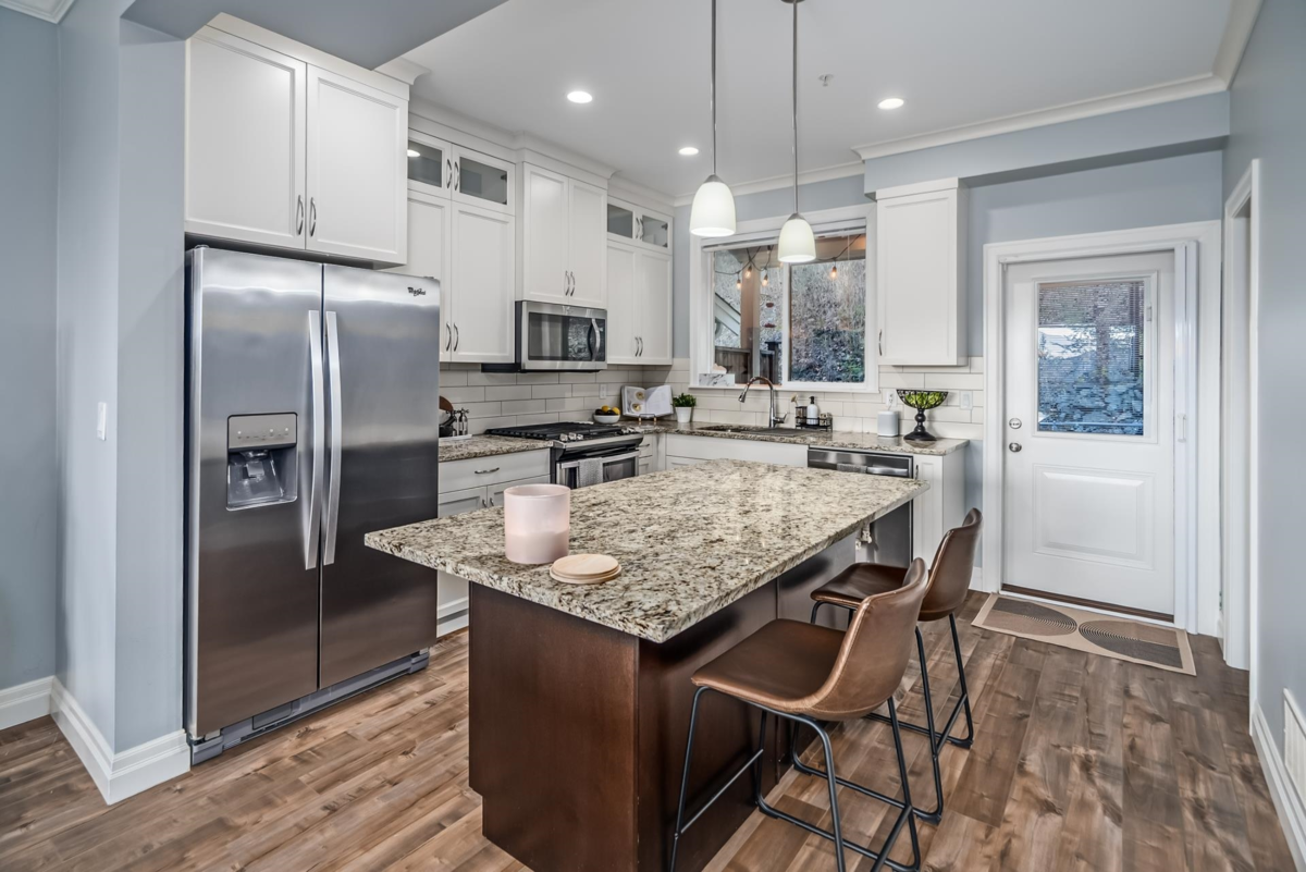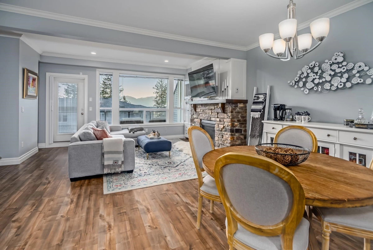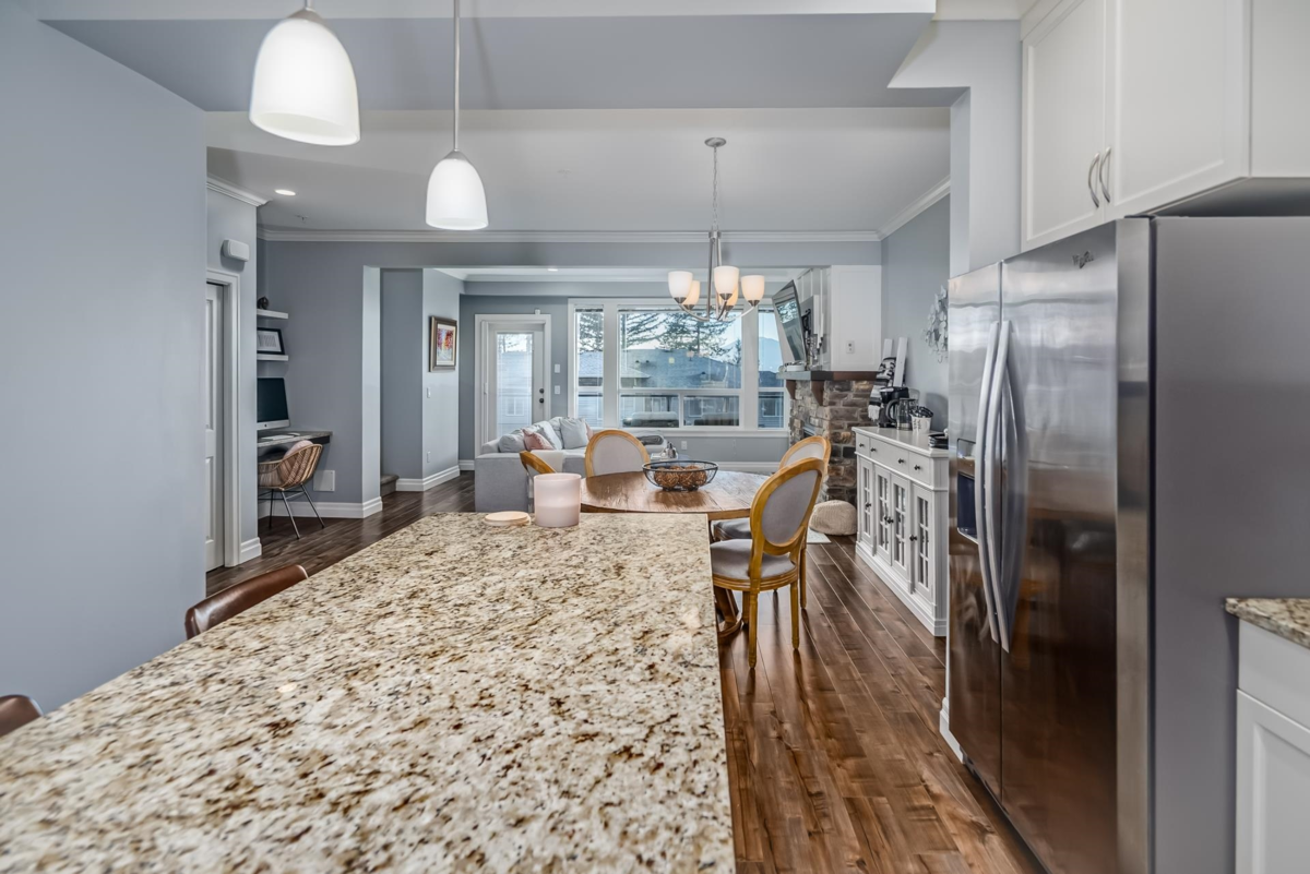 Discover this immaculately maintained 3 bed, 3 bath end-unit townhouse in sought-after Hillcrest Lane, perfectly positioned in the top corner of the complex backing onto a greenbelt with breathtaking mountain and valley views. This 3-level home offers a comfortable layout with an open-concept main floor featuring a bright kitchen with stainless steel appliances, granite counters, walk-in pantry, oversized island, & a cozy gas fireplace. Step out to a large balcony for incredible sunsets or enjoy the low-maintenance yard with gas BBQ hookup. Upstairs features three generous bedrooms, including a primary with walk-in closet, full ensuite, & private balcony. Downstairs offers a versatile flex space plus a massive heated & insulated garage with room for vehicles, storage, or home gym.
