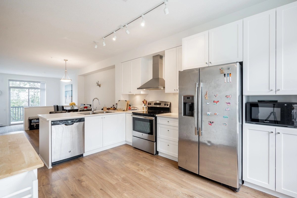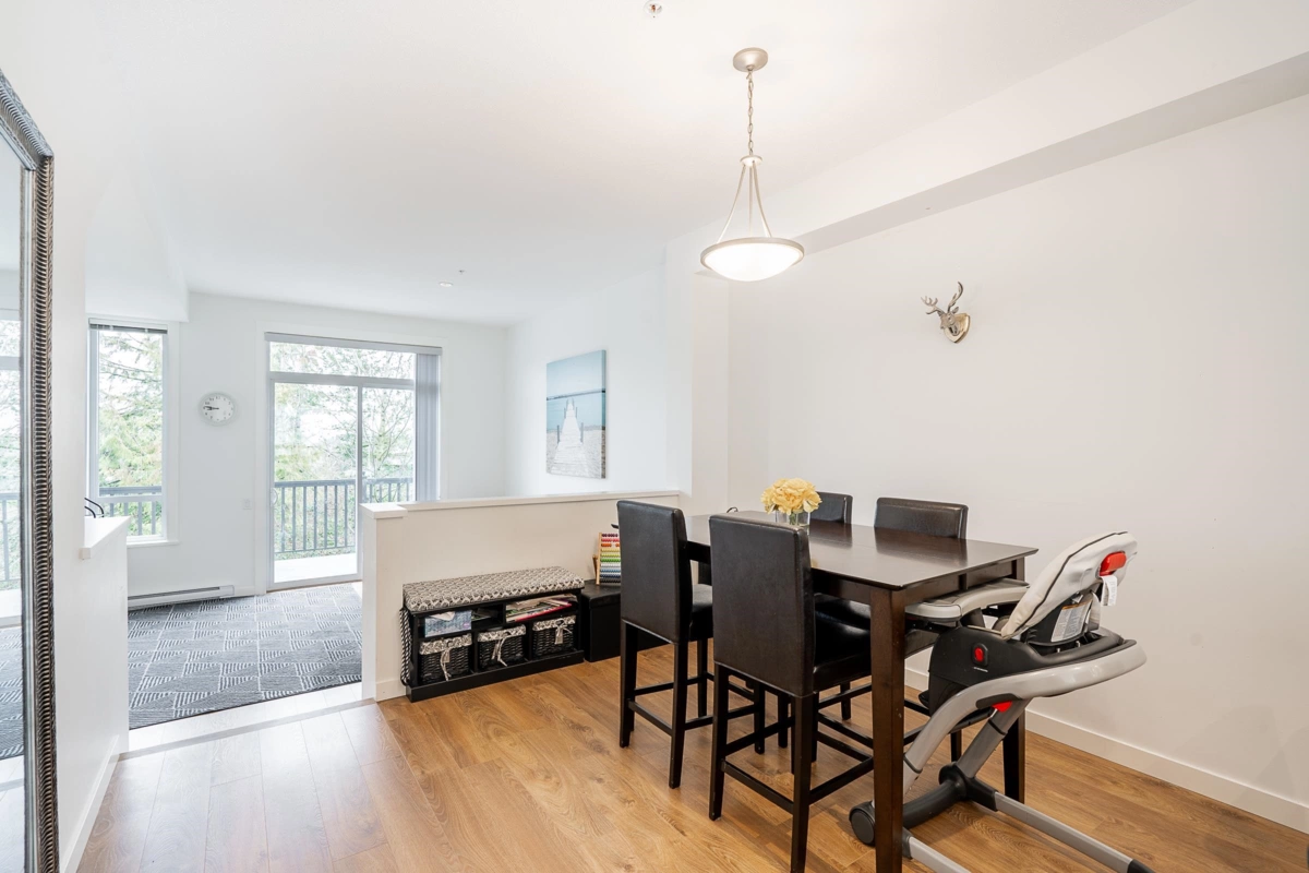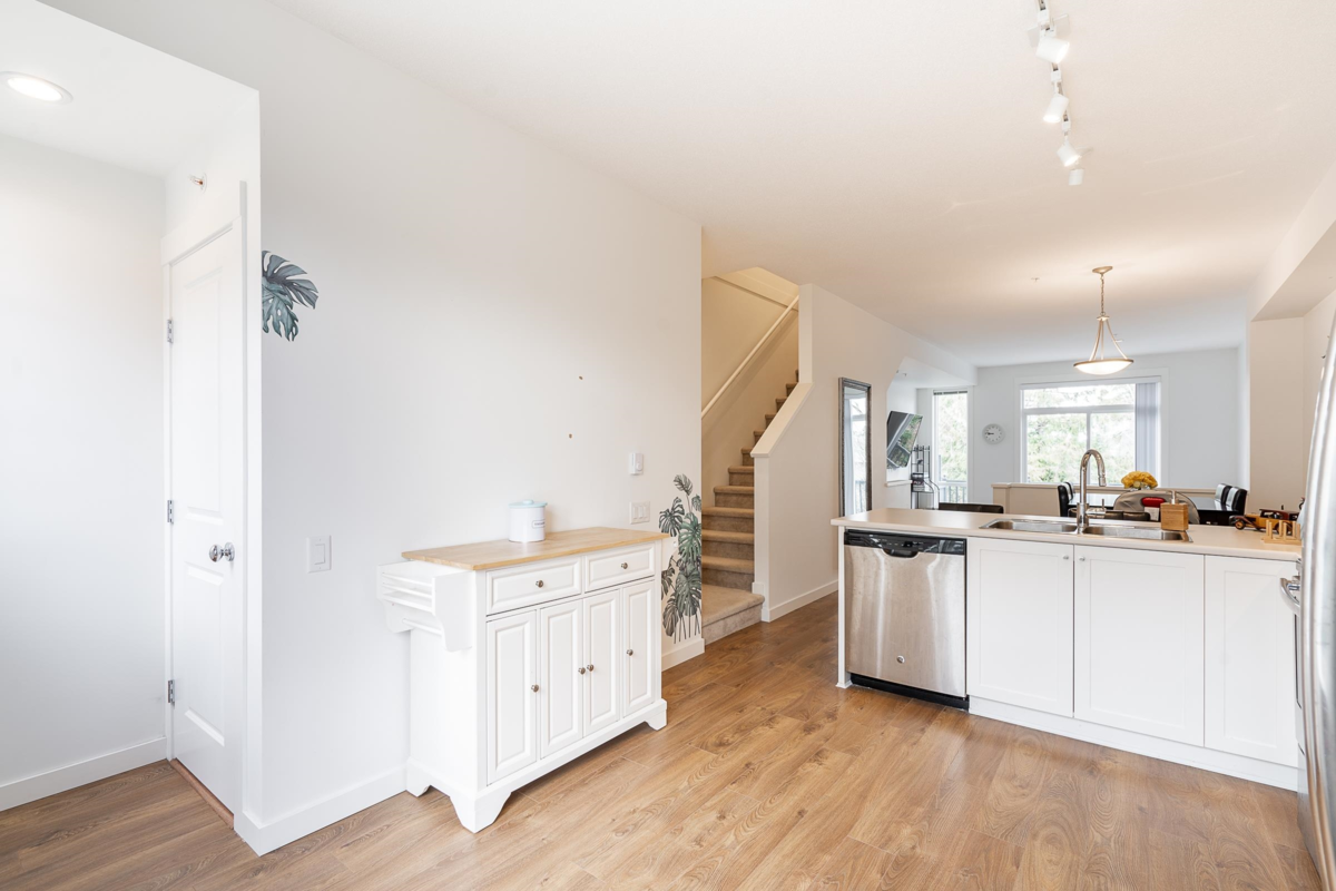 Presenting YORK by Mosaic. Nestled in the tranquil, family-friendly neighbourhood of Willoughby Heights, this expansive 3-bed, 3-bath townhome features a smart open layout featuring a Gourmet kitchen, breakfast bar, ample white cabinets, & S/S appliances. The sunlit living room w/ soaring 10' ceiling & oversized windows, floods the space w/ natural light, complemented by a huge balcony offering stunning MOUNTAIN VIEWS. Upstairs, find a spacious primary bedroom w/ a full ensuite boasting double sinks & a large walk-in closet, alongside 2 well-appointed bedrooms. A tandem garage for 2 cars, w/storage, & an extra parking spot on the pad. Fenced BACKYARD provides an ideal play space for children & pets. Minutes walk to transits, shoppings, schools, parks & everything.