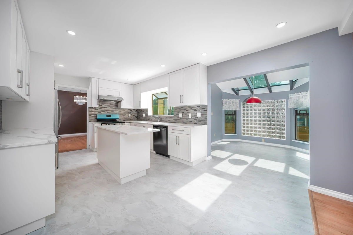 Situated in the most tranquil large cul-de-sac neighbourhood in north Burnaby, level lot with south-facing backyard, and surrounded by tree-lined streets. Walking distance to Skytrain and next to golf course and running/biking trails. Inside, four spacious bedrooms upstairs, with main floor featuring a solarium, sunroom, and office with closet. Brand new renovations on kitchen w/ island, master bedroom ensuite and other bathroom, new flooring in sunroom, newly painted master bedroom, family room, and office, plus new zebra blinds and all window treatments. Maple hardwood floor throughout, with other updates: newer roof, exterior paint, driveway (2019), and new skylight and roof glass for sunroom (2021). Open house on Sat August 2, 2:00 - 4:00.