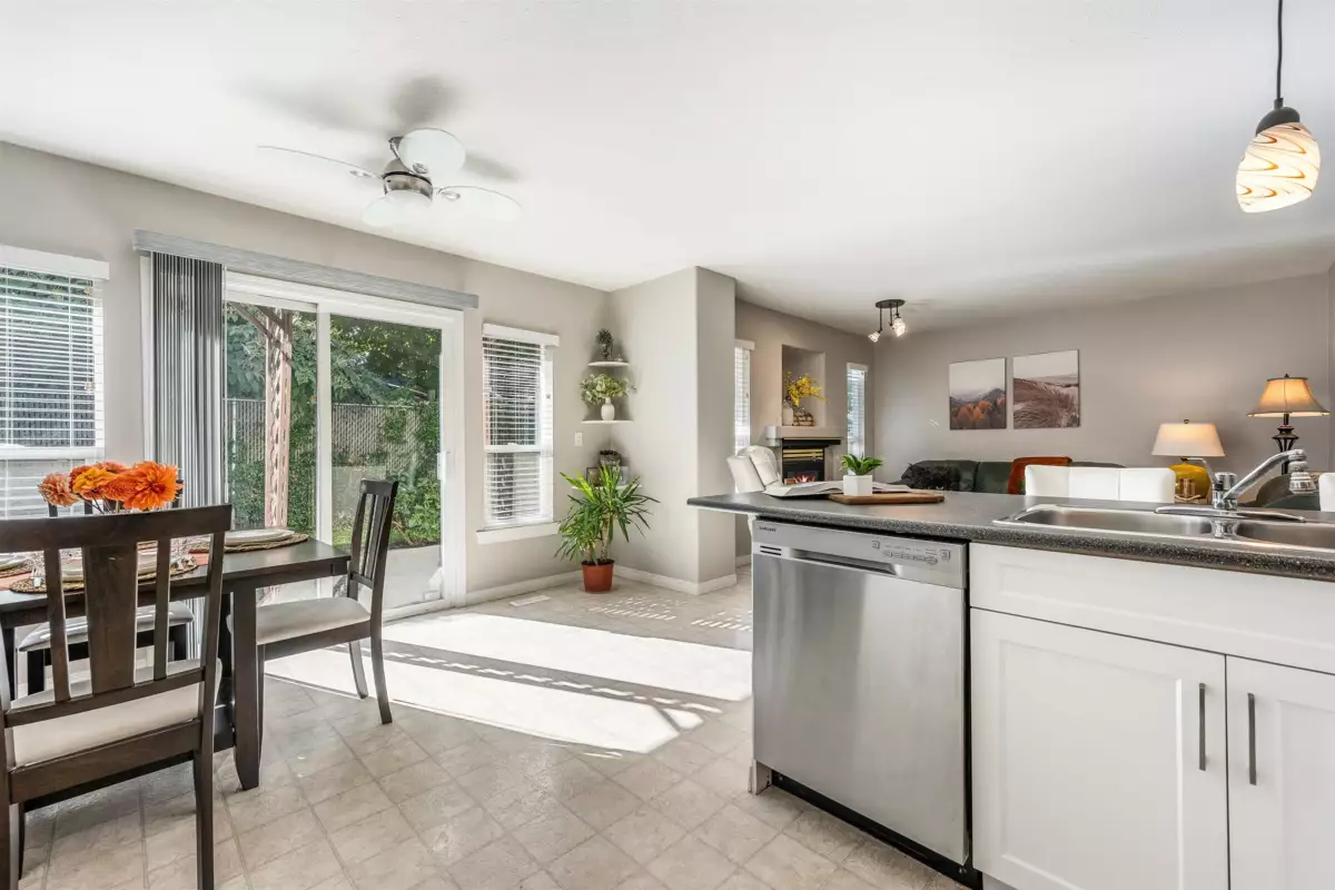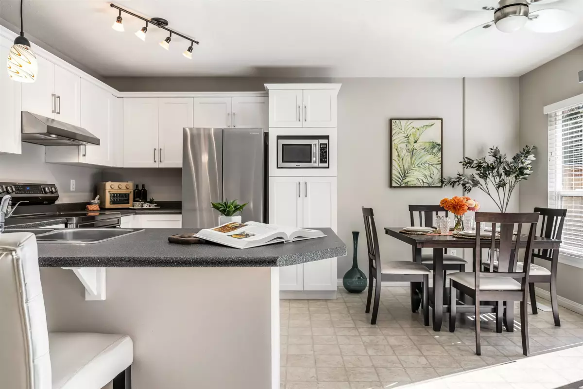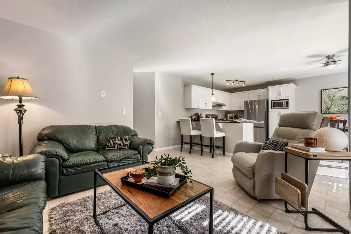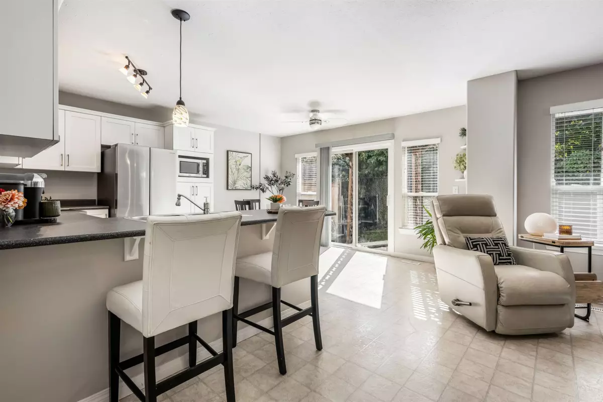 Charming 3 bed, 2 bath townhome in a quiet, family-friendly neighbourhood close to schools, recreation, shopping & transit. Bright open-concept main floor with spacious kitchen featuring newer SS appliances (2022), modern countertops & soft-close cabinets, flowing into the living area with cozy gas f/p. Upstairs boasts a large primary bedroom with ensuite access to a 5pc bath w/dual vanity, plus 2 more bedrooms & laundry. Recent updates: HWT & roof (2022), W/D (2021), dbl garage w/new door. Move-in ready & perfect for families!