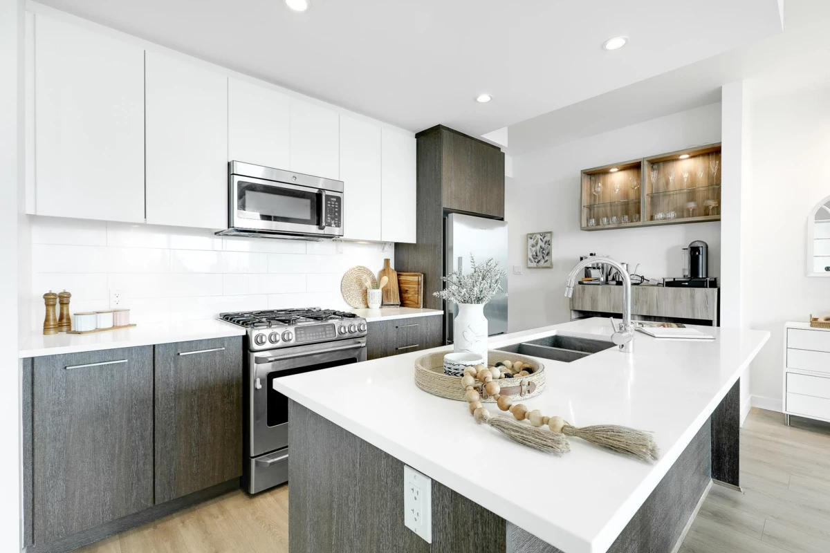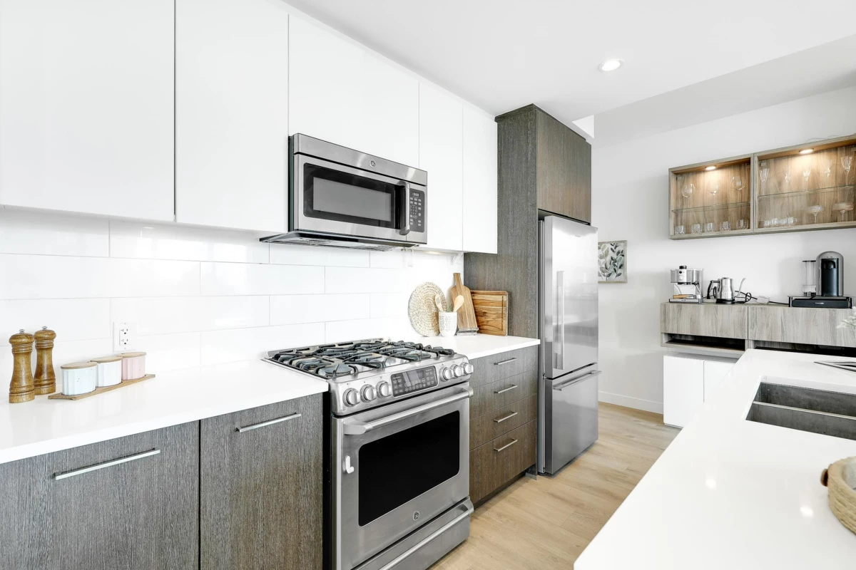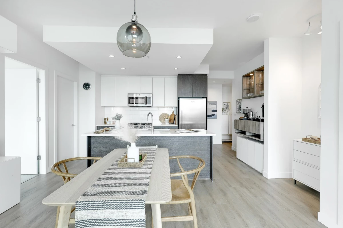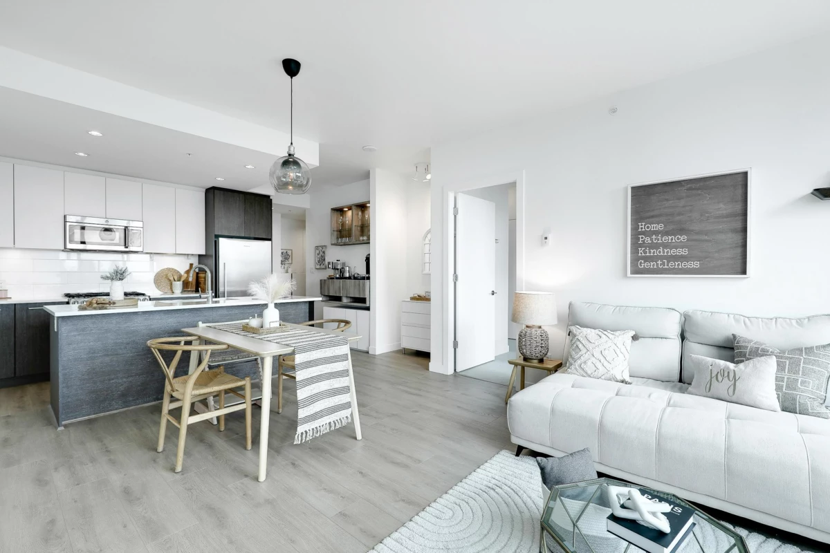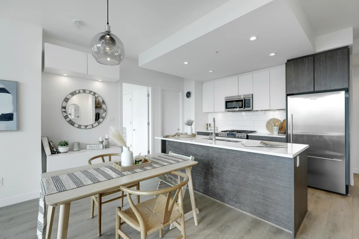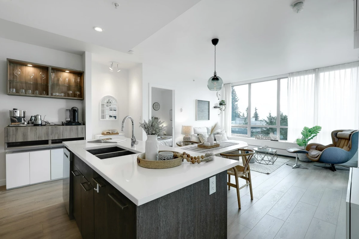 ALTITUDE- SFU's master-planned University District. This bright 3 Bed + 2 Bath + Work station , Southwest CORNER unit has stunning Panoramic Mountain and city Views. NEW laminate flooring (July,2025) in livingroom and kitchen, 9 Ft. ceilings & floor-to-ceiling windows that fill the space with natural light. The two bedrooms are thoughtfully separated by the living/dining area, providing privacy & tranquility, very generous sized. Ample visitor parkings & EV chargers available. Just one block from SFU campus, bus loop, daycare, supermarket, & cafes. Strata fee includes heat , gas and hot water.