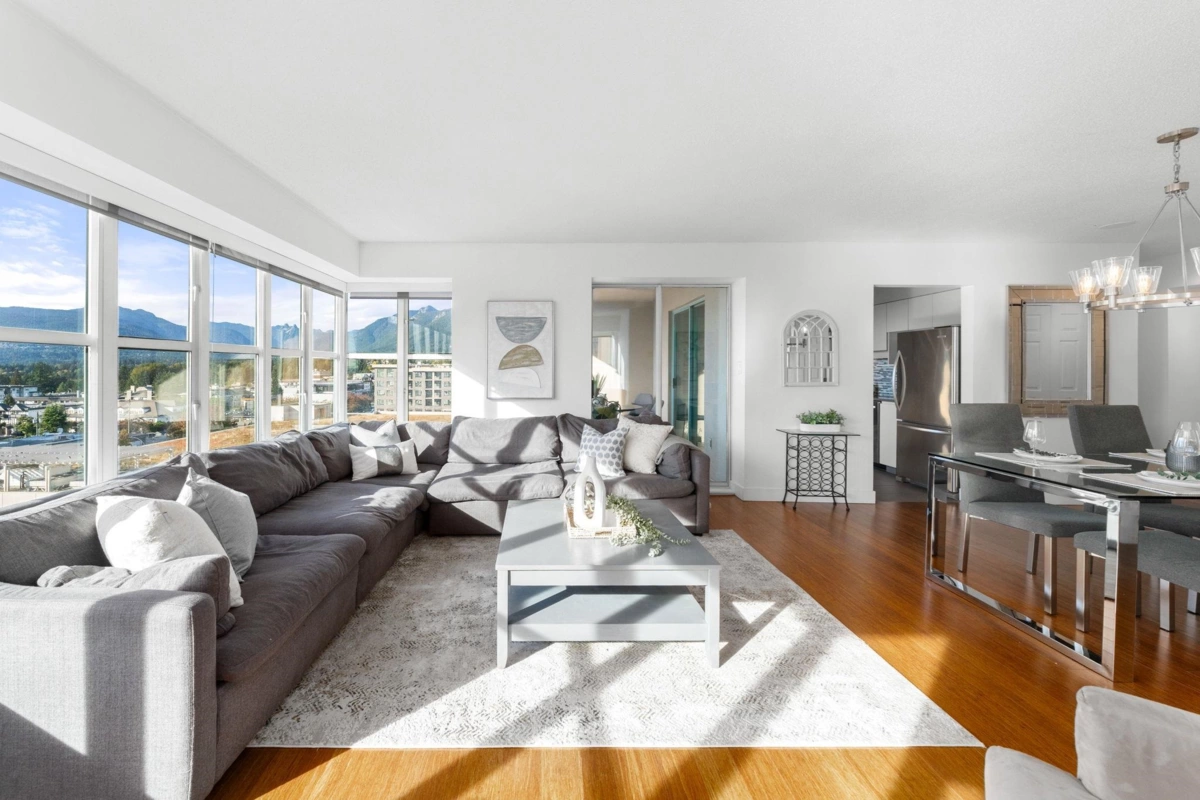 Prime South-West Corner unit. This bright & spacious 2-bedroom, 2-bath southwest-facing home offers nearly 1,000 sq ft of beautiful living space w/ views of the ocean, downtown skyline & Lions Gate Bridge. Located in The Sovereign, a rainscreened concrete building in the heart of Central Lonsdale. Enjoy an open-concept layout w/ generous living & dining areas and a large covered balcony perfect for watching the sunset. The kitchen is equipped w/ stainless steel appliances & plenty of storage. The primary bedroom is generous in size with a 3-piece ensuite. In-suite laundry, 1 secure parking stall & a storage locker. Just steps to parks, Whole Foods, the new Harry Jerome rec centre, restaurants & transit, this home offers incredible lifestyle and value. Open Sunday November 9 2-pm4pm.