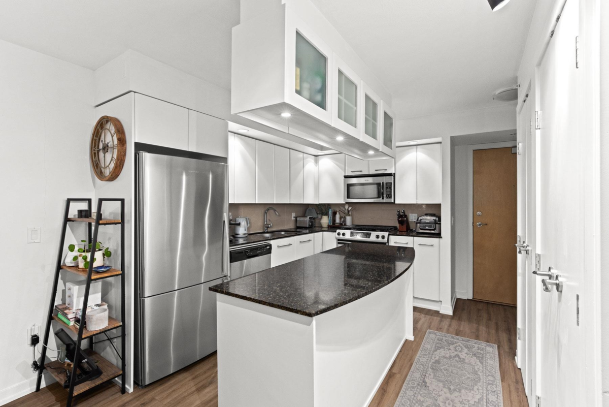 Stunning west facing 1 bedroom view unit at Mira on the park! Excellent floor plan with no wasted space featuring; a large island, ample cabinetry, generous counter space, gas range, new hardwood floors, office nook, and access to bathroom from main area as well as ensuite. Ideally situated on Victoria park - walk to all your favourite spots in Lower and Central Lonsdale while enjoying the calm of this neighbourhood. Comes with 1 parking (EV potential), 2 common EV chargers, 1 storage locker, bike rooms, gym & concierge. This one has it all!