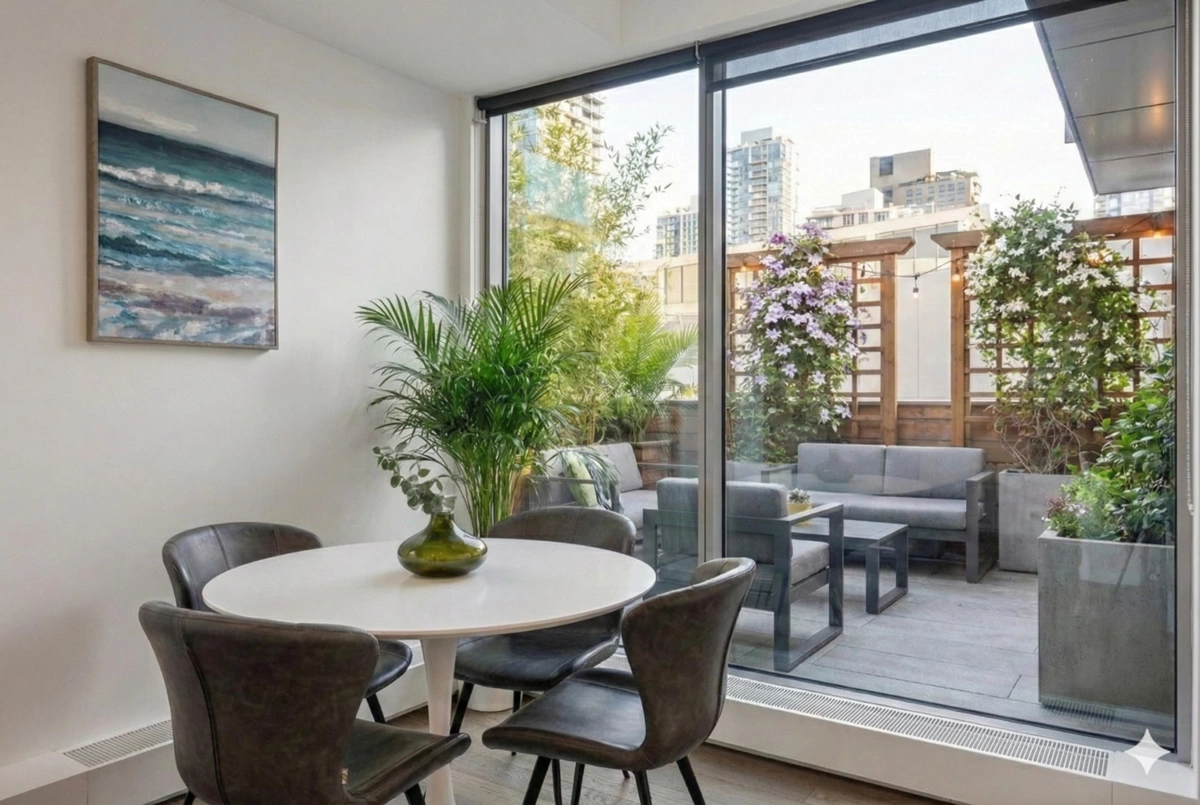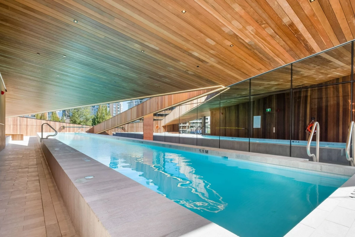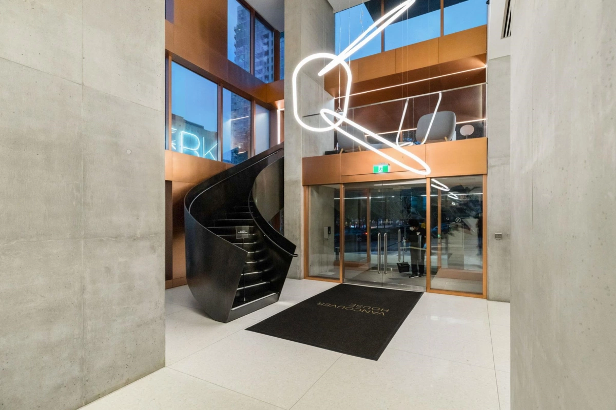 Live in the city's most iconic building- Vancouver House. This oversized 724 sq.ft. 1 BDRM feels like hotel living every day. Featuring a Boffi sleek kitchen with Miele appliances, this unit offers style and functionality. The den is ideal for a home office and the two large patio's (340 sq. ft.) overlooking the tranquil courtyard are perfect for entertaining and gardening. Included is AC, 24hr concierge, and access to the pool and amazing gym. Located near the waterfront paths, beaches and some of the best restaurants, this perfect pied-a-terre or full time residence in one of the most desirable spots.Open House Sunday Feb 01 2-4pm