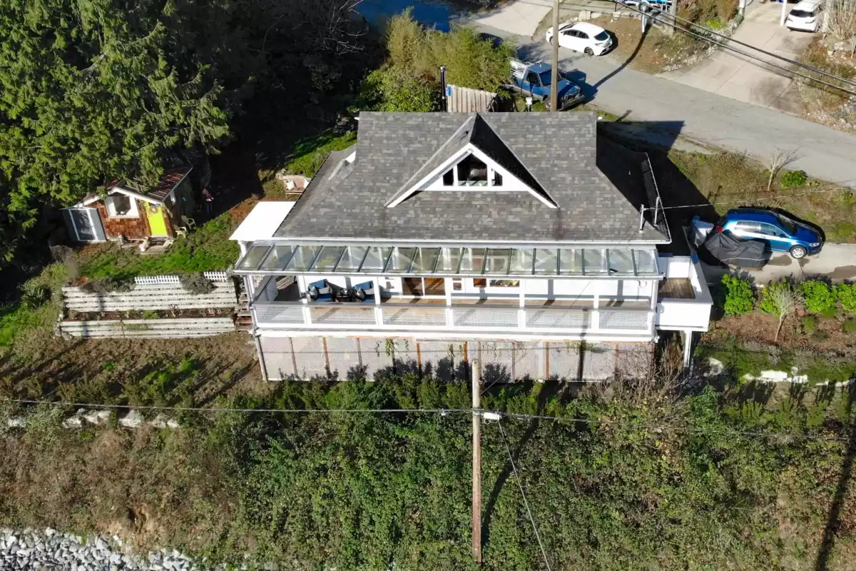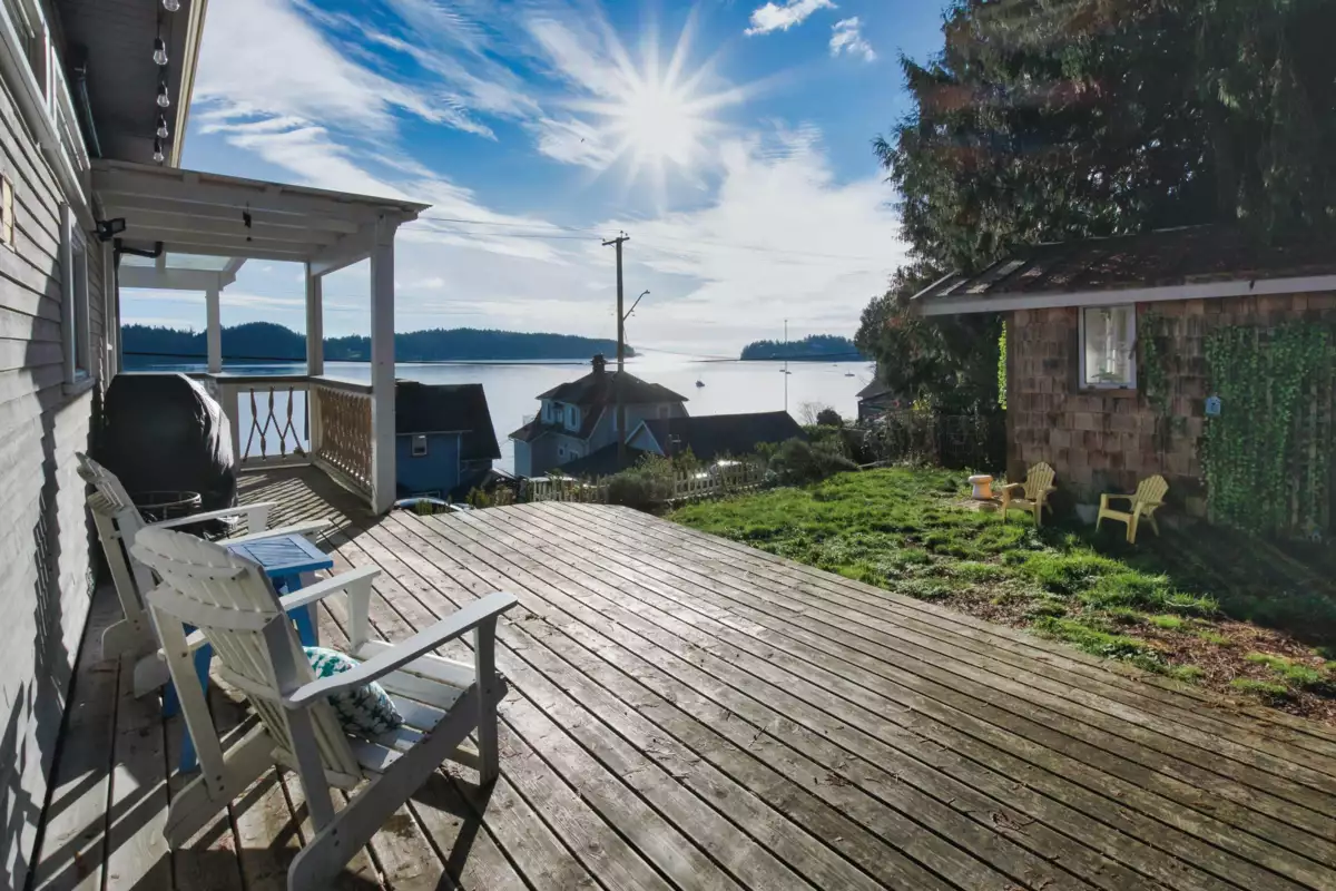 Panoramic Ocean Views in the Heart of Gibsons! This character-filled corner lot home on 7,700 sq. ft. offers stunning views of the ocean and Keats Island. The main floor features 2 bedrooms and bright, open living spaces with hardwood floors, warm wood accents, and a wood-burning fireplace. The kitchen boasts a breakfast bar and stainless steel appliances. Step outside to the covered wraparound patio or serene backyard, perfect for enjoying this coastal paradise. Upstairs, a loft with private patio provides versatile space for an office, guest room, or studio. A detached studio, abundant storage below with separate access, and daily views of passing boats complete this oceanside retreat—just minutes from the ferry terminal and a short stroll to Granthams Wharf and ocean walks.