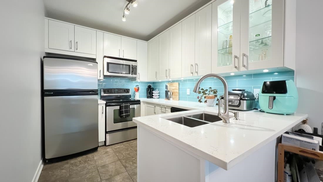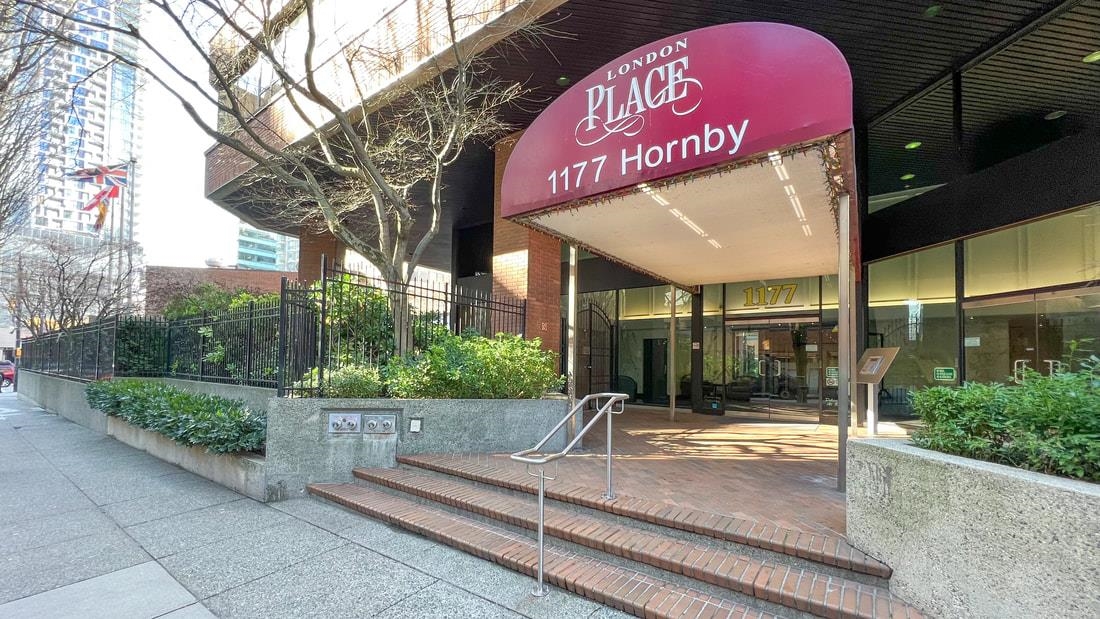 813 - 1177 Hornby St. Vancouver BC V6Z 2E9. This building has a great central location near shopping, transportation and a 10 minute walk to the seawall and Aqua bus to Granville Island Market. Well laid out one bedroom floorplan with a den that could be used as a second (guest) bedroom. Renovated kitchen and bathroom is ready to move in. One parking stall and two storage lockers. Only 12 stories it has 4 elevators in the main lobby. There is commercial grade free/shared laundry located immediately outside your door. Hallways have been renovated along with upgraded elevators and roof. The roof top has a hot tub and great views of the city as well as an enclosed ground level garden/sitting area. Building has a gym and sauna. Cats and dogs are welcome.