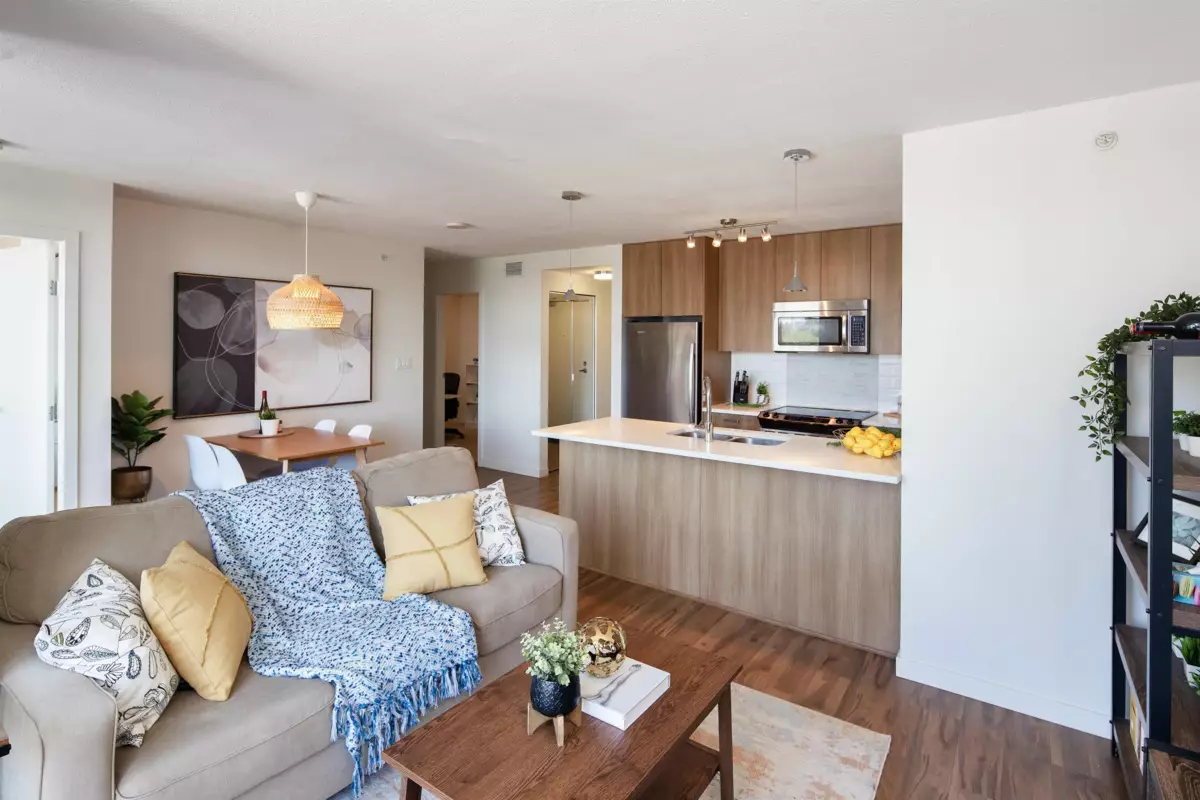 HUGE bright and spacious Jr 2 bedroom home located on quiet side of the building with quite possibly the best floorplan you have ever seen with ZERO WASTED SPACE. With wall to wall windows, your future home features a gourmet chef's kitchen with large island bar, spacious living room and FULL dining room. The spacious master bedroom features ensuite access to the generous sized bathroom which also features a discreet second entrance near the second bedroom. The second bedroom or office easily fits a queen sized bed and features a large closet. Looking out into the quiet courtyard and over neighbouring buildings into a sea of green, it's centrally located in the University District, just minutes walk from shopping at Surrey Central Mall, and the Skytrain!