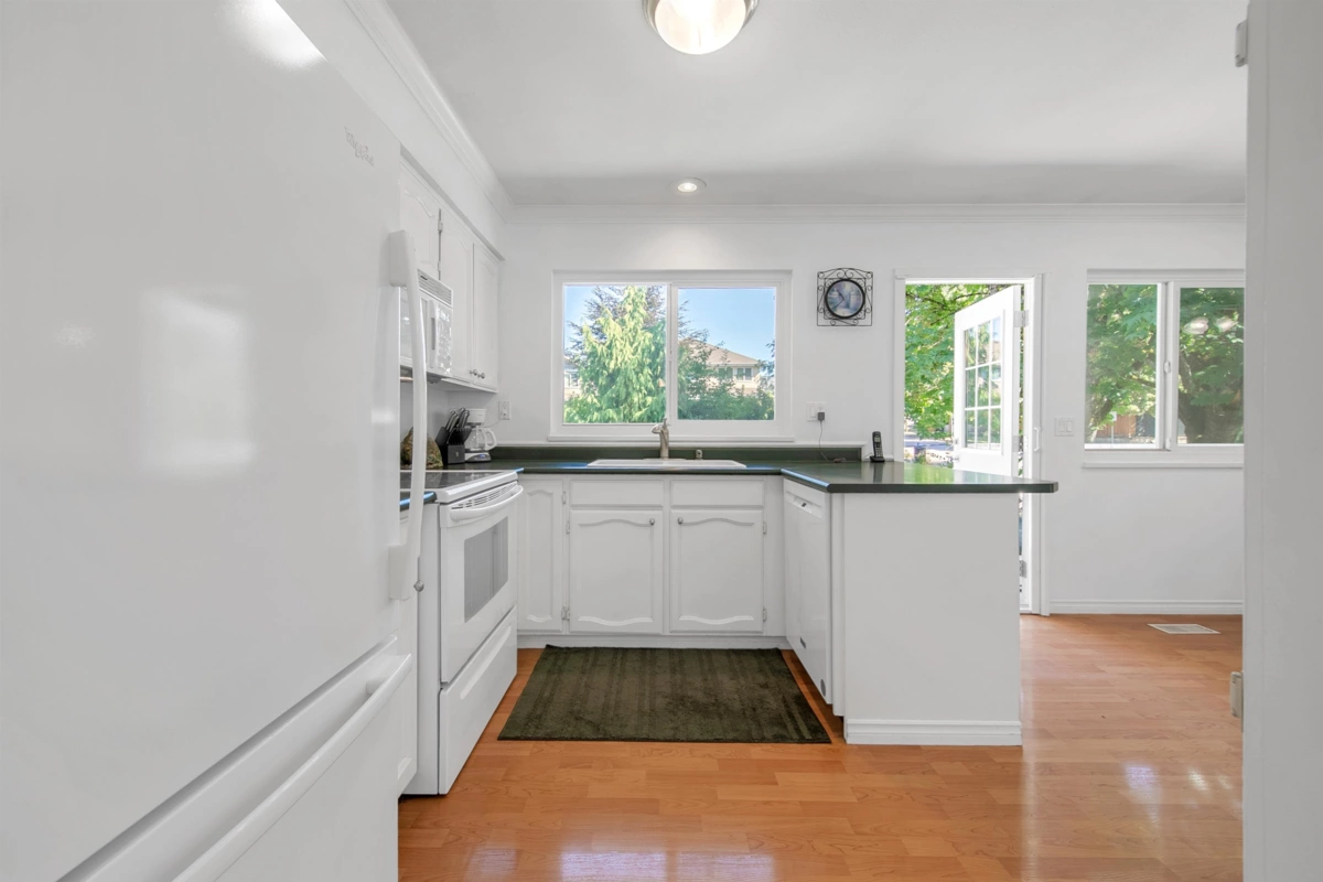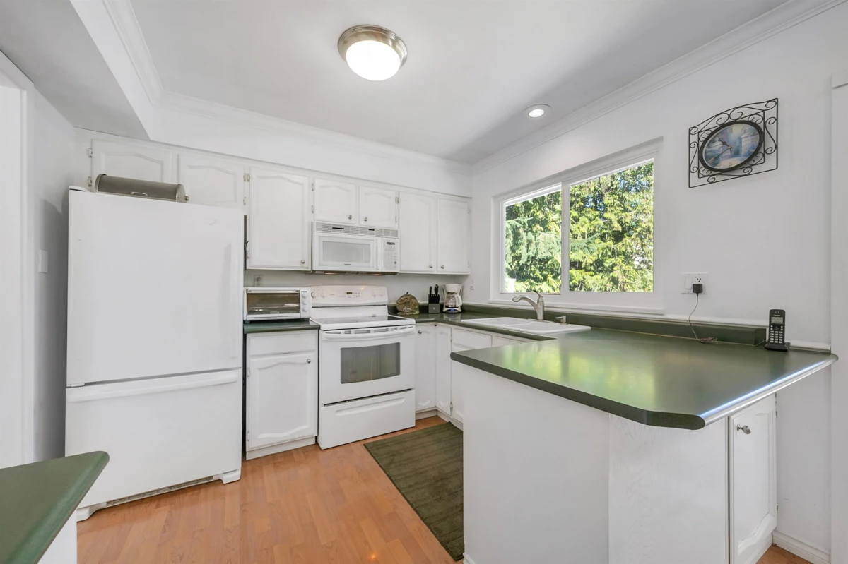 Canterbury Heights - Family or New Build Opportunity. Well-maintained 4-bedroom, 3 bath home on a desirable corner lot backing onto greenspace with a walk/bike path. Main floor offers 3 bedrooms, 1.5 baths, and an open kitchen flowing to a large tiered deck--perfect for family gatherings. Above ground lower level features the 4th bedroom, rec room, full bath, laundry, and workshop/storage with endless potential. Recent updates include windows, flooring, and furnace; roof is 14 years old. Walk to schools, parks, and trails connecting to Burns Bog and Nordel shops. A family-friendly neighbourhood and prime spot for your forever home or a new build.