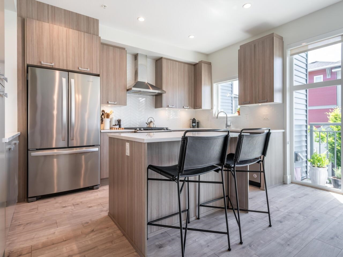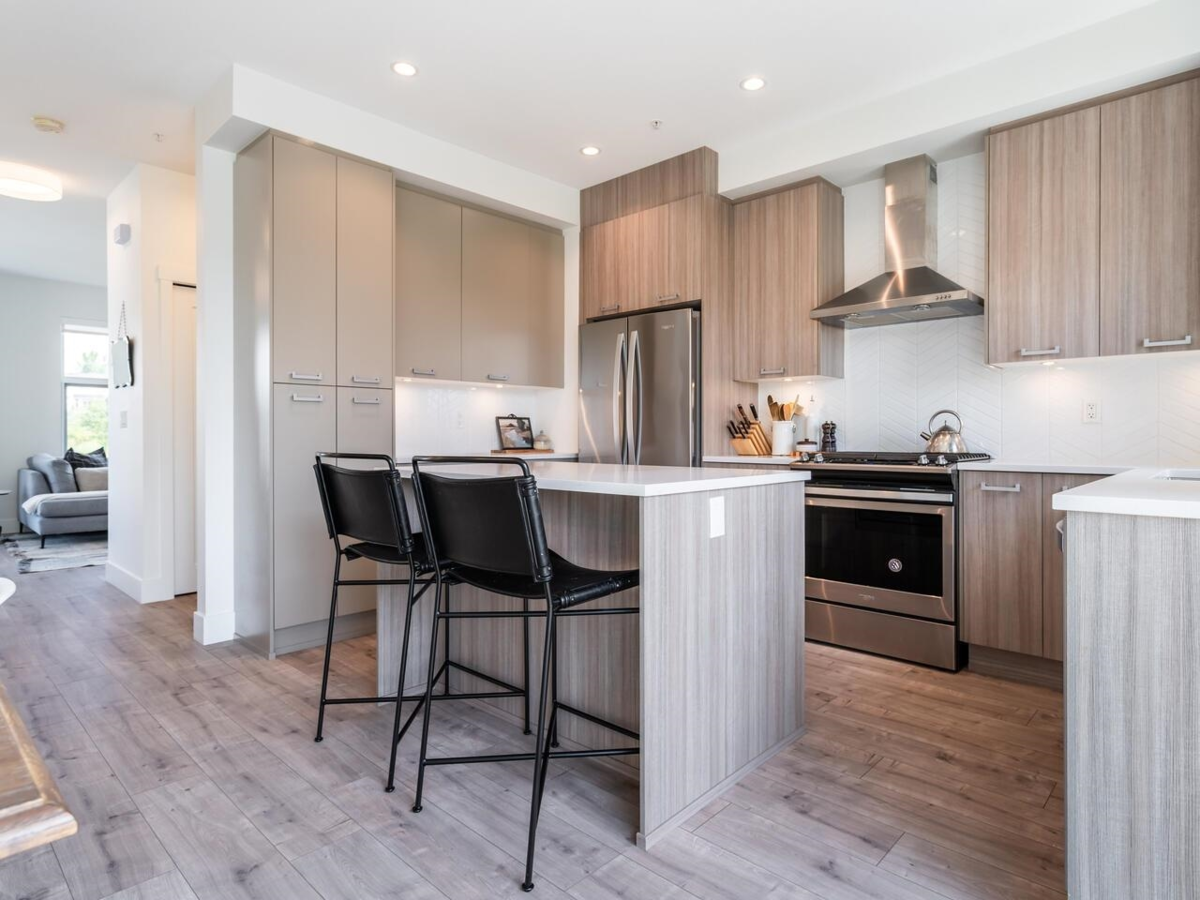 Immaculate end unit home at Creekside with ground-level entry and tiled foyer. Upstairs, wood plank flooring flows through the living room with sliding doors to a sundeck overlooking the fenced yard and green space. The kitchen features stone counters, stainless steel appliances, a herringbone backsplash, and hood fan, plus an island beside the dining area and second balcony. A main floor powder room leads upstairs to a bright primary bedroom with windows on two sides, a walk-in closet, and a stunning en suite with double sinks and glass shower. Two more bedrooms share a full bath with deep soaker tub and adjacent laundry. The lower level offers a fourth bedroom with en suite and direct yard access. Double garage at block's end. 2 dogs/cats or 1 each.