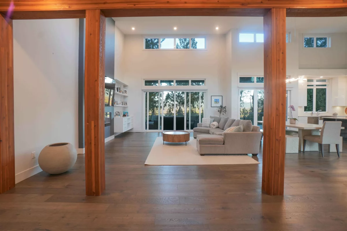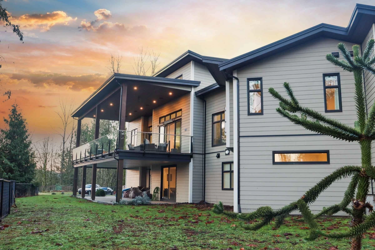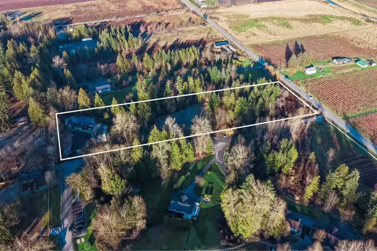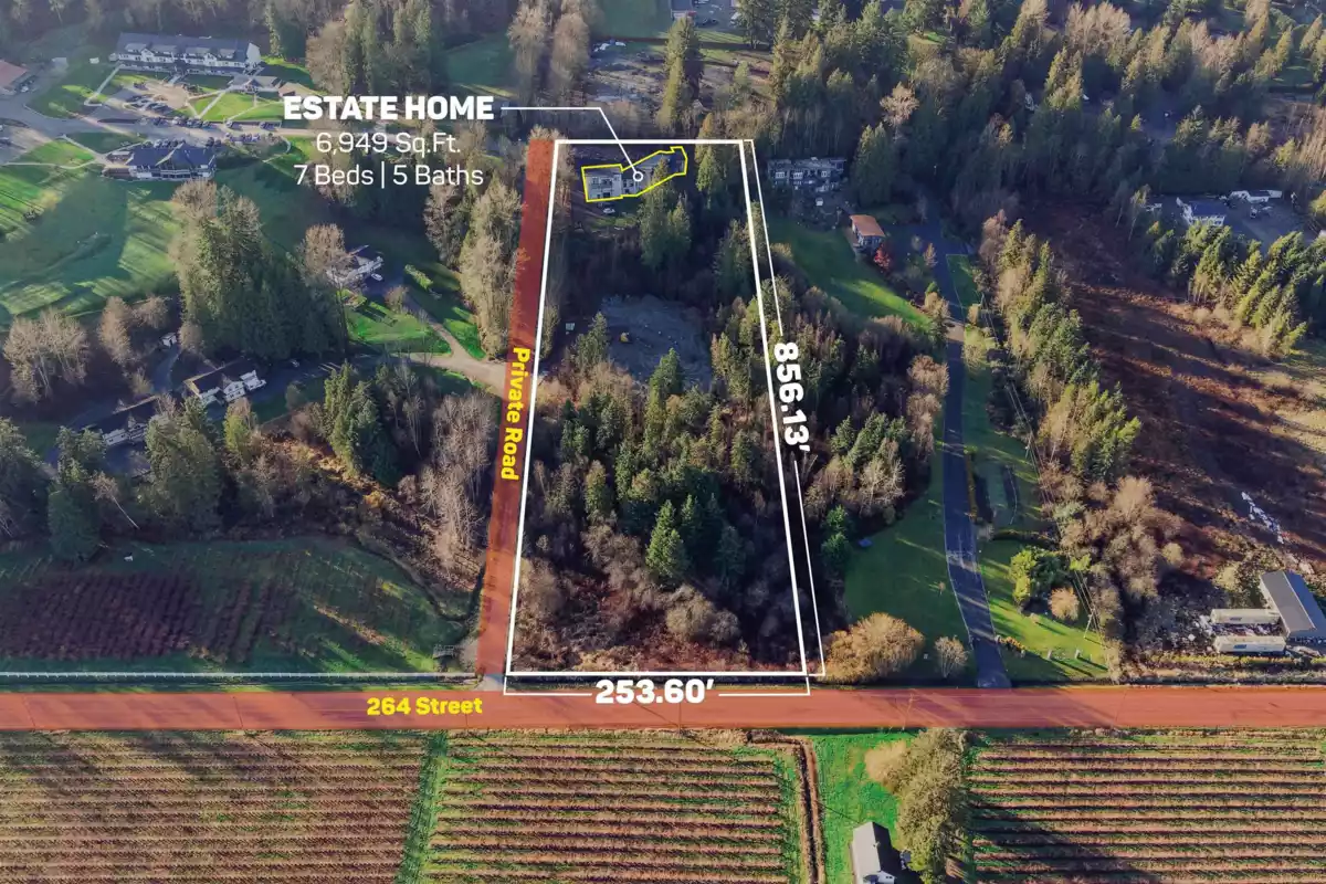 5 ACRES WITH ALMOST 7,000 SQFT ESTATE HOME. A newly paved driveway leads to a 6,949 SQFT custom home with walk-out basement and expansive floor-to-ceiling windows throughout. The home offers 7 Beds / 5 Baths, generous entertaining areas, a media room, private gym with steam room, and a natural gas backup generator. Includes a legal 990 SQFT 2 Bed / 1 Bath suite above the triple garage with separate entry, plus 1,100 SQFT of additional storage space beneath the garage. A large cleared area is ideal for truck parking, equipment storage, or a future accessory building. Set far off the main road behind a private gate, this property delivers exceptional privacy and elevated valley views—just minutes to Highway 1 and Fort Langley.