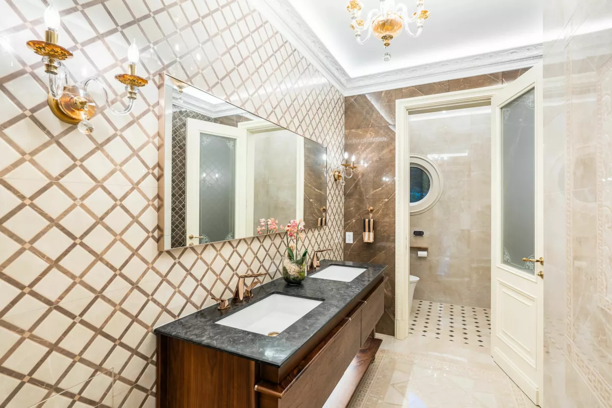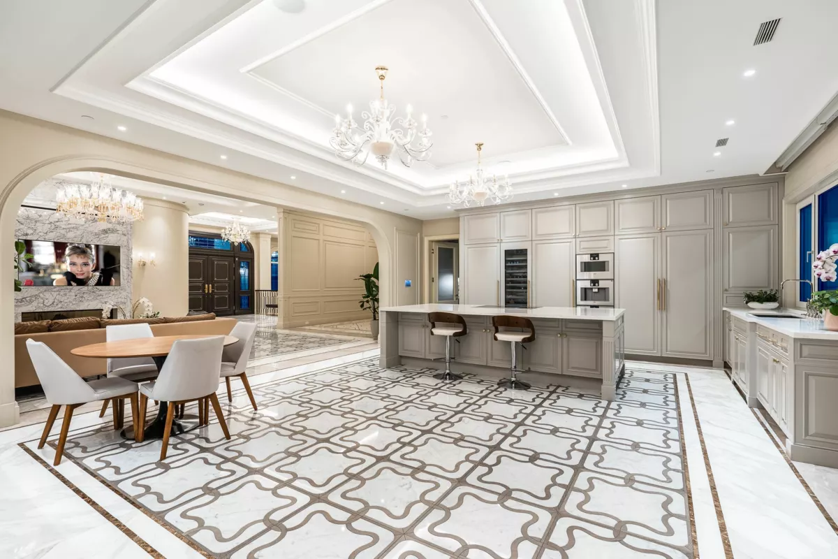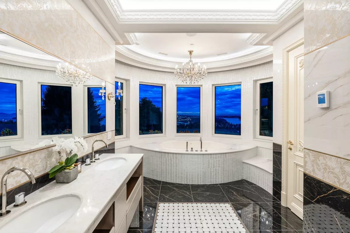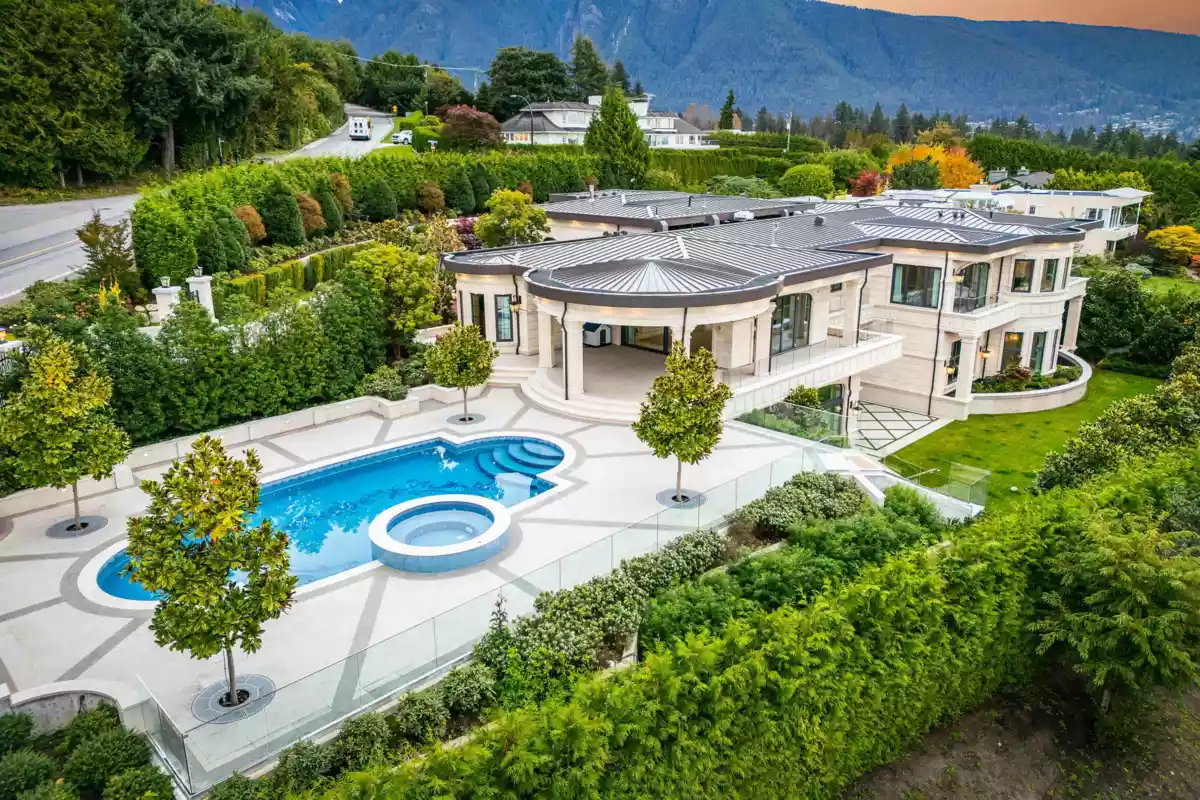 British Properties Estate newly completed, this house situated on a prestigious street, private, views of city & harbour and Lions Gate Bridge. This 12,967 sq ft 2 level home built on a 24,746 square feet level lot. Open floor Plan, gourmet kitchen, 6 oversized ensuited bedrooms w/walk-ins, 11 baths, high ceilings, elevator, Over sized indoor and outdoor swimming pools, sauna, steam room, large level heated driveway, water feature, and 5-car parking, fire pit, park like landscaping designed by Paul Sangha and upscale home theatre! Handmade floors are Calacatta marble with wood inlay and/or metal inlay. Gourmet chef’s kitchen featuring Gaggenau appliances and wok kitchen. This home truly beyond impressive.