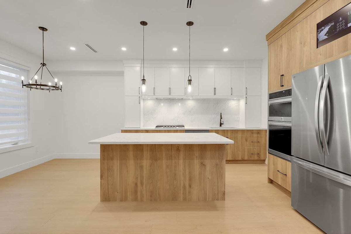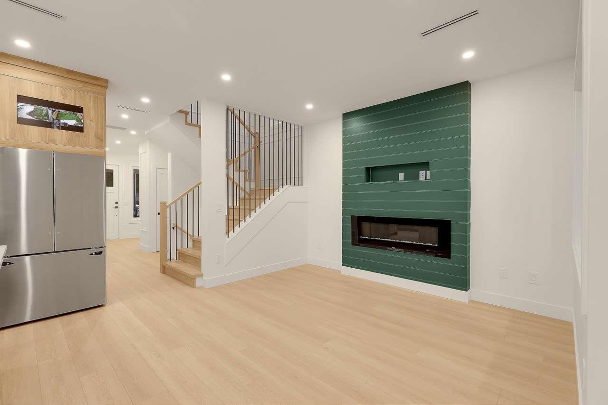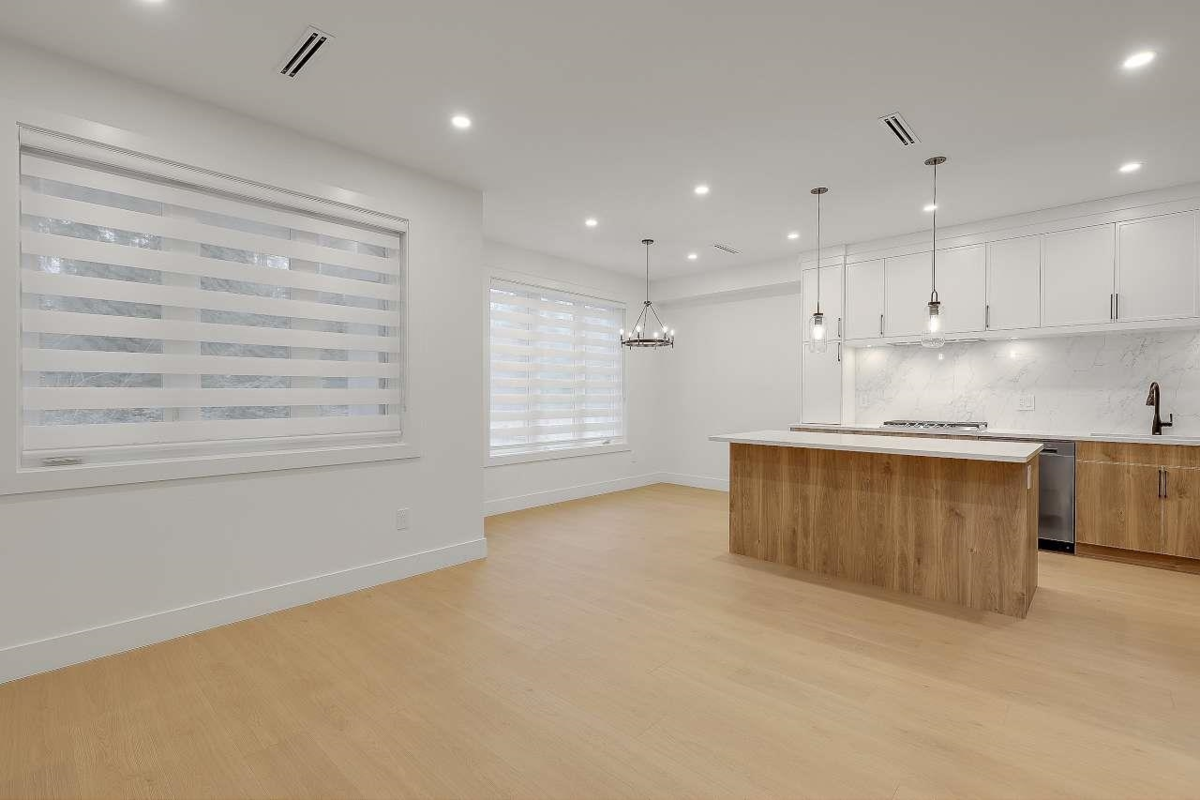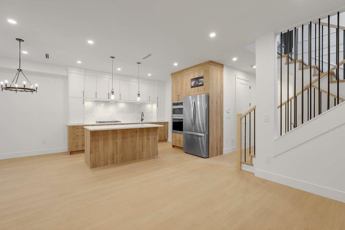 Brand New Duplex in North Delta backing onto private GREEN BELT!! w/ Legal suite and no strata fee! This stunning home w/full AC features 3 (or 4?) spacious bedrooms up , including a master bedroom with a private balcony and gorgeous en—suite. There is an office/formal Ivgrm and generous famroom on the main, and a media room in the basement—ideal for a home theatre: extra living space. The chef's kitchen boasts large island, a separate spice kitchen! ! Finished w/name brand light/plumbing fixtures, designer colors plenty of wall paneling this is the perfect home!