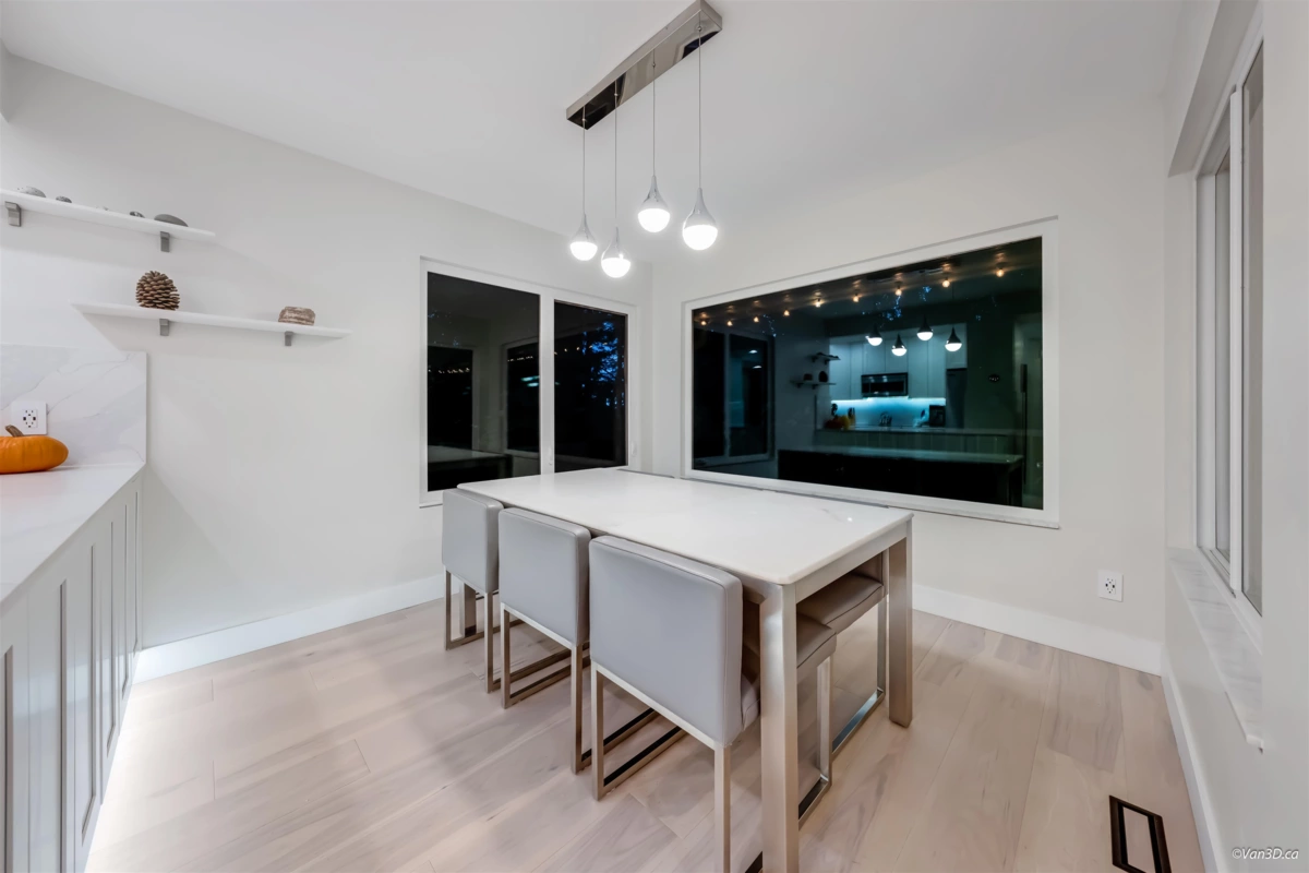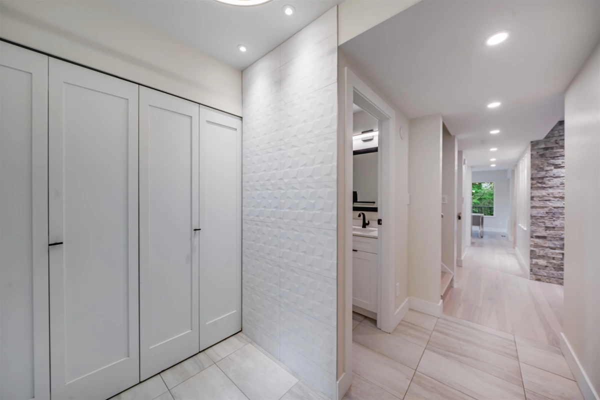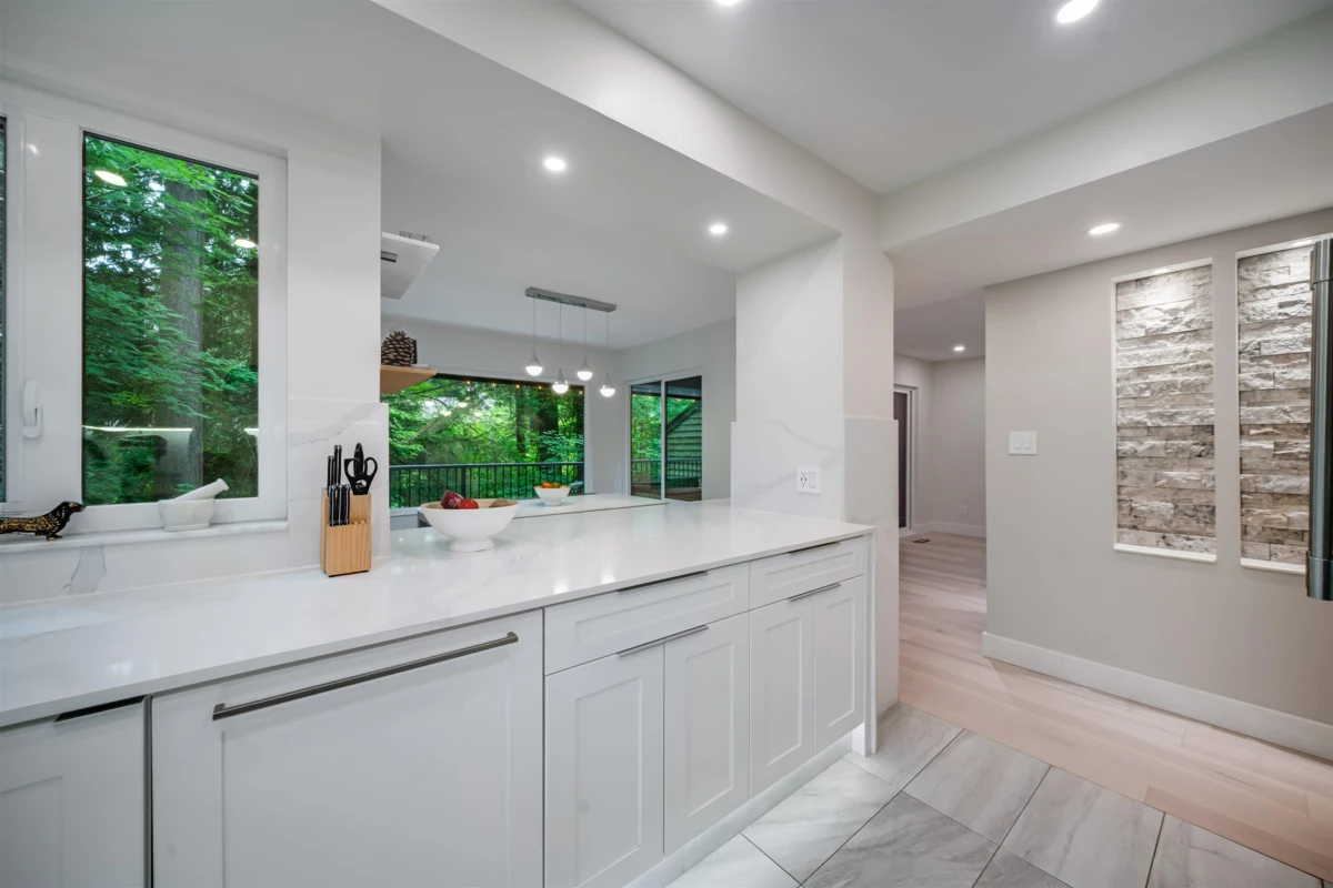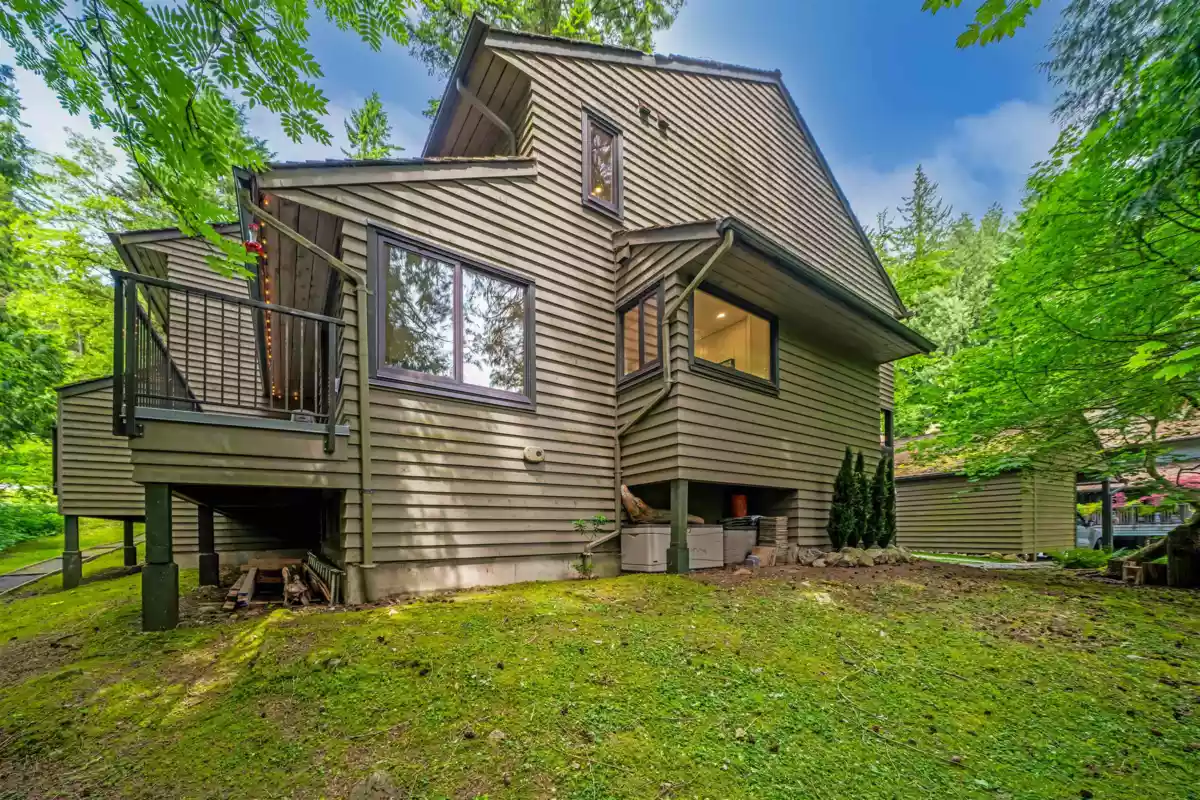 Stunning 3-level, 4-bed, 4-bath end-unit townhome in Lynn Valley’s coveted Laura Lynn complex. Surrounded by forest, this fully renovated home offers elegant West Coast living with 2,430 sqft of bright, functional space. The 2nd level offers a spacious primary bedroom with ensuite bathroom, 2 more bedrooms and shared bathroom. Features and upgrades include new triple-pane windows, gourmet kitchen with quartz counters, wine cooler, large island, 2 gas + 2 electric fireplaces, engineered hardwood floors, built-ins, half bath on main and double carport. Lower level with media room, wet bar, full bath, ideal for guests, entertainment or in-law suite. Covered deck and serene green space. Steps to top schools, parks, trails, pool, tennis and clubhouse.