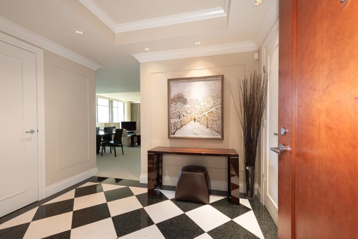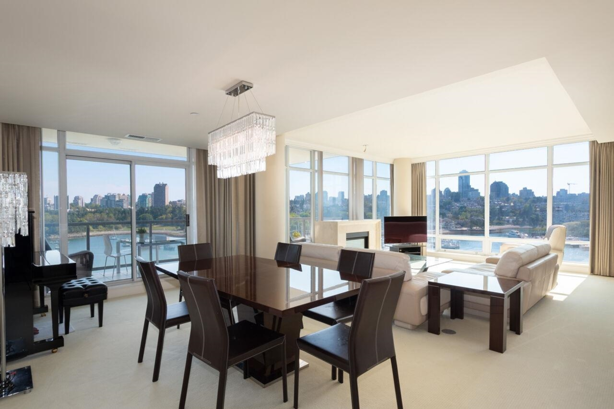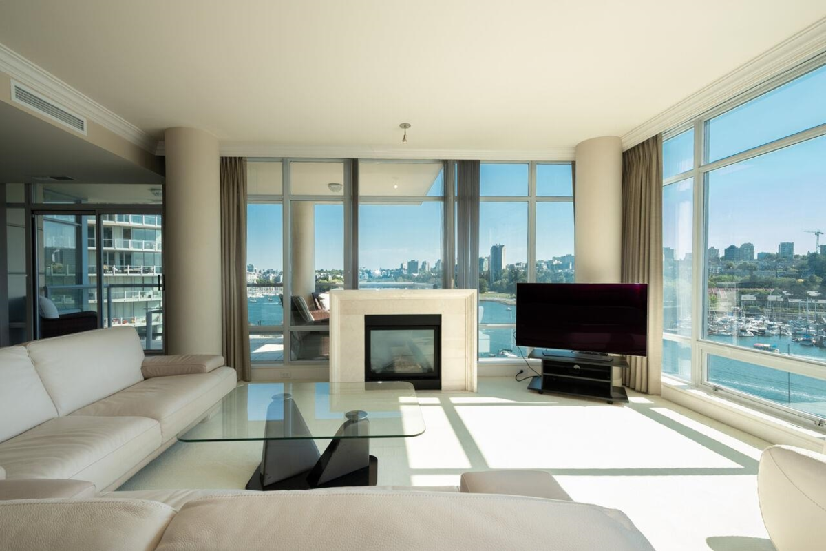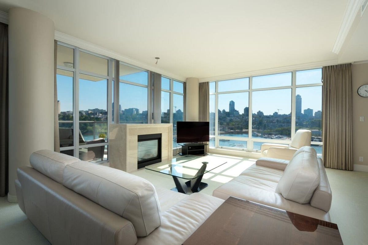 The highly sought after King's Landing by Concord Pacific. This elegant residence offers 3 bdrms all with ensuites, 3.5 baths in total. Huge master with walk in closet, and spacious ensuite. Stunning water views from every room. Large living and dining room, chef friendly kitchen, 9-10 ft ceilings, floor to ceiling windows, wine cooler and pantry, air conditioning, crown mouldings, and a beautiful marble foyer. Enjoy the sweeping view of sunrise and sunset from the large deck. King's Landing offers first class amenities including 24 hour concierge, pool, gym, steam room and theatre. Just steps to the seawall, the shops and restaurants of Yale town. Double and enclosed garage. This exclusive waterfront building has all the best that False Creek/Yale Town has to offer.