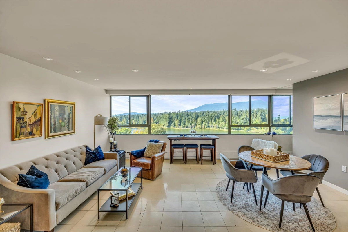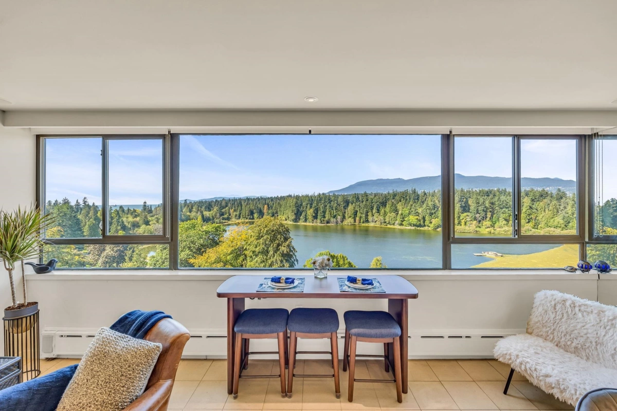 Experience urban living right next to 1,000 acres of lush forest! This top-floor, open-plan 1 BR home delights with truly stunning, unobstructed vistas sweeping over Lost Lagoon, N.S Mnts, and the freighters. Custom millwork throughout, hideaway TV cabinet, ceiling speakers, and art lighting. Perfect for entertaining, the living/dining/kitchen area lets you soak in those breathtaking scenes from every angle. The XL bedroom features built-in drawers and a beautifully finished closet, complemented by a luxurious bath with a heated floor. Step outside to endless recreation: the Seawall, tennis courts, and bike trails. Abundant visitor parking, plus a spectacular roofdeck just upstairs. Includes storage, indoor parking. No pets, no rental, 19+. Easy to show by app.