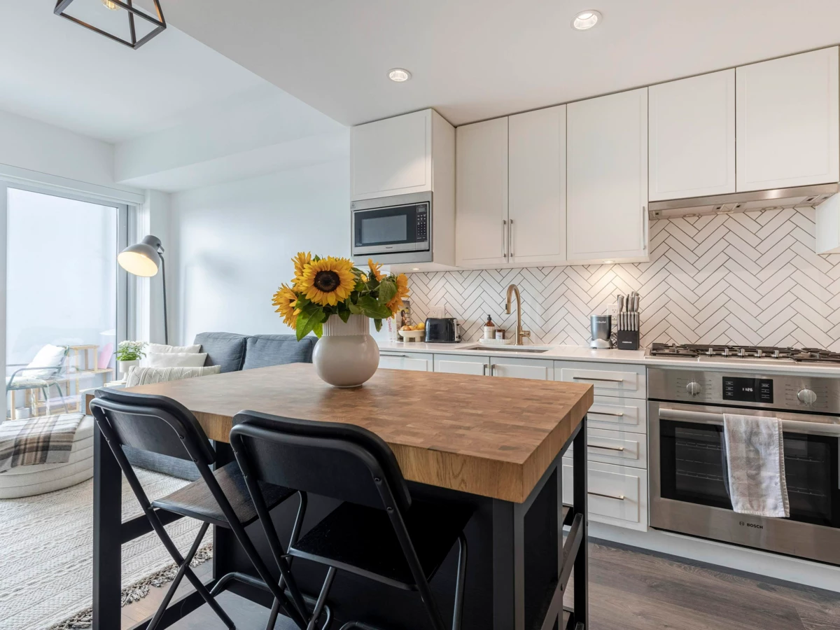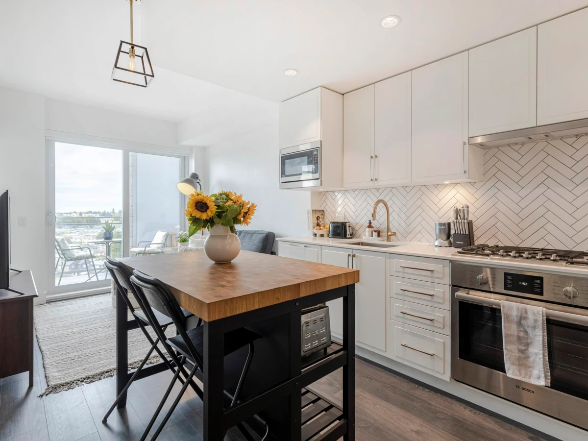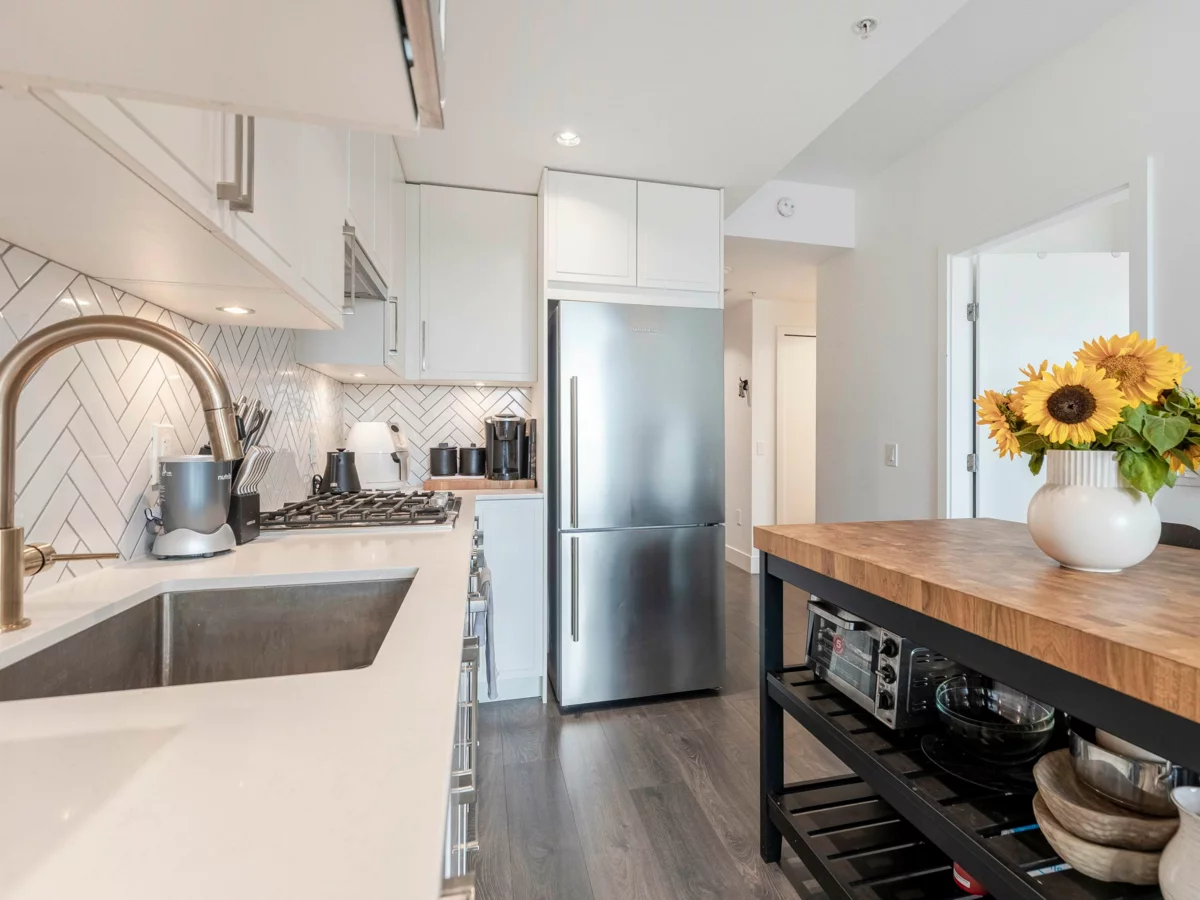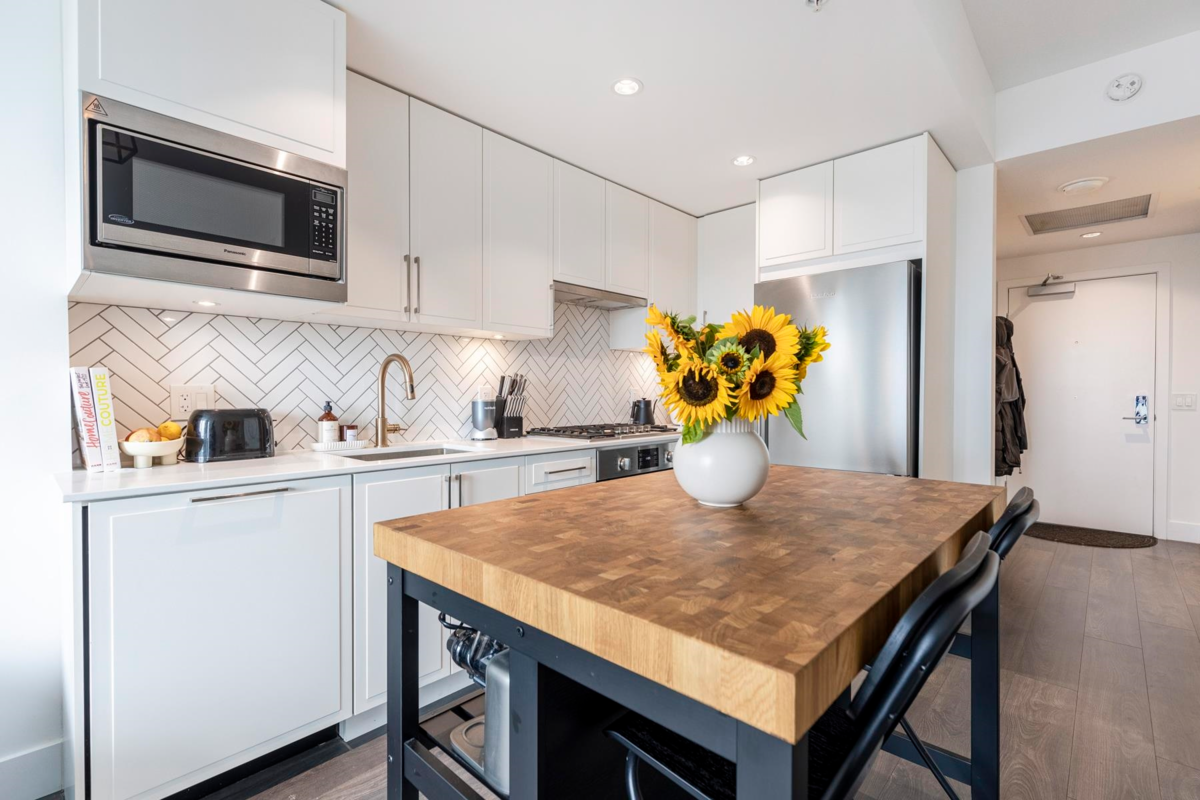 Discover your ideal starter home or investment in the heart of East Van – a junior 2-bed + den in concrete, 2-year-new Windsor, whose layout provides versatility for home office, storage or growth. With AIR-CONDITIONING, high ceilings, plus a fitness center, rooftop garden w/ BBQ, and a party room, you'll enjoy a vibrant lifestyle. This high-floor, SW-facing home offers tranquility and panoramic views through floor-to-ceiling windows. Stylish interior features monochromatic white kitchen w/ herringbone ceramic backsplash, Bosch & Blomberg appliances (5-burner gas stove) & sleek laminate flooring. King-sized primary bedroom offers ample closet space & both bath AND shower. Nanaimo Skytrain, T&T and Shoppers steps away. One parking, pets and rentals welcome.
