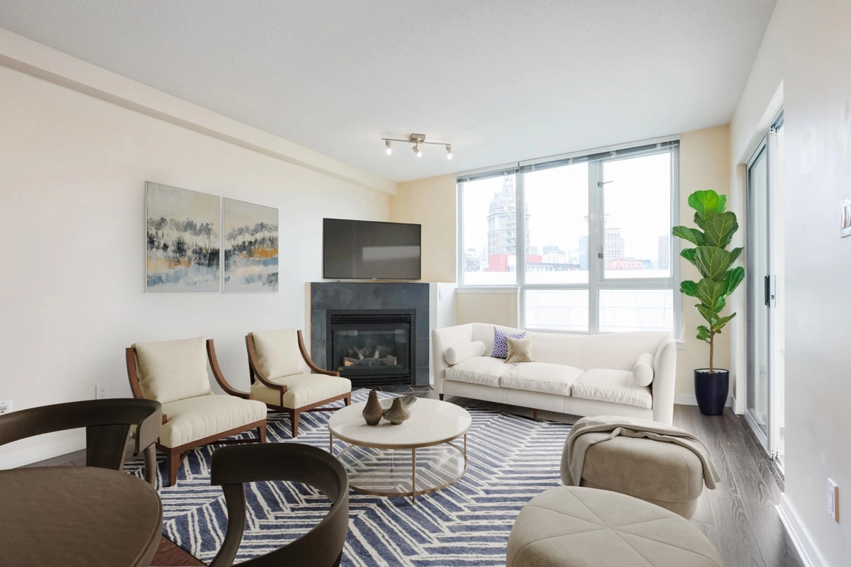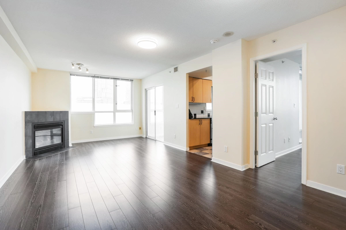 Fabulous & centrally located large 1Bd + Den in Tinseltown's Europa Bldg. This corner "05" unit seldomly comes available w/ the larger 649sqft flr pln. It features an open living space w/ a cozy corner gas fireplace, with the living rm, bedrm and balcony overlooking the courtyard, affording peace and quiet from the bustling location. The large Den suitable as a second bedroom can be flexed for use as a sunroom or office. The bright airiness of the unit due to the ample windows create a larger feel while providing the tranquility through the NS mtn view. Galley kitchen with gas cooktop has shared balcony access from the primary bedroom. Great starter home with Air Conditioning, geothermal heating, 1 Parking stall, 1 storage & 1 bike locker(used as storage). Great amenities & concierge!