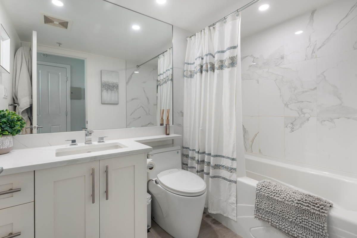 Come home to Gemini 2 by Bosa. This beautifully renovated home offers 2 beds, 2 baths and a huge 192 sf covered balcony boasting spectacular mountain and ocean views and incredible sunsets. Boasting stunning renovations in 2021, including kitchen and both baths, new blinds, closet organizers, barn door for laundry, painted throughout & new laminate flooring in 2025. Fantastic building amenities including gym, sauna, multi purpose room and bike room with peace of mind provided by an on-site caretaker and a very proactive strata. Pets welcome (2 dogs/2 cats or 1 of each). Conveniently located just steps to Highgate Mall and minutes to Metrotown, transit and skytrain. 1 parking, 1 storage (easy to rent 2nd parking). Nothing to do but move in!
