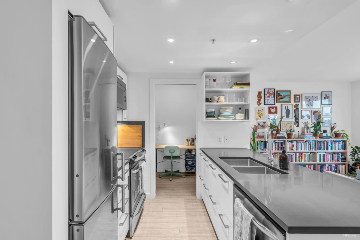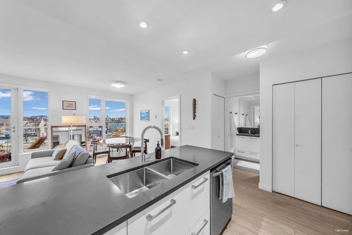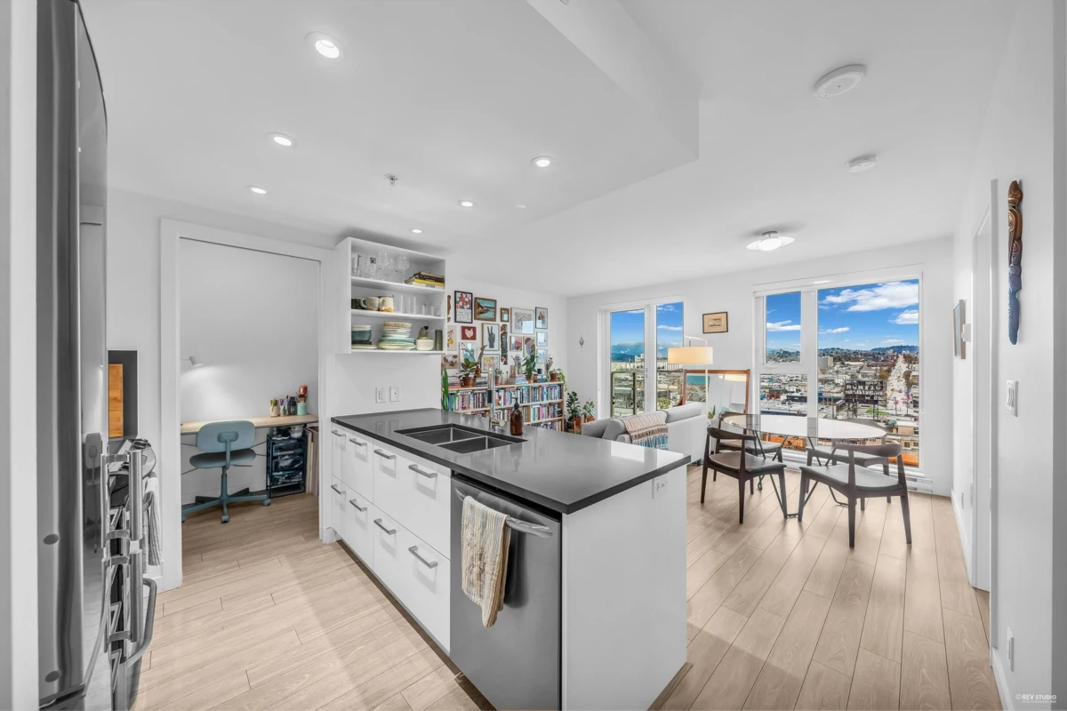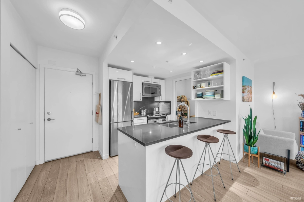 Attention First Time Home Buyers & Investors! This 1 bed & den at the desirable Strathcona Village has one of the most efficient & functional floorplans in the complex. Boasting an open layout with a spacious living & dining area, gourmet kitchen with S/S appliances, generous cupboard & counter space, breakfast bar seating and a large den that can be used as a home office, pantry or storage. Enjoy stunning views of the mountain, water & city from inside or on your private outdoor balcony. Building amenities include 2 fitness centers, meeting/lounge rooms, & a rooftop garden. Centrally located in the vibrant Strathcona neighborhood, close to Commercial Drive, Downtown & many trendy cafes and restaurants at your convenience. 1 parking included. Open House: Sat & Sun, April 6th & 7th 2-4pm.