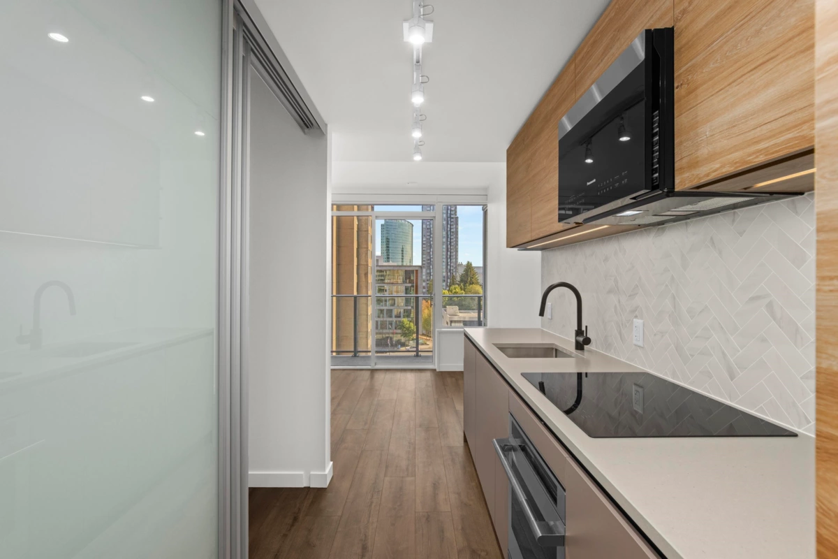 Thoughtful well laid out ""Junior 1 bedroom"" ensures every corner of living space is functional, with 59 sq. foot balcony, A/C and hybrid heat pump system plus 1 storage. *5 Star* amenities including gym, spin room, entertainment and study lounges, children's indoor play area, plus an outdoor swimming pool with spacious patio areas. BOSA built! A Master planned community. Excellent walk and transit score. Steps from top ranking academic institutions SFU and Kwantlen Polytechnic University for all ages. Secured underground parking available for $90 per month.